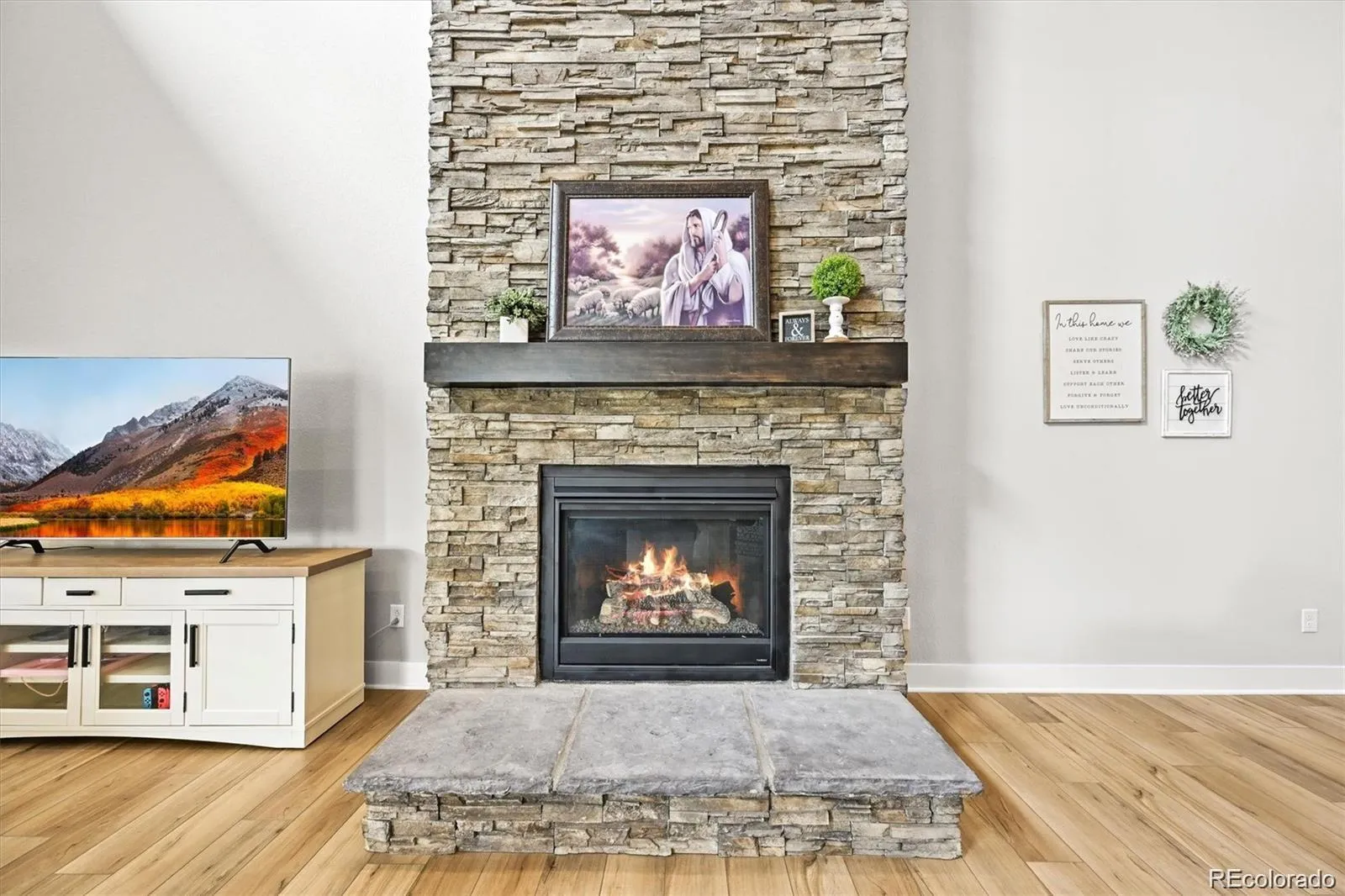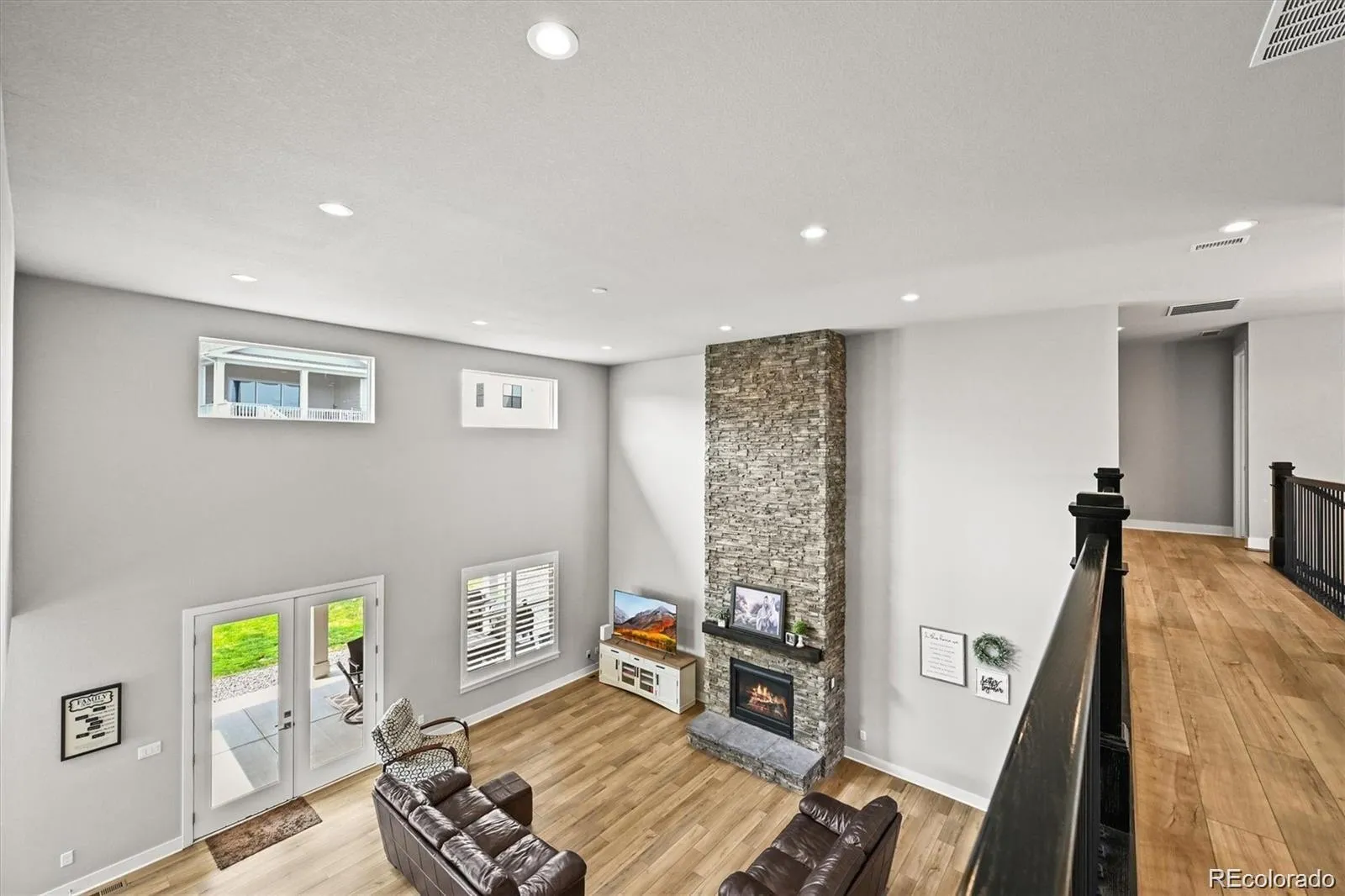 From the moment you enter, a grand two-story foyer welcomes you into a dramatic great room featuring a soaring stone fireplace, rod iron accents, and upgraded LVP flooring—all illuminated by statement light fixtures that make an unforgettable first impression.