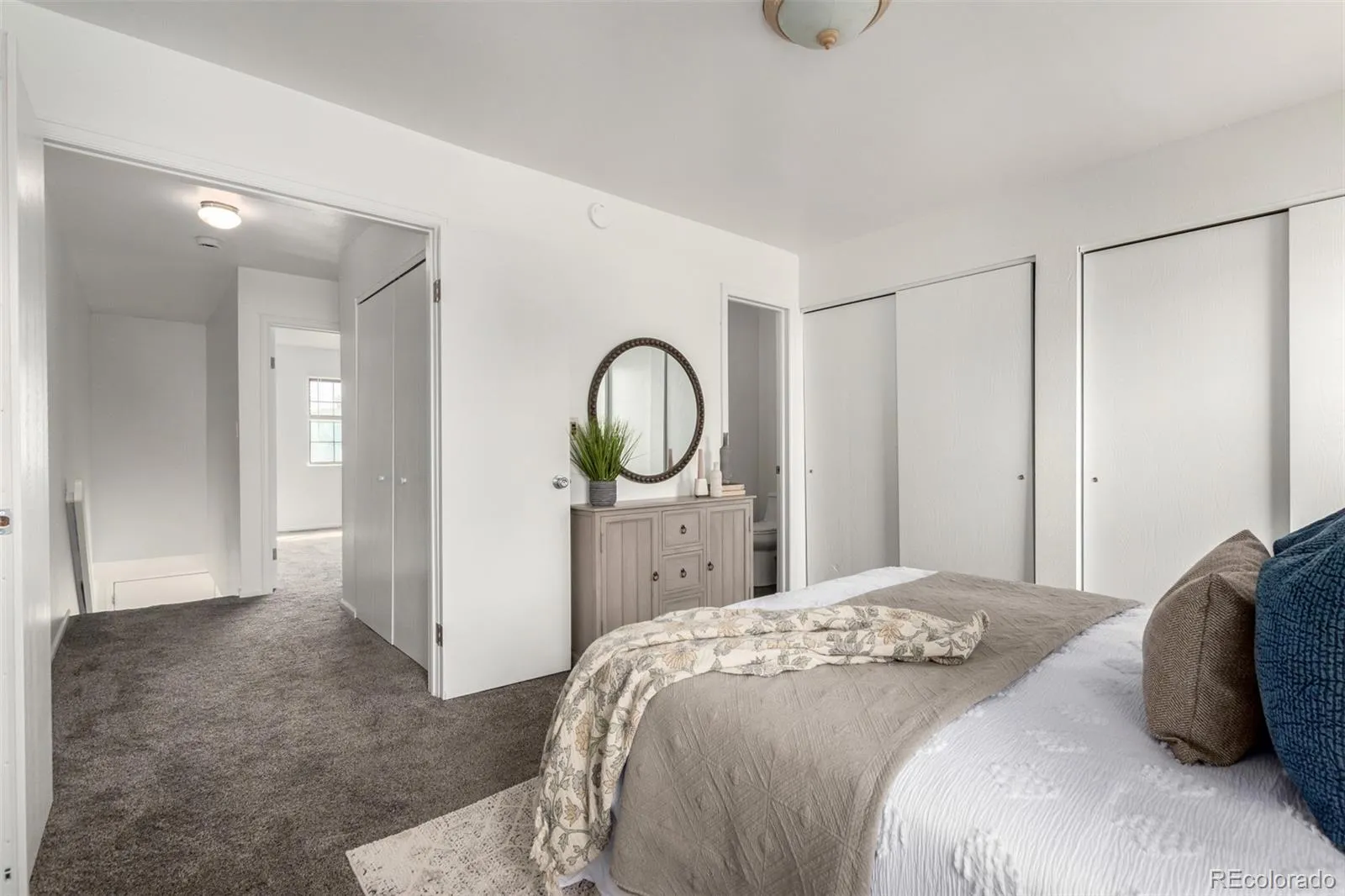 Upstairs, two spacious bedrooms share a convenient Jack-and-Jill full bathroom. The primary bedroom boasts two full-sized closets. The laundry area, complete with a full-size washer and dryer, is conveniently located between the bedrooms for easy access. Two dedicated parking spaces are directly in front of the entrance, so you’ll always have a spot.