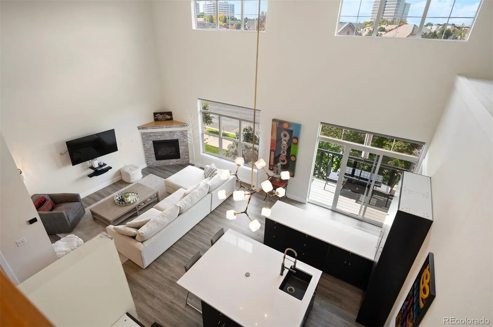 OPEN, LIGHT, SPACIOUS & PRIVATE CORNER PENTHOUSE UNIT with MOUNTAIN VIEWS, Vaulted Ceilings and Open Floor Plan. Ideal top floor unit with Large West Facing Windows, Balcony & GORGEOUS SUNSETS. RARE living and entertaining experience with lock & leave convenience. Contemporary living area with wall mounted widescreen tv and gas fireplace that open to the balcony and kitchen. Recently renovated, the kitchen includes a large central island with hidden-pop up electric/usb tower, side extension-bar, white quartz countertops, stainless steel appliances, and ample storage. The large, main floor primary suite has an Ensuite Full Bath with Granite Countertops, Walk in Closet + Secondary Built In Wall Closet System and Chandelier. Off the main entrance is an Office Area with built in storage, a ¾ Bath, and a mud-utility room with new washer, dryer and HVAC System all installed in 2023! A spiral staircase leads to the top level with a 2nd office-hobby-yoga area, full bathroom, and a second bedroom. Enjoy the Pool & Jacuzzi that will be opening soon, along with club house and fitness center year-round. All NEW in 2023: Lennox Furnace & AC System, Samsung Washer and Dryer, Hot Water Heater, and Wall-Mounted Wide Screen TV with sound bar. NEW ROOF in 2025!