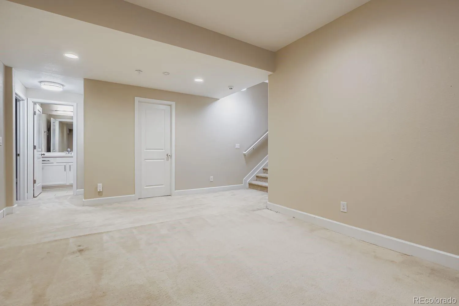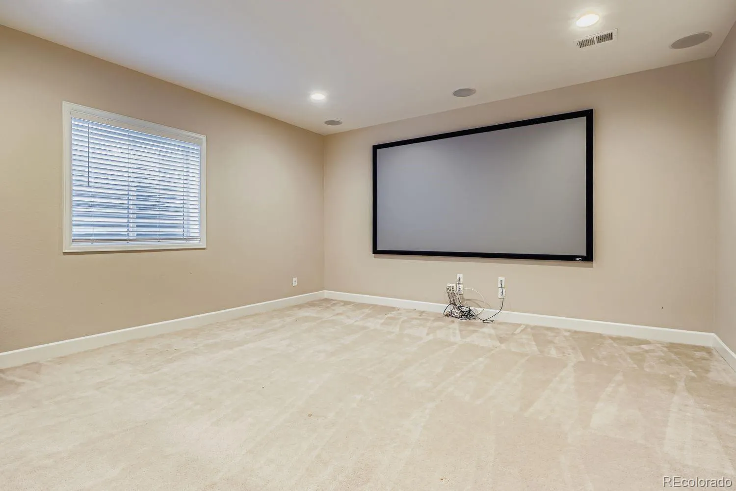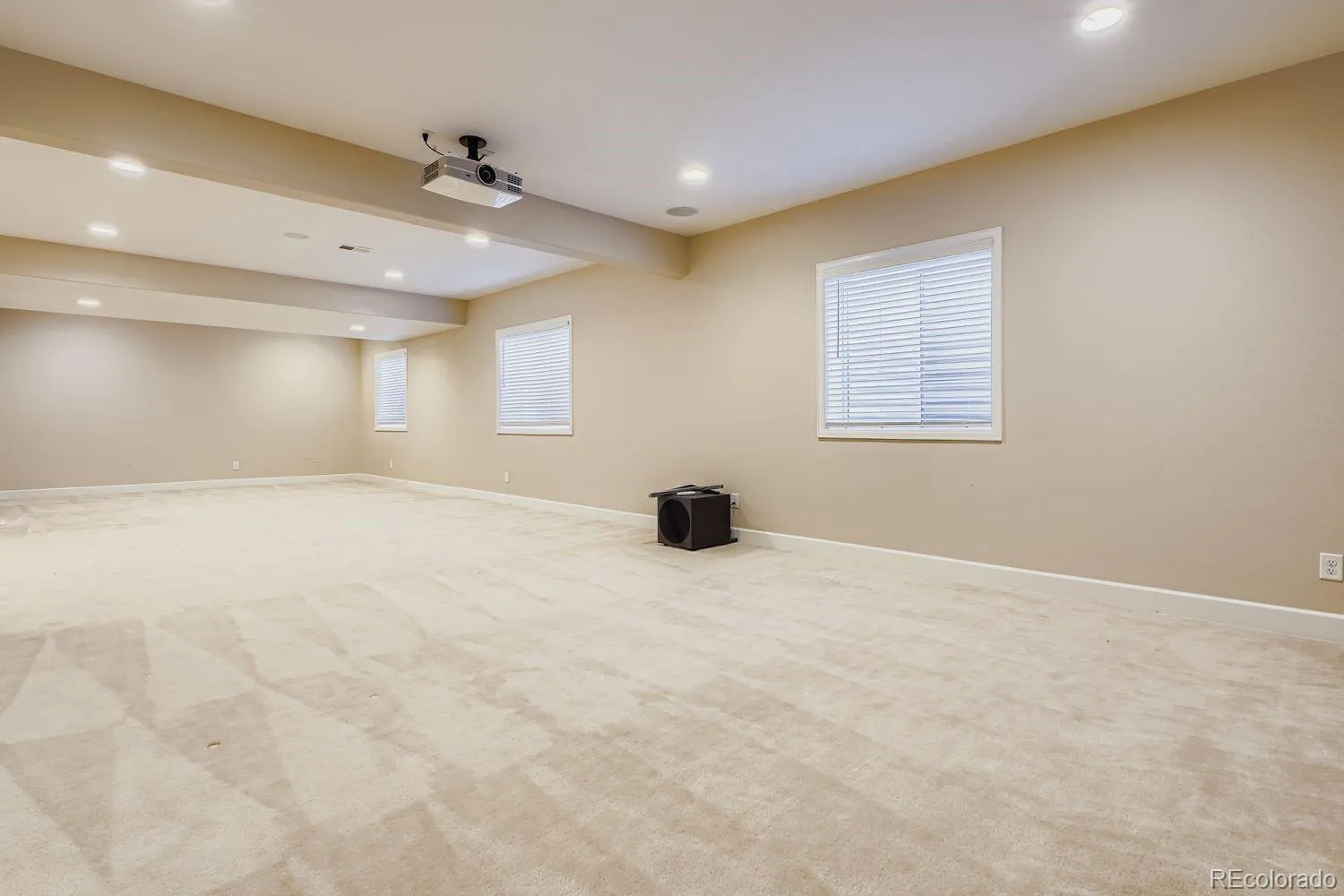 The finished basement is an entertainer’s dream, complete with a built-in projector and surround sound system — all included with the home.