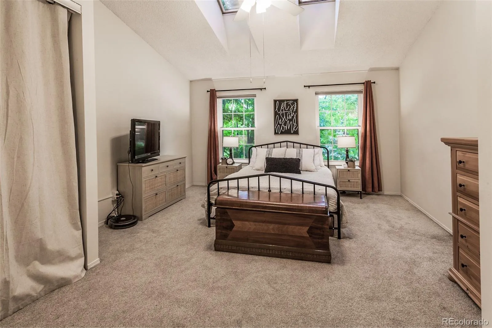 Upstairs, the spacious primary bedroom boasts two skylights, two closets, and a ceiling fan. It shares access to a full bathroom with a Corian vanity top. Another bedroom is also located on this same level.