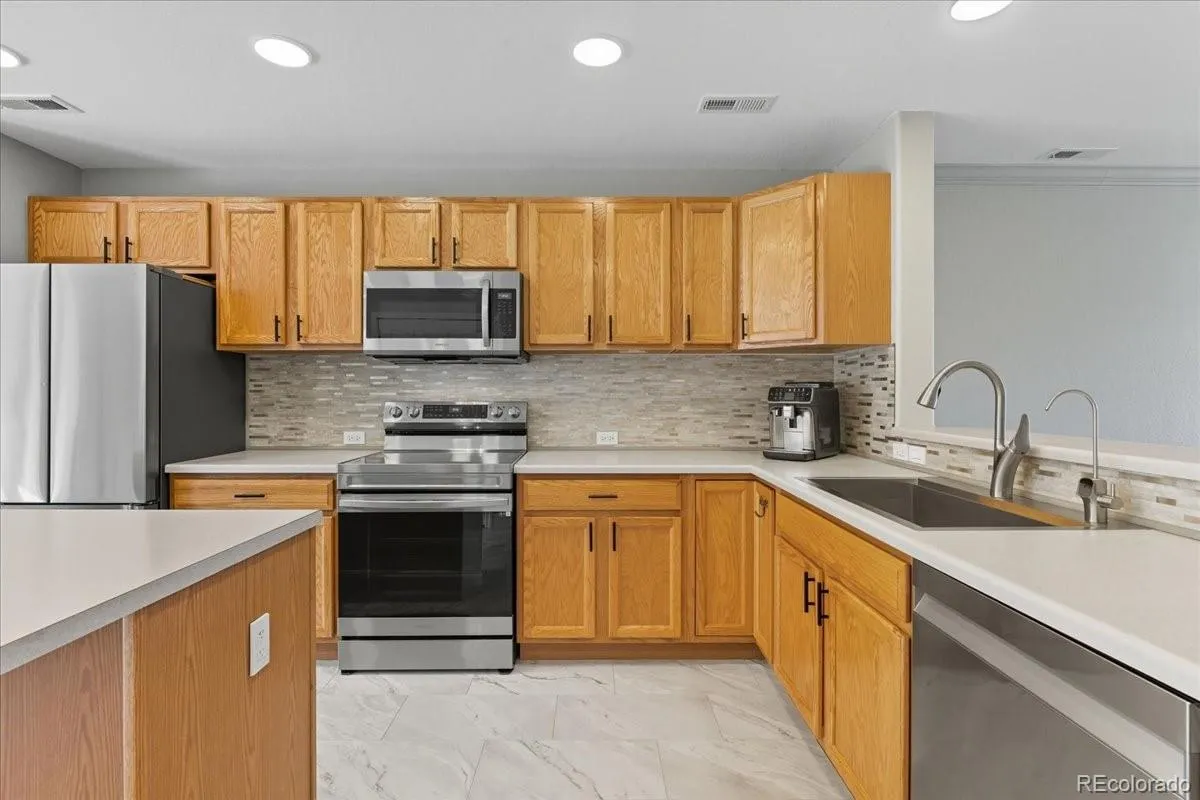 The main level offers a spacious living room that flows seamlessly into a stylish kitchen with an island, updated appliances, chic backsplash, and a generous pantry. The dedicated dining area opens right onto your private patio — perfect for summer grilling, cozy evenings, and entertaining under the Colorado sky.