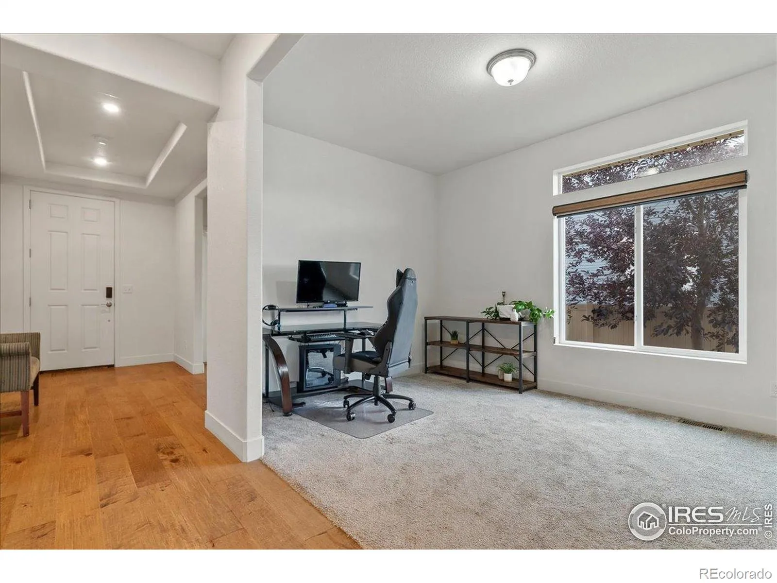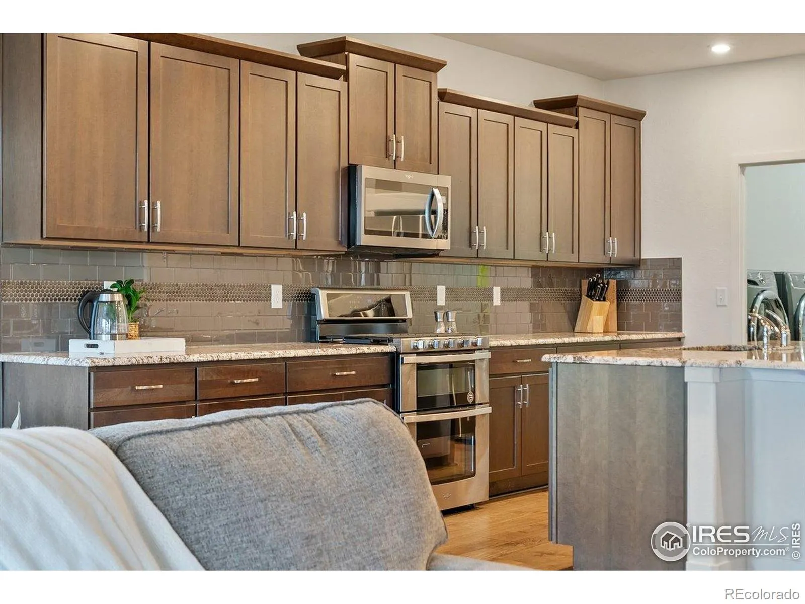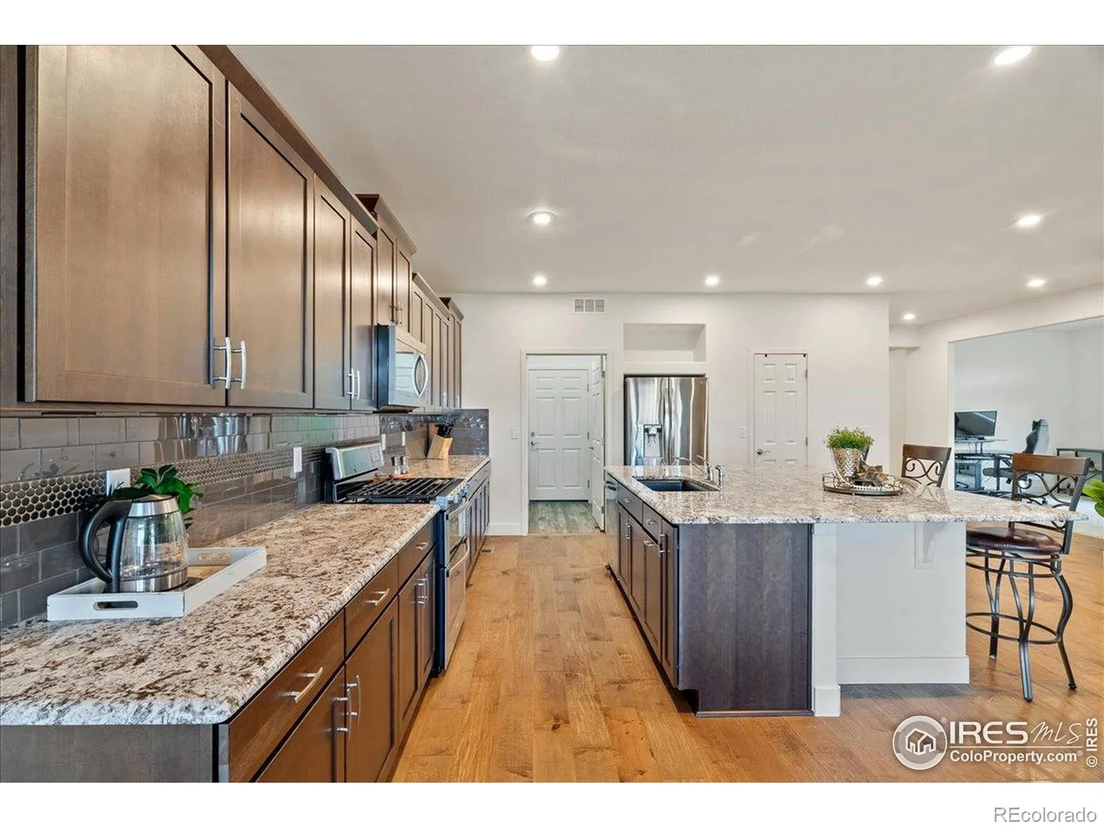 Why buy new when its already done for you? This charming ranch home features wide hallways and sleek wood inspired flooring that bring warmth & elegance, complemented by $74,000 in interior upgrades & an $18,000 lot upgrade. The heart of the home is a stunning 6′ x 7.5′ kitchen island, accompanied by beautiful cabinetry (soft close features), subway tile backsplash adorned with elegant penny tile accents. The cozy gas fireplace adds warmth to the living space. All 3 bedrooms (one non conforming) set up as an office space are conveniently located on the main floor, along with the laundry facilities, facilitating true single-level living! Spanning nearly 1,800 square feet, this home offers ample space to spread out. The luxurious primary bedroom includes a spa like ensuite bathroom with a floor-to-ceiling tile shower, poured shower pan, upgraded granite countertops, among other exquisite features. You will appreciate the covered Trex deck at the rear of the home, which overlooks a picturesque meandering bike path and offers unobstructed views of the mountains. The professionally landscaped backyard is a gardener’s paradise, featuring an array of plants, flowers, and garden beds, along with two pergola structures and a charming walking path. Need more space? No problem, there is an unfinished basement & oversized 3 car garage. The 2021 built Elementary school is down the street, 2023 built clubhouse and pool just a short stroll, and TRR offers so much open space, frisbee golf course and community get togethers. Oh and a 1 year home warranty included!!