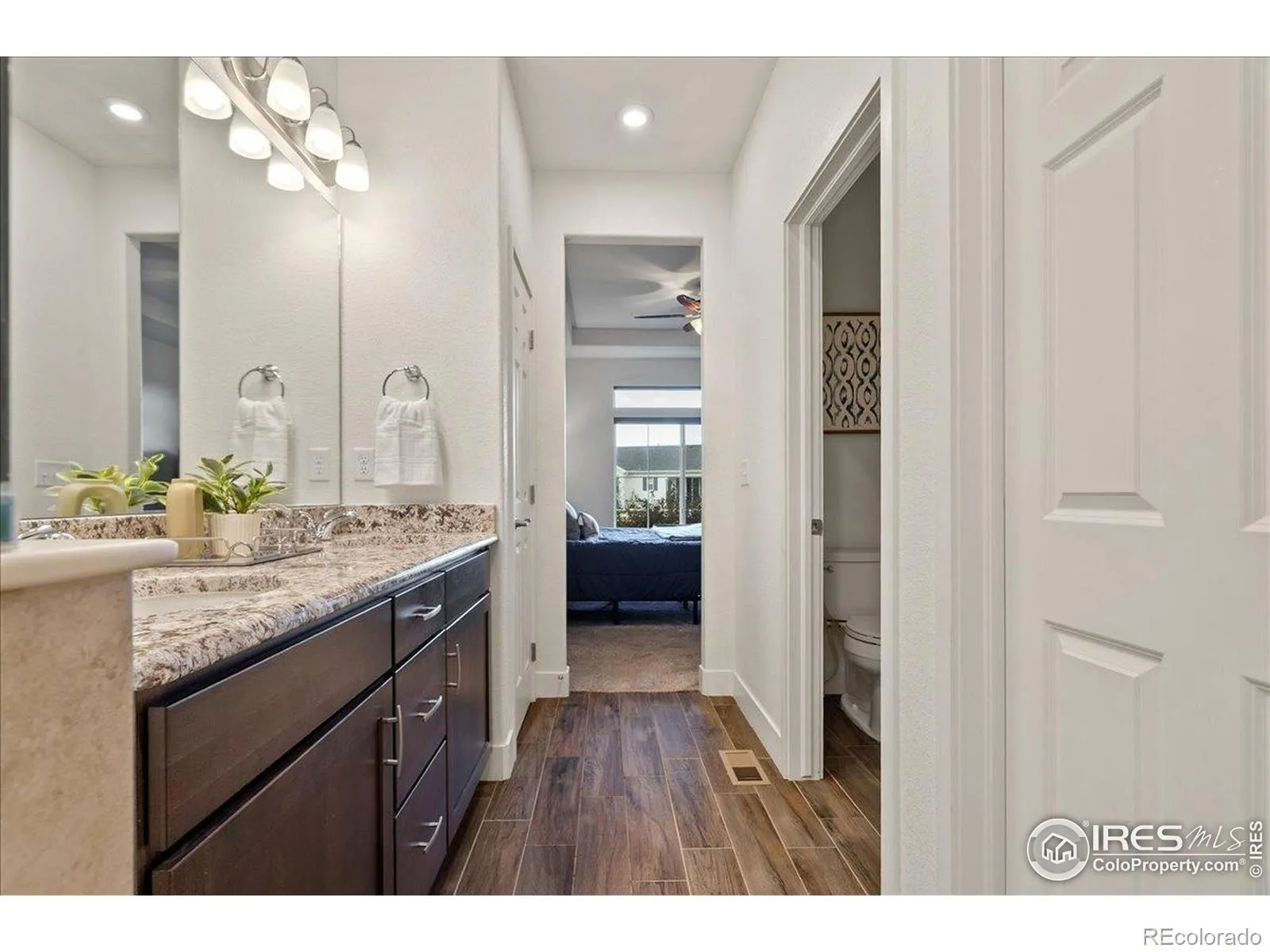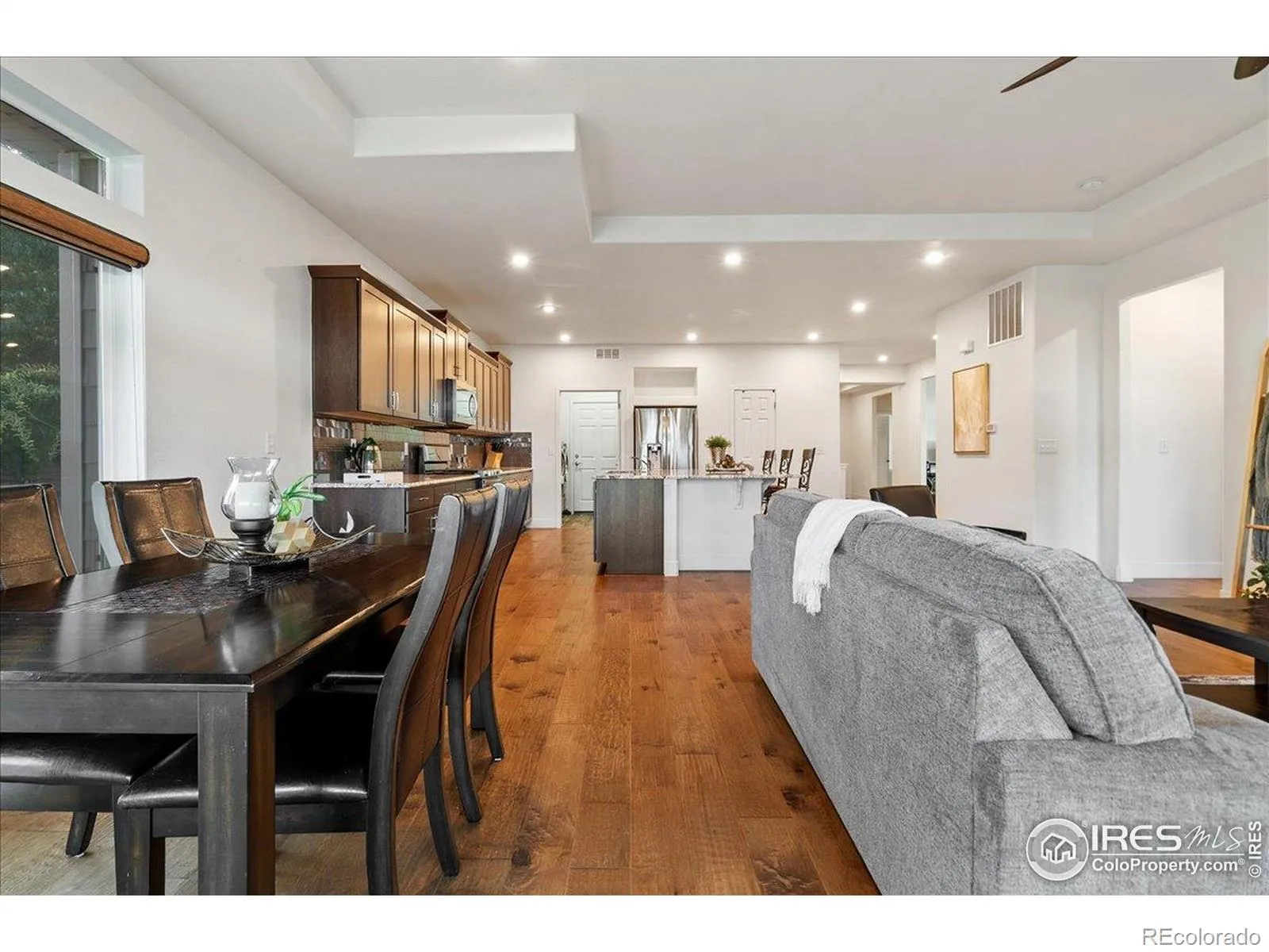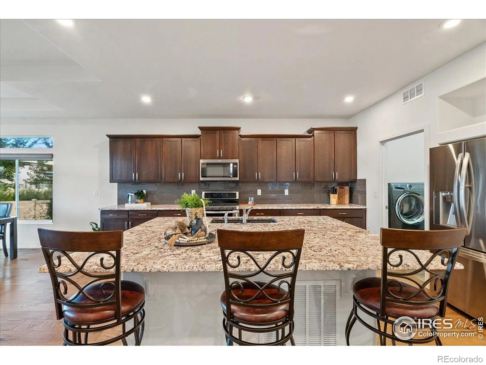 Why buy new when its already done for you? This charming ranch home features wide hallways and sleek wood inspired flooring that bring warmth & elegance, complemented by $74,000 in interior upgrades & an $18,000 lot upgrade. The heart of the home is a stunning 6′ x 7.5′ kitchen island, accompanied by beautiful cabinetry (soft close features), subway tile backsplash adorned with elegant penny tile accents. The cozy gas fireplace adds warmth to the living space. All 3 bedrooms (one non conforming) set up as an office space are conveniently located on the main floor, along with the laundry facilities, facilitating true single-level living! Spanning nearly 1,800 square feet, this home offers ample space to spread out. The luxurious primary bedroom includes a spa like ensuite bathroom with a floor-to-ceiling tile shower, poured shower pan, upgraded granite countertops, among other exquisite features. You will appreciate the covered Trex deck at the rear of the home, which overlooks a picturesque meandering bike path and offers unobstructed views of the mountains. The professionally landscaped backyard is a gardener’s paradise, featuring an array of plants, flowers, and garden beds, along with two pergola structures and a charming walking path. Need more space? No problem, there is an unfinished basement & oversized 3 car garage. The 2021 built Elementary school is down the street, 2023 built clubhouse and pool just a short stroll, and TRR offers so much open space, frisbee golf course and community get togethers. Oh and a 1 year home warranty included!!