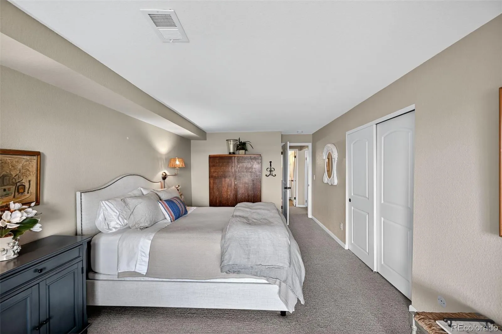 Designer inspired townhome bordering Marston Reservoir with uninterrupted views out nearly every window of the serene waters and the southern Rampart Range mountains! This exquisitely remodeled home features two bedrooms, 2.5 baths, a loft-styled office along with a finished walk-out basement. You will immediately be impressed as you enter the covered front porch area with its custom made Alder front door and welcoming foyer with richly stained hardwood floors extending into the open living room anchored by the 2-story white stone fireplace containing a new gas insert and wood mantel. The homes new layout draws your attention to the inspirational kitchen with custom designed cabinetry with pull-out/soft close drawers, a pantry, expanded office nook and under cabinet lighting. High-end appliances include a gas Wolf stove and hood, along with a unique tiled backsplash and quartz countertop making this kitchen really shine! There is also a wonderful dining area with a built-in banquette, additional bar seating all illuminated by two sets of newer sliding glass doors that provide plenty of natural light and easy access to your renovated deck with an electric awning and natural gas BBQ. Up the stairs is the loft area, competing for the best views in the house, along with your spacious primary bedroom, with his and her closets and ensuite bathroom with a dual sink vanity and a large glass enclosed shower. The walk-out basement features an additional bedroom, a large finished storage closet and remodeled bathroom with a large soaking tub and quartz vanity. There is also a family room, with several built-ins plus the laundry room w/additional storage. Remodeled in 2020, with plenty of upgrades since, this home also features wrought iron balusters, ceiling fans, exposed beams, custom tile, skylights, upgraded lighting and a main level powder room with matching quartz vanity. A quick golf cart drive away from Pinehurst CC or an ideal lock and leave home that is move-in ready.