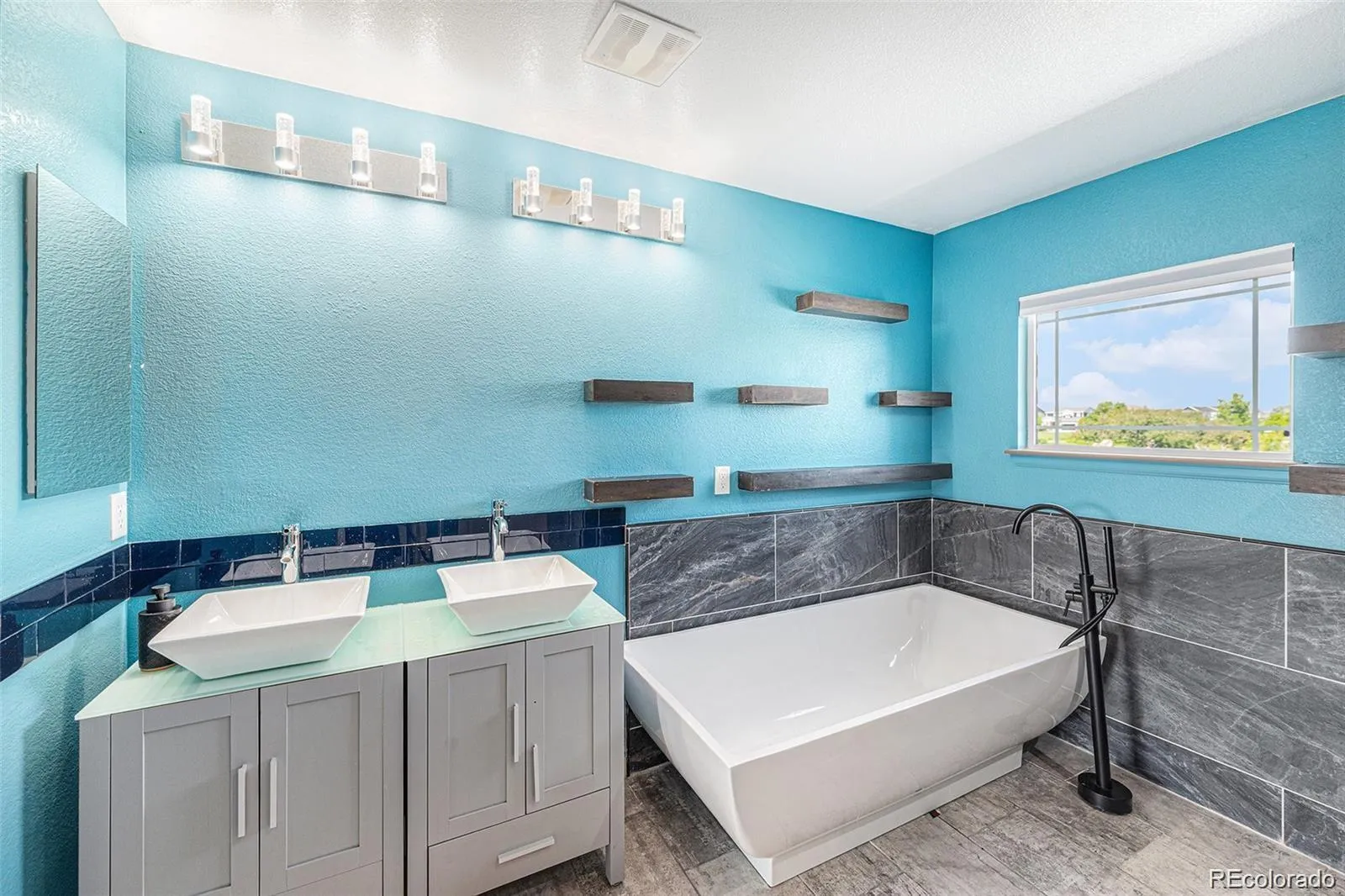 The primary suite offers a peaceful retreat, complete with a spacious walk-in closet and a beautifully updated bathroom with dual sinks, a soaking tub, and separate shower. Additional conveniences include a dedicated laundry room and an attached two-car garage (not pictured).