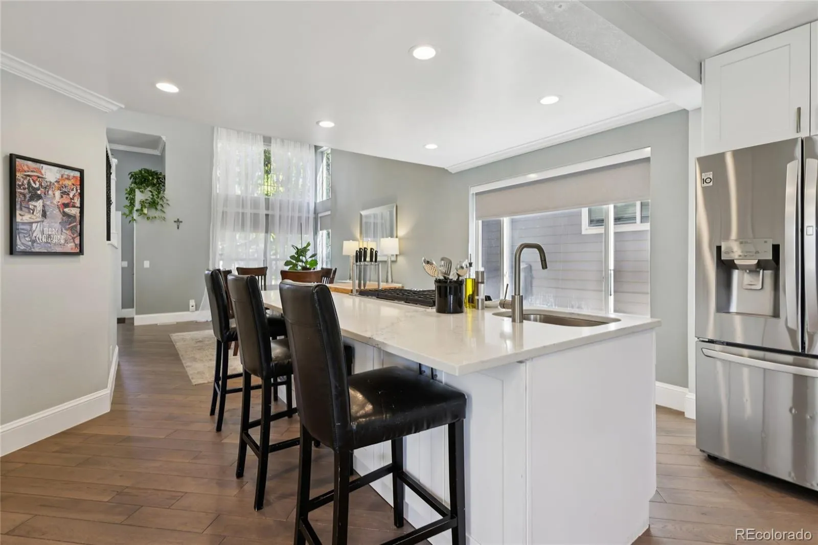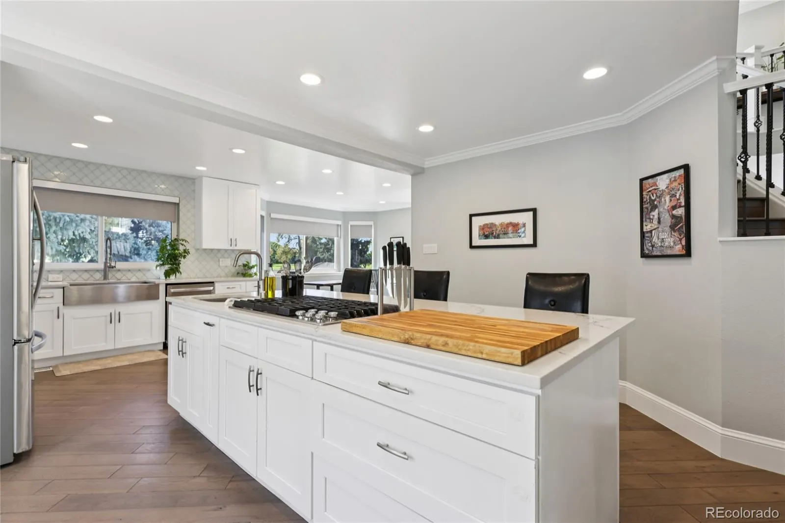 This stunning Vista at Meadow Hills home has been completely updated with high-end finishes throughout and offers breathtaking views of the 16th hole at Meadow Hills Golf Course along with picturesque mountain scenery. The open-concept main level features rich wood flooring, formal and informal living spaces, soaring two-story ceilings in the family room, and expansive windows that frame the golf course backdrop. A cozy electric fireplace with a floor-to-ceiling stacked stone surround adds warmth and elegance (with a gas connection if desired), while the newly remodeled gourmet chef’s kitchen is a showpiece with quartz countertops, high-end appliances, and an expansive center island, complemented by a formal dining room ideal for entertaining. Upstairs, the wrought iron staircase leads to four spacious bedrooms, including a luxurious primary retreat with vaulted ceilings, sweeping views, and a spa-inspired five-piece bath. The finished garden-level basement offers additional living space with a family room, bedroom, full bath, and ample storage. Outdoors, relax on the composite deck and soak in the serene golf course setting. Every detail has been thoughtfully updated, including new flooring, carpet, remodeled bathrooms, fireplace redesign, recessed lighting, modern fixtures, fresh paint, landscaping, and custom window shades. The oversized three-car garage is fully finished, providing exceptional space and functionality. Located within the Cherry Creek School District, this home is just a short walk to the golf course, restaurants, tennis, swimming, and Cherry Creek State Park, blending luxury living with unmatched convenience.