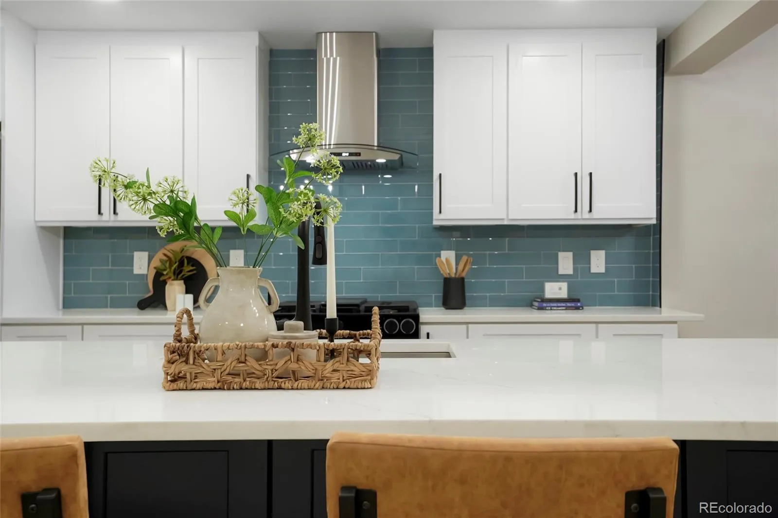 Beautiful open concept kitchen with large island, quartz countertops, striking blue subway tile backsplash