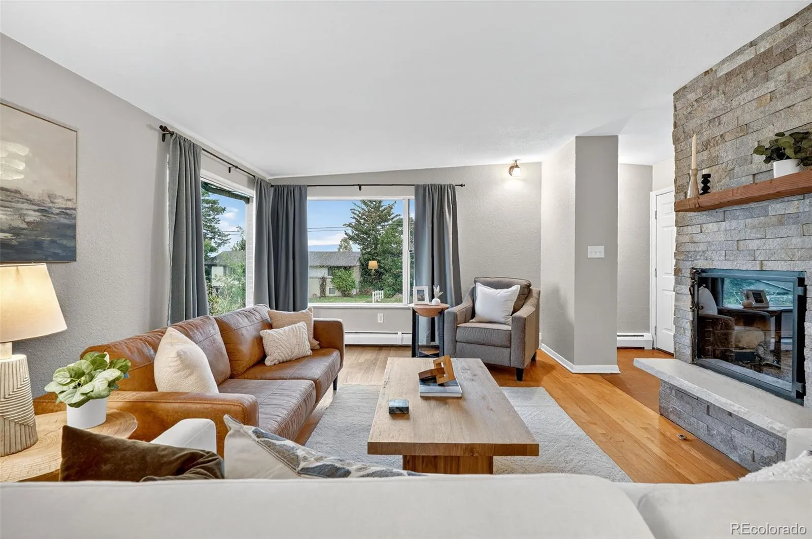 Welcome to Scenic Heights – One of Arvada’s Most Coveted Neighborhoods. It’s here you’ll find majestic mountain views, quaint streets, beautiful homes, bike paths, parks, and this mid-century gem, the one you’ve been waiting for. This home sits just two blocks away from Majestic View Nature Center and Park, the 80-acre treasure that draws people in from near and far. Old Town Arvada is a short jaunt away as well. Step inside to an inviting floor plan with a gas stonework fireplace serving as a beautiful, artistic focal point. The kitchen, dining and living room flow effortlessly on the main level, where you can additionally enjoy an alfresco dining experience protected from the elements on your screened-in back patio. There’s a main-floor primary suite for those who are looking to live a more stair-free lifestyle, with two additional bedrooms on this level as well. Downstairs you’ll find a finished basement, complete with a living room and wood-burning fireplace, two more conforming bedrooms, full kitchen and bar; it’s true, your guests won’t ever want to leave. The size of this lot is impressive, but not nearly as impressive as the thoughtfully put together landscaping that comes with it. You’ll enjoy many native plants and flowers that were chosen particularly for their low-watering needs, mature trees, raised flower beds for gardening, and plenty of room to spread out. This home is suitable for everyone, and provides different amenities for different folks. Great schools and parks nearby, a peaceful oasis of a yard, a great place to entertain, close proximity to may Colorado outdoor activities, it’s everything you are looking for. You simply must see for yourself what all the hype is about. You won’t be disappointed, and this house won’t last long. Honorable mentions: new roof, new evaporative cooler, new water heater, new driveway. Not quite as exciting as the location and views, but for sure just as important. Open house Saturday 10am-2pm, Sunday 10am-4pm.