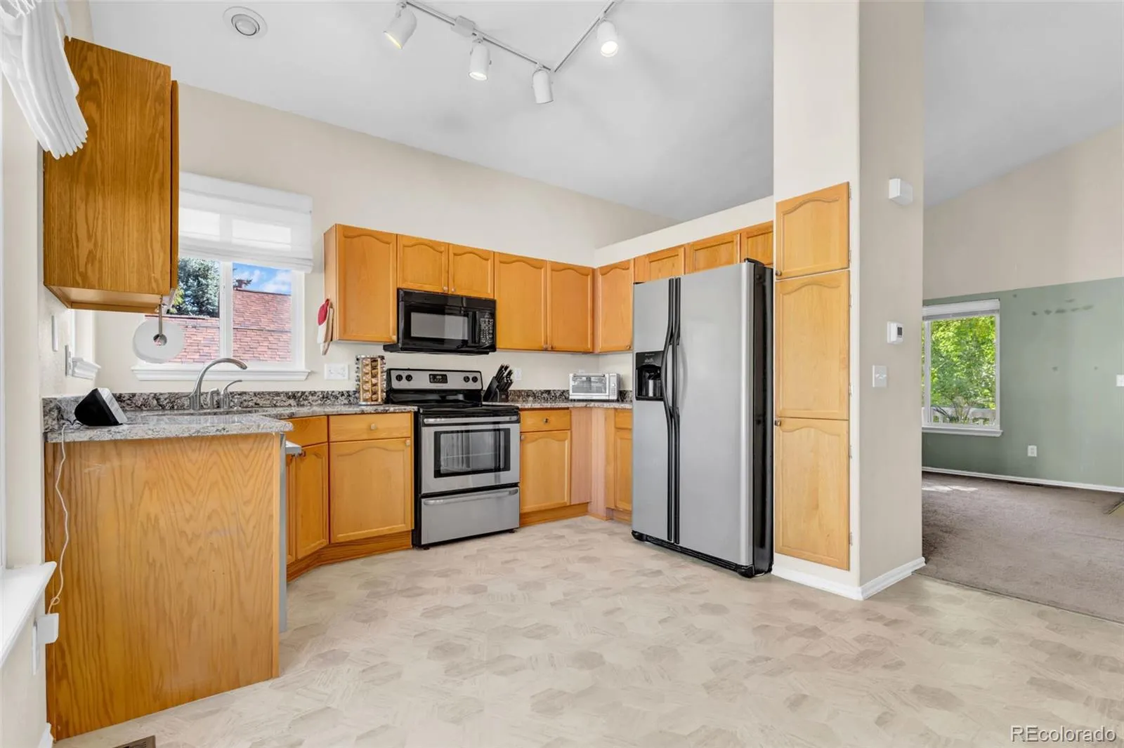 Inside, you’ll find vaulted ceilings, abundant natural light, and a neutral palette that creates a warm and inviting atmosphere. The heart of the home is the spacious kitchen, complete with slab granite countertops, stainless steel appliances, and plenty of cabinet space, perfect for both everyday living and entertaining.