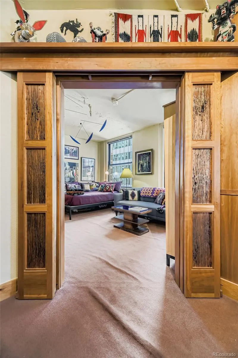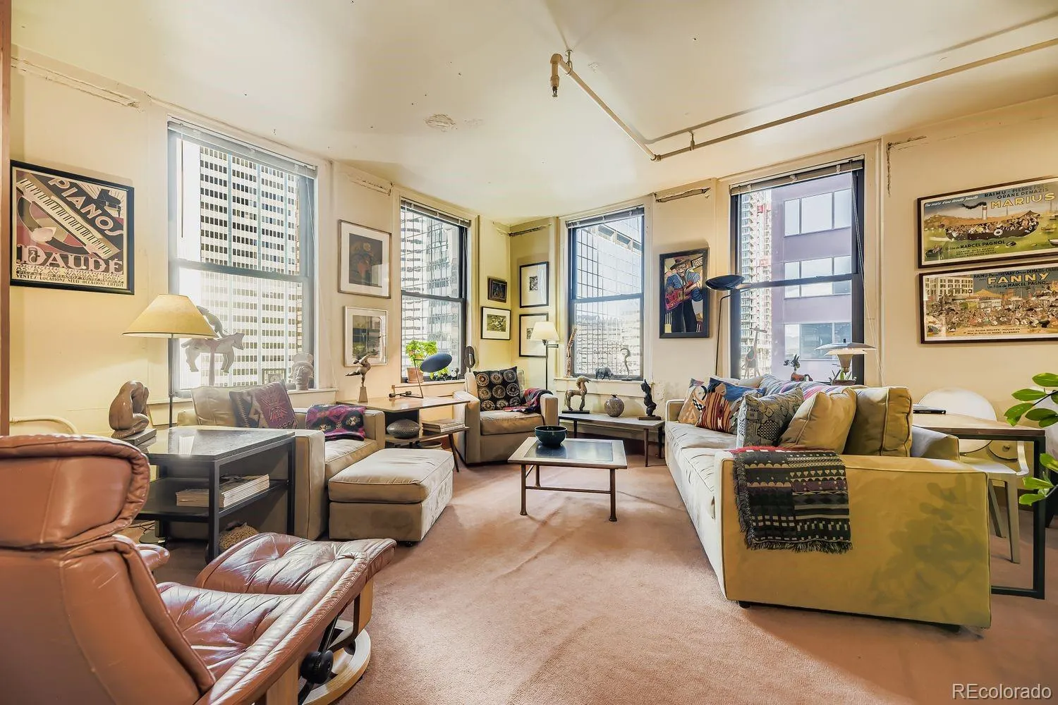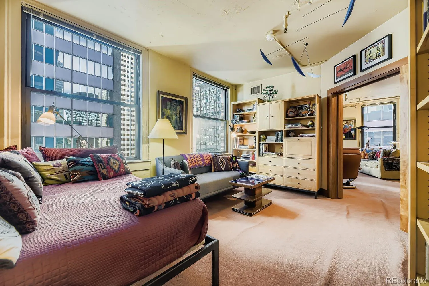 ***MOTIVATED SELLER***Do you have an appreciation for architecture? Live in the historic Midland Savings & Loan building. Designed by Denver’s prominent Fisher & Fisher Architects in the 1920’s. Penthouse unit #1003 embraces the history while offering sleek custom renovations. This corner unit allows natural light to pour in. See the reflection in the building to the east of the famous gargoyle’s by Denver sculptor Robert Garrison that sit atop the building. Open concept loft with so many upgrades. The kitchen features double tall cabinets for additional storage with acid treated copper door accents, Colorado granite countertops, Induction cooktop, Bosch dishwasher, Convection oven, pantry, roll out trash cabinet, broom closet. Custom Cherry wood built-ins throughout this loft maximize storage capabilities. The entryway Cherrywood built-in features a coat rack and storage bench. This owner paid attention to detail when remodeling by adding additional outlets & lights to the built-ins and to make the best use of space. Enter the Primary bedroom through custom sliding Cherrywood and acid treated copper doors. Ensuite full bathroom and a large walk-in closet in the primary bedroom. Bathrooms have both been updated with granite countertops and tile floors. Heat/AC unit in living room replaced 7 years ago, heat/ac unit in front bedroom replaced 1 year ago. Expose the concrete floors under the carpet for a chic urban loft look. Secure parking lot space #24. Locked storage space in the basement can fit several bicycles. Fitness center located on the 2nd floor. Each floor has a complimentary laundry room. The new 16th Street is the place to be! Location! Great walkability to restaurants, museums, light rail and all Denver has to offer.