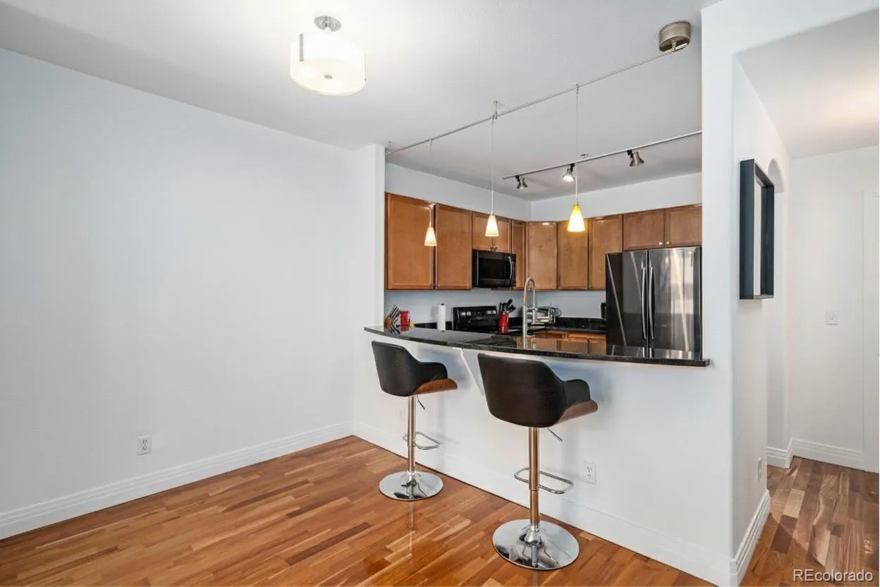 Step into a bright living area anchored by a gas fireplace and mantel, flowing seamlessly to a sunny private balcony this is perfect for morning coffee or grilling with an installed natural gas line. The kitchen features modern cabinetry, granite countertops, and a roomy breakfast bar, ideal for both casual meals and entertaining. All appliances have been updated. The primary suite includes a walk-in California-style closet and a luxurious 5-piece en-suite bathroom. The second bedroom is nicely sized and bright as well, with access to the second full bathroom. Additional perks: in-unit full-sized stacked washer/dryer, a deeded garage space with adjacent storage unit, and access to community amenities including fitness center, pool, hot tub, billiards room, and a large entertaining room with full kitchen. This condo is perfectly situated next to the Light Rail for an easy commute to Denver, the DTC, and beyond. Experience comfortable urban condo living with all the conveniences you need.