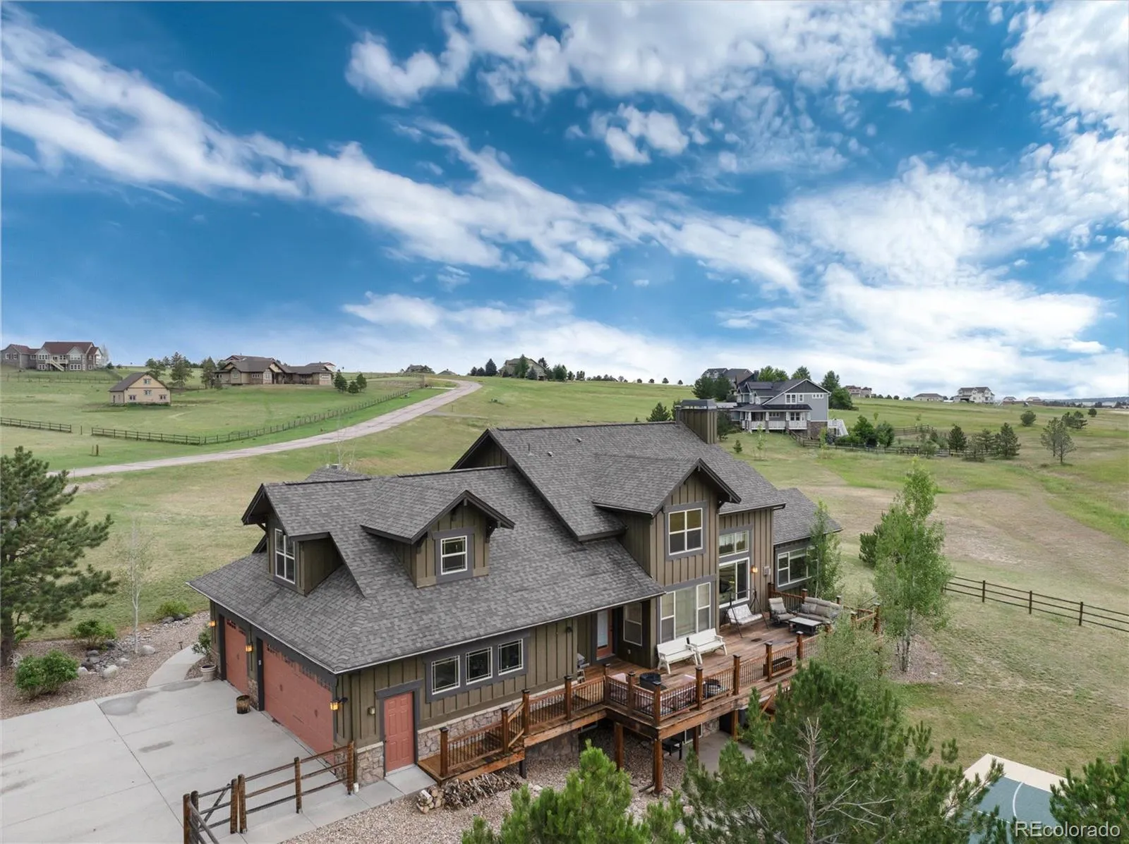 Welcome to 33320 Ridgeview Loop, an exceptional 5-bedroom, 4-bath home on 5.16 acres in the sought-after Wild Pointe community of Elizabeth, CO. This beautifully updated property features a new class 4 impact-resistant roof, new exterior paint, new furnace and A/C system with humidity control and UV air filtration, and mature landscaping that enhances its private, serene setting. Inside, you’ll find a spacious layout with a main-level primary suite, gourmet kitchen with granite counters and double ovens, and a walk-out basement with a workshop with built-in ventilation system. Outdoor living shines with a large deck featuring a dry-deck system, a private hot tub and swim spa, and a full-size sport court marked for basketball and pickleball. The 3-car garage, versatile bonus rooms, and walk-out basement offer flexibility for hobbies, work, or entertainment. Perfectly blending comfort, function, and lifestyle, this turnkey home is a must see.
