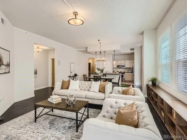 Discover the heartbeat of Denver’s Golden Triangle Creative District, where art, culture, and urban energy ignite! Surrounded by 16+ galleries, Civic Center Park’s 25,000 sq ft of blooming beauty, bold public art, eclectic dining, and boutique shopping, this location is a cultural hotspot. Steps from the Denver Art Museum, Denver Public Library, The Art Hotel, The Kirkland and Cherry Creek Bike Path, this is city living at its finest. This stunning corner-unit condo radiates light through expansive windows and two private balconies. Soaring ceilings and wide-plank hardwood floors amplify the open floor plan’s elegance. The gourmet kitchen dazzles with stainless steel appliances, sleek granite countertops, and a sprawling island perfect for culinary creations or lively gatherings. Relax by the cozy gas fireplace (gas included in HOA) in the great room, flowing seamlessly into a chic dining area. The primary suite is a serene retreat with a custom walk-in closet and a luxurious 5-piece spa bathroom. The versatile second bedroom serves as a guest haven or inspiring home office. With two parking spaces and a storage unit this secure building offers urban sophistication and effortless access to Denver’s vibrant core. Live where creativity thrives!