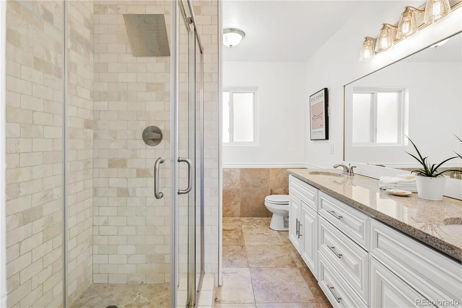 You’ll love this move-in ready ranch-style home in highly sought-after North Park Hill! Nestled on a spacious lot, this mid-century gem blends timeless character with modern updates. Step inside to discover beautiful hardwood floors, original built-ins, and a flowing open floor plan perfect for entertaining. A true gathering spot, the remodeled eat-in kitchen features elegant crisp white cabinetry, substantial granite countertops, a full suite of new Café appliances, and a center island, offering both light and abundant workspace for the dedicated home cook. The inviting living room with a gas fireplace creates a cozy gathering space, while a separate den adds versatility with wood-beam ceilings, painted exposed brick, a second fireplace, and easy access to the backyard. At the heart of the home sits the spectacular formal dining room, ideal for hosting, boasting built-in cabinetry and a fun, updated chandelier. Retreat to comfort in the oversized bedrooms, each featuring generous closet space for easy organization. The primary suite is wonderful get away, with a bonus sitting area with access to the back yard, while the spa-like main-level bathroom offers a dual-sink granite vanity, walk-in shower, and jetted soaking tub. The fully finished basement dramatically expands your living options with stained concrete floors, reclaimed wood accents, a kitchenette, a bedroom with an egress window, and a ¾ bath; ideal for a guest suite, home office, or in-law retreat. Enjoy the private, fully fenced backyard with a large patio, perfect for outdoor dining, play, or pets. Recent updates include remodeled bathrooms, newer furnace, gutters, siding, sewer line to tap, solar panels and mature landscaping.