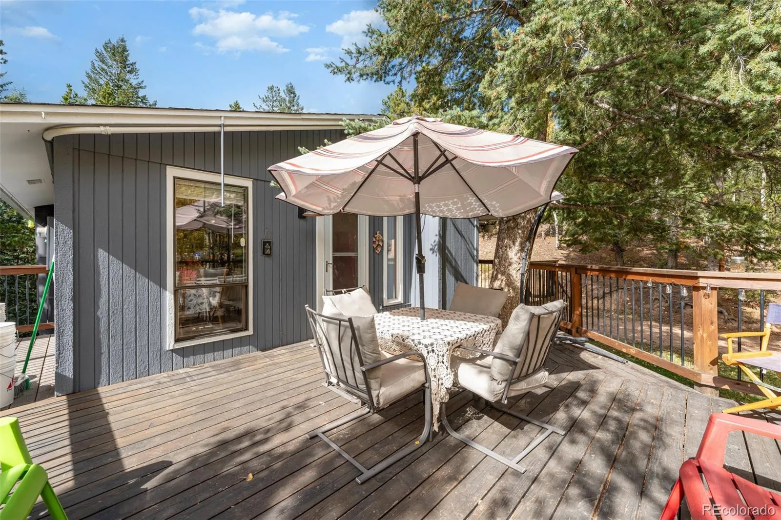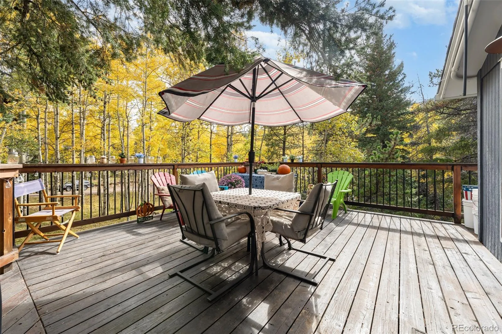 This raised ranch tucked into the pines on a 1+ acre lot on a quiet lane features 4 bedrooms, 2 bathrooms, two fireplaces, and a wonderful wraparound deck for an unbeatable outdoor living space. The remodeled kitchen has quartz counters, laminate floors, white cabinets with crown molding, and eat-in space. The rest of the main floor features the large family room, three bedrooms, and a full remodeled bathroom. The walk-out basement is mostly unfinished (waiting for your design/finish ideas), including a large workshop room and a stone surrounded Franklin stove fireplace, but also has a full, finished bathroom and a finished bedroom. You’ll love the peace and solitude of mountain living in this very affordable, comfortable, well-cared-for raised ranch home. Come see it today!