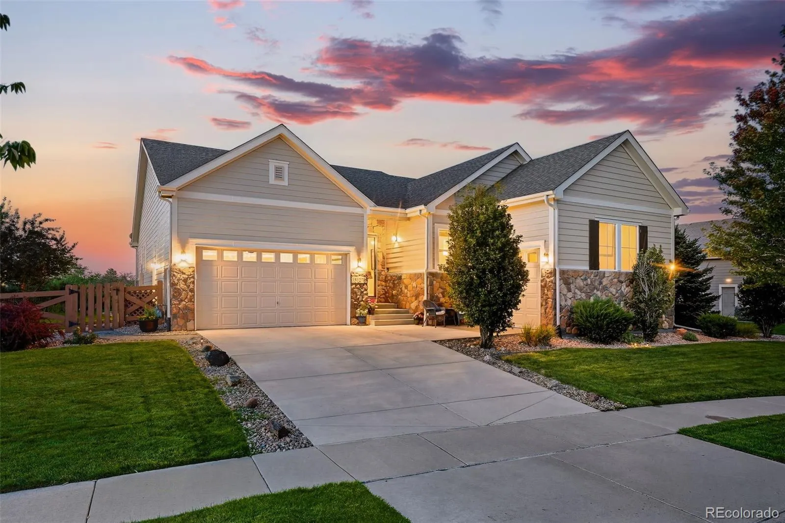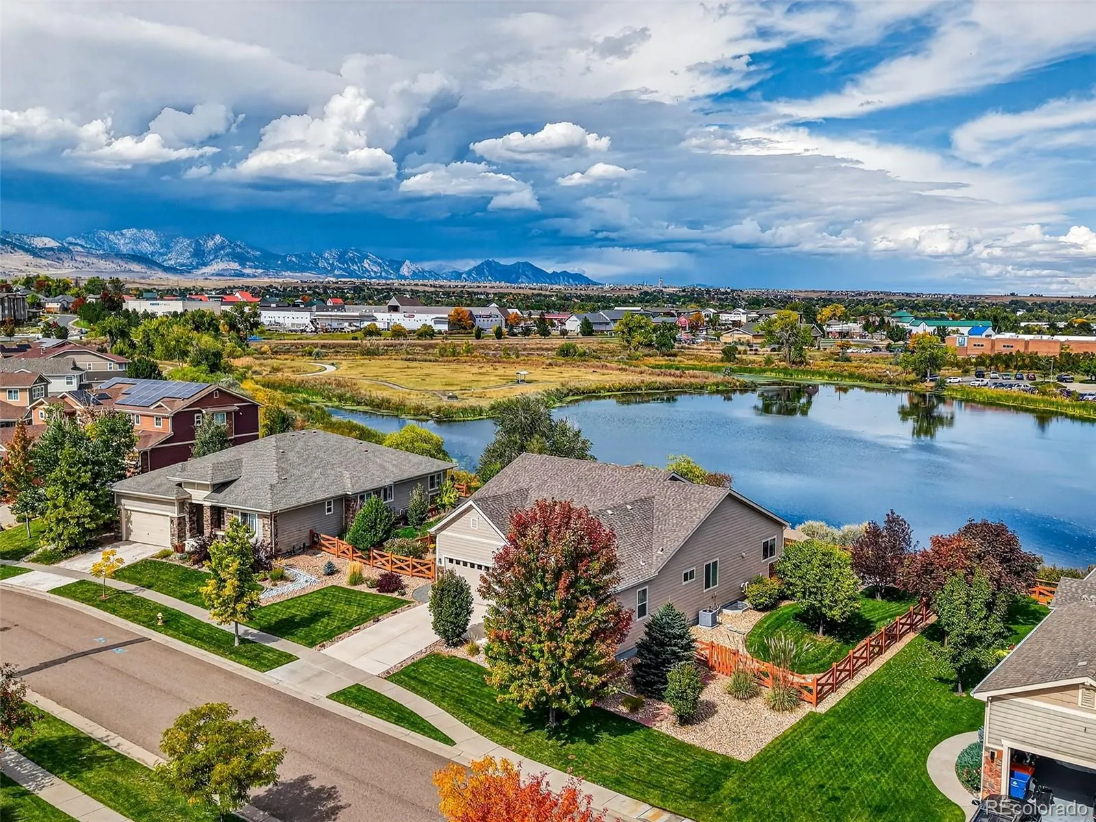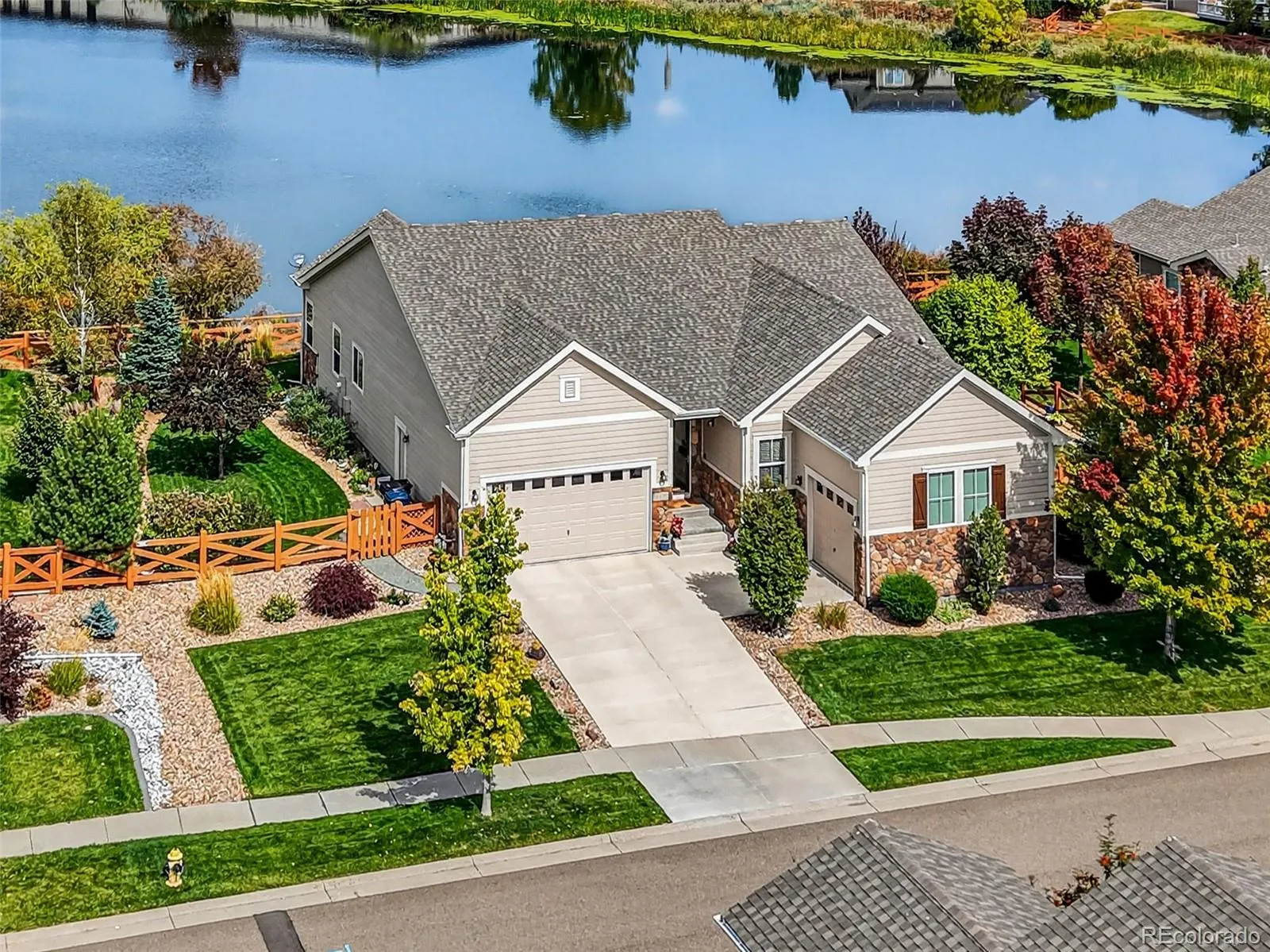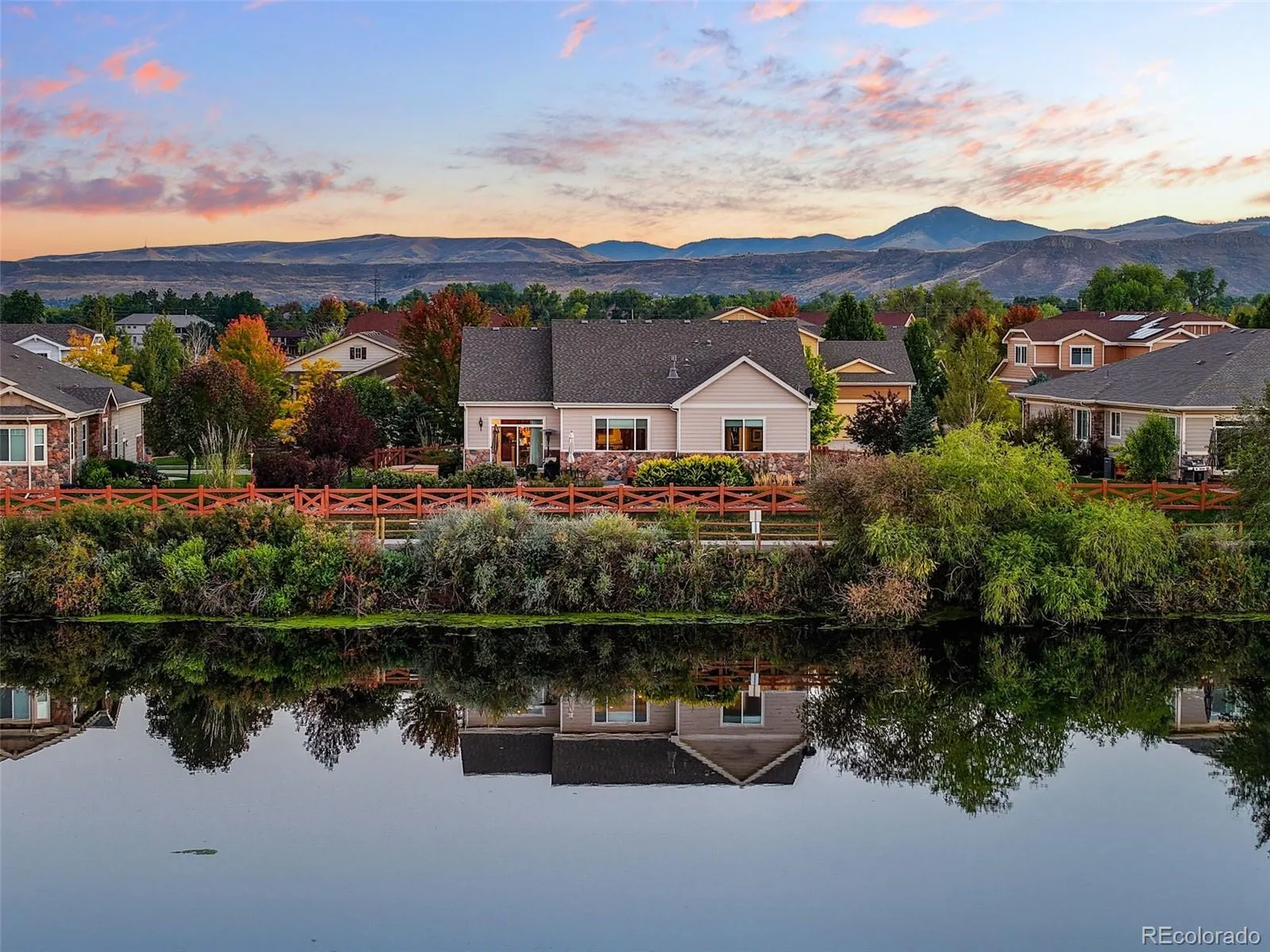 Lake and foothills views define this home. From the kitchen, living room, and primary suite, Broad Lake stretches out in full, framed by native grasses and open sky. Few homes in the neighborhood back directly to the water, and in Colorado, true waterfront living is a rare privilege. The ranch-style layout is practical, open and inviting: three bedrooms, an office, formal dining room, large living area with breakfast nook on the main level, including a spacious primary suite with a large walk-in closet and generous en suite bath. The recently finished lower level is the perfect layout, with large entertaining space, a wet bar, two additional bedrooms plus a beautiful 3/4 bath. Custom motorized shades, a three-car garage, and meticulous maintenance throughout reflect the same attention given to every detail of the home. The backyard is an oasis, with an oversized stamped concrete patio, a private hot tub, manicured gardens and more, but it is the connection to the lake—the stillness, the view, the sense of space—that makes this property unique and extraordinary.