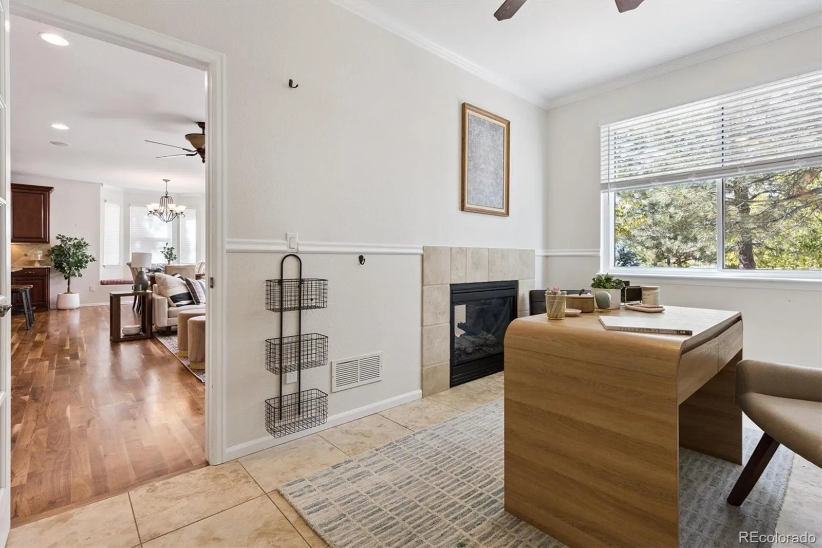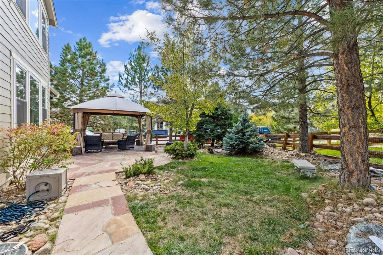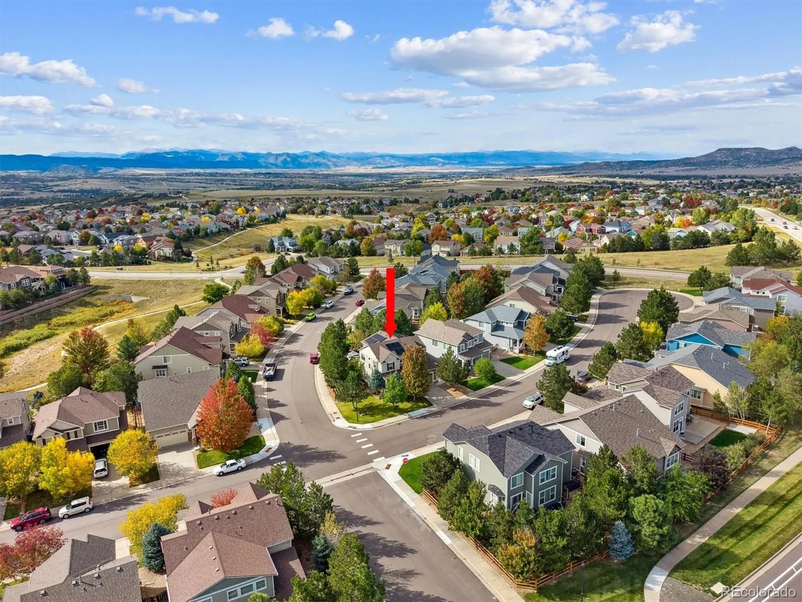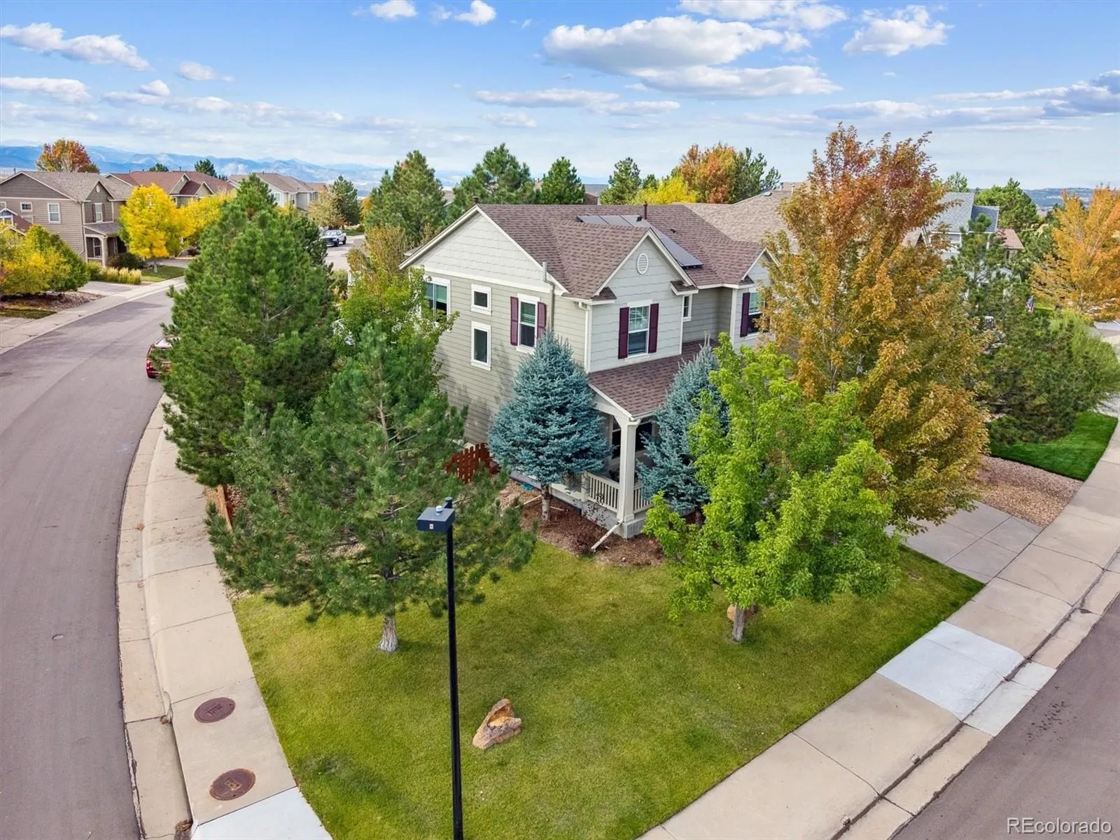 Situated on a premium corner lot in The Meadows, 2339 Robindale Way is defined by intentional design, seamless flow, and refined finishes throughout. The grand foyer opens to a spacious family room, complemented by beautiful walnut hardwood floors, abundant natural light, built-in Bose speakers, and a dual-sided gas fireplace that adds warmth and texture to the space. Enjoy intimate family meals in the formal dining space; with custom built-ins, this room could be optioned as a second home office. The well-appointed kitchen includes granite counters, a stainless steel appliance package with dual ovens, a walk-in pantry, and an oversized center island. Step outside to a serene park-like backyard. The yard offers privacy, featuring multiple mature trees and new professional landscaping, which can be enjoyed from the sizable paver patio. Enjoy listening to the relaxing water feature while hosting summer BBQs or relaxing under the stars. Upstairs, the private living quarters unfold to three generously sized secondary bedrooms, a full bath, laundry, and the primary suite. This sanctuary is complete with tre-ceilings, a walk-in closet, and an ensuite 5-piece bath. Descend to the finished lower level for family movie nights in the sizeable den. A private 5th bedroom and bath make for a great guest suite or optional flex space. Additional features of this turnkey residence includes a brand new roof, a main-floor home office with a gas fireplace, a laundry room featuring built-in cabinetry, an attached 3-car tandem garage equipped with a 240V EV charging station, and Paid-Off solar panels that can be transferred to the next owner. The Meadows is a coveted family-friendly community in Castle Rock within minutes of Soaring Hawk and Clear Sky Elementary, Paintbrush Park, The Grange, Red Hawk Ridge golf course, and endless shopping, dining, and entertainment of The Outlets and Downtown Castle Rock. This residence is ready for its next chapter; all it needs is you.