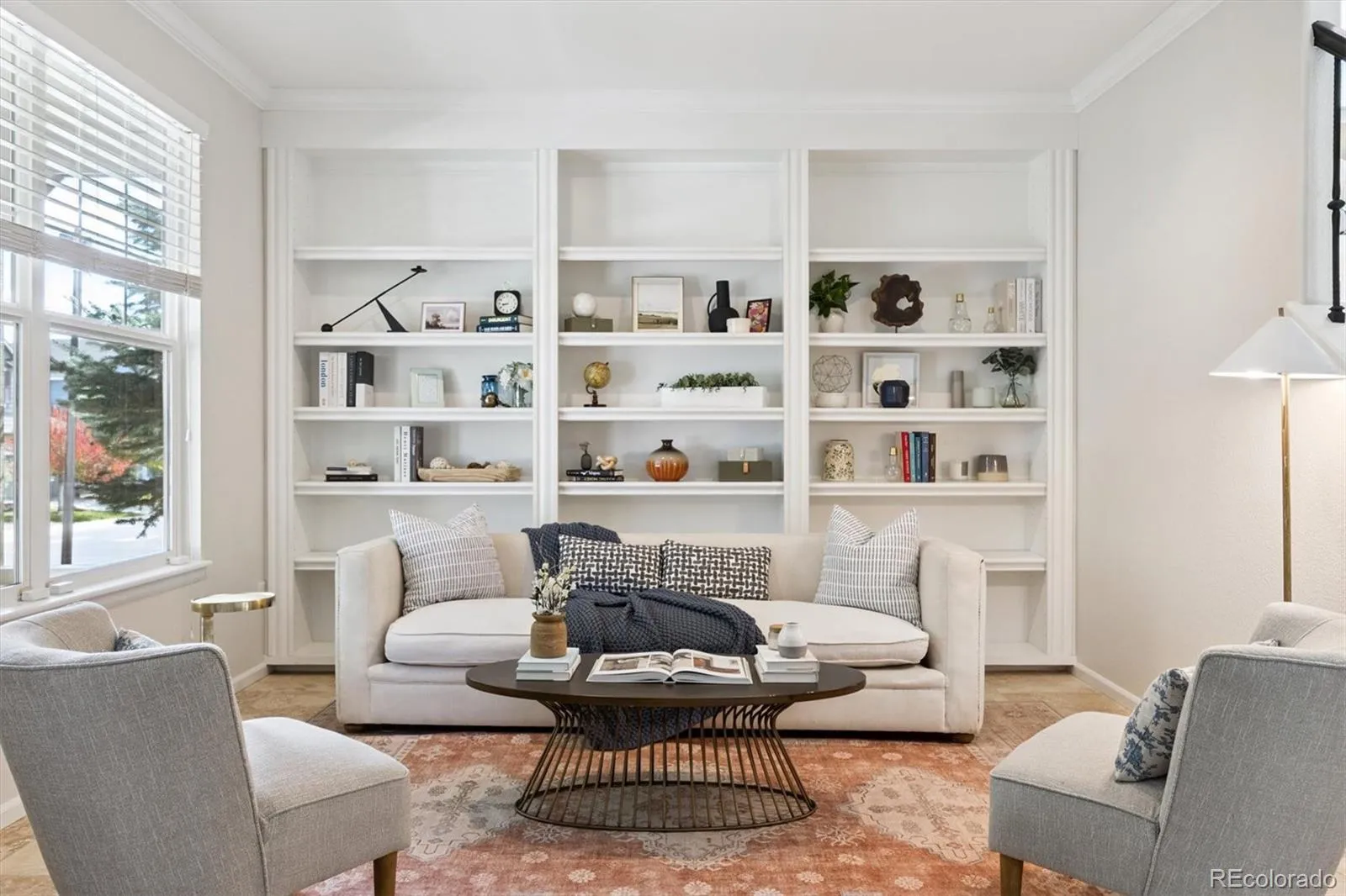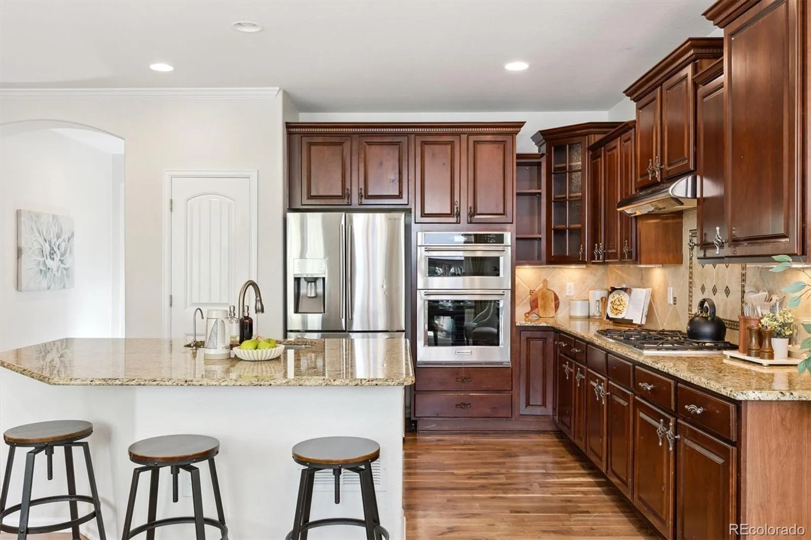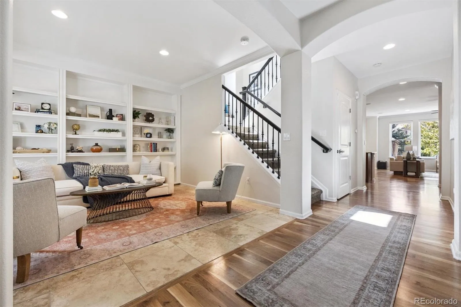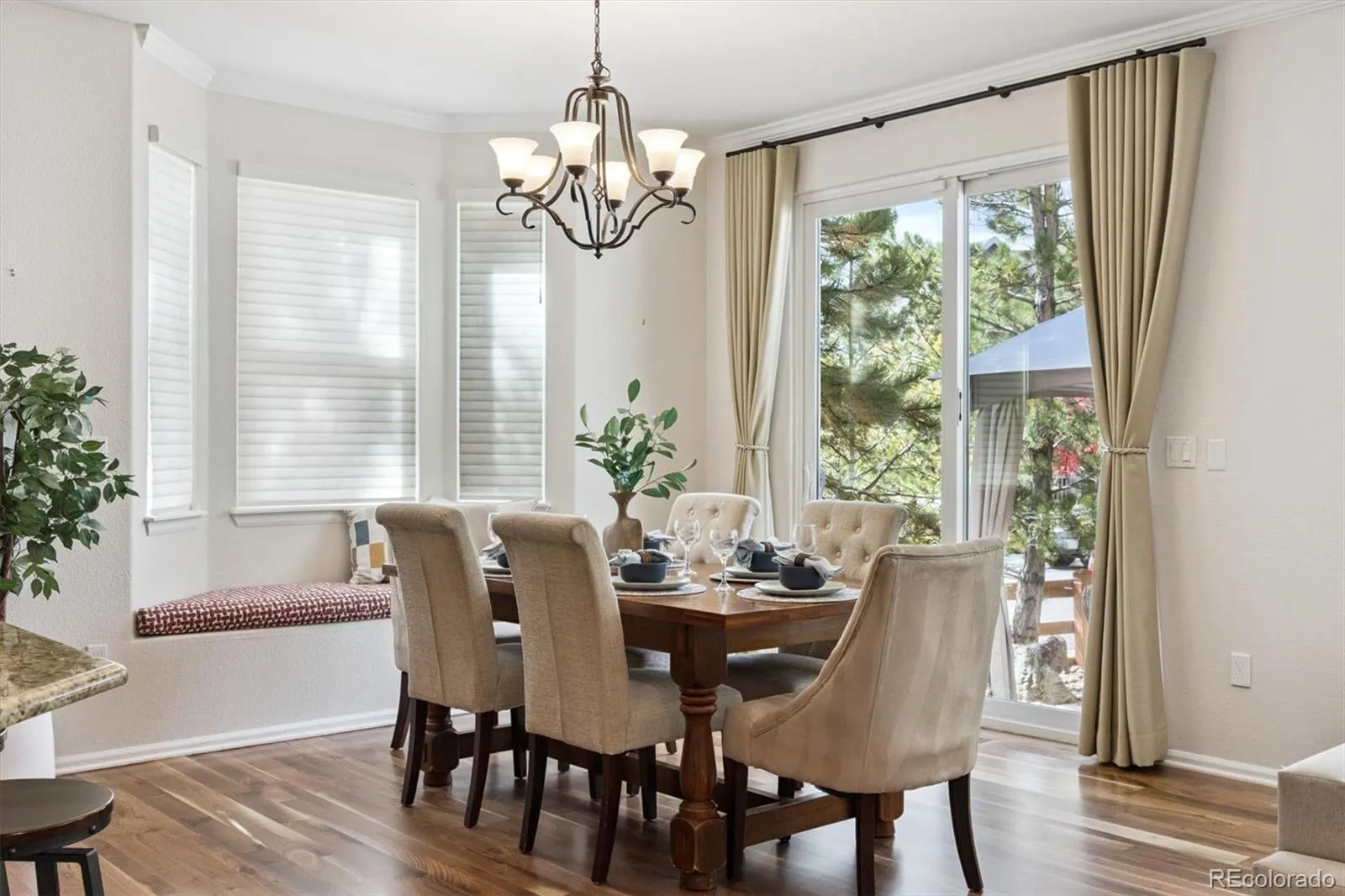 Situated on a premium corner lot in The Meadows, 2339 Robindale Way is defined by intentional design, seamless flow, and refined finishes throughout. The grand foyer opens to a spacious family room, complemented by beautiful walnut hardwood floors, abundant natural light, built-in Bose speakers, and a dual-sided gas fireplace that adds warmth and texture to the space. Enjoy intimate family meals in the formal dining space; with custom built-ins, this room could be optioned as a second home office. The well-appointed kitchen includes granite counters, a stainless steel appliance package with dual ovens, a walk-in pantry, and an oversized center island. Step outside to a serene park-like backyard. The yard offers privacy, featuring multiple mature trees and new professional landscaping, which can be enjoyed from the sizable paver patio. Enjoy listening to the relaxing water feature while hosting summer BBQs or relaxing under the stars. Upstairs, the private living quarters unfold to three generously sized secondary bedrooms, a full bath, laundry, and the primary suite. This sanctuary is complete with tre-ceilings, a walk-in closet, and an ensuite 5-piece bath. Descend to the finished lower level for family movie nights in the sizeable den. A private 5th bedroom and bath make for a great guest suite or optional flex space. Additional features of this turnkey residence includes a brand new roof, a main-floor home office with a gas fireplace, a laundry room featuring built-in cabinetry, an attached 3-car tandem garage equipped with a 240V EV charging station, and Paid-Off solar panels that can be transferred to the next owner. The Meadows is a coveted family-friendly community in Castle Rock within minutes of Soaring Hawk and Clear Sky Elementary, Paintbrush Park, The Grange, Red Hawk Ridge golf course, and endless shopping, dining, and entertainment of The Outlets and Downtown Castle Rock. This residence is ready for its next chapter; all it needs is you.