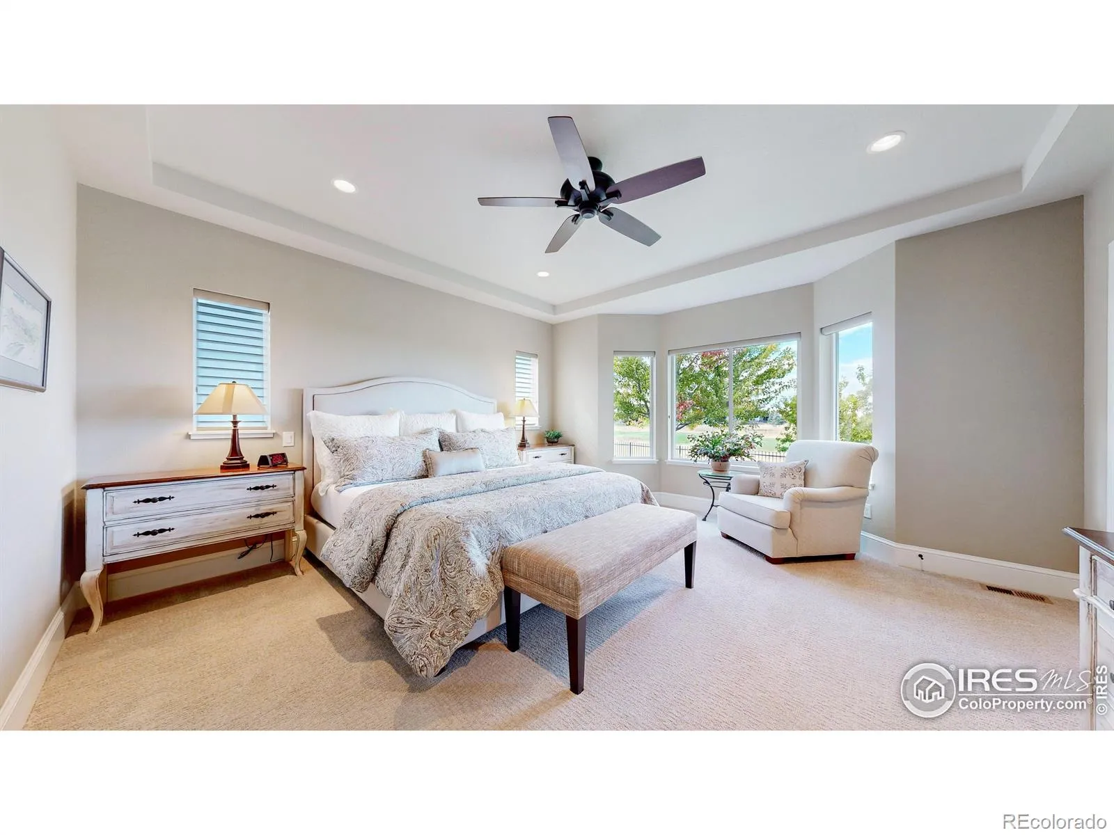 MORE PHOTOS COMING SOON! Prepare to be wowed as you enter this immaculate and stunning 4-bedroom, 4-bath home that showcases a perfect balance of elegance, comfort, and functionality, while being perfectly placed on a 1/3 acre golf course lot. As you enter, you are welcomed by soaring ceilings, expansive windows with Plantation shutters that flood the interior with natural light. Great open floor plan that seamlessly connects the living, dining, and kitchen areas all while taking in unmatched views. The spacious great room is anchored by a stack stone fireplace, creating a cozy gathering space. The gourmet kitchen features granite countertops, custom Tharp cabinetry, S/S appliances, walk in pantry, a large center island with seating and bev fridge all completely designed to satisfy the needs of any home chef. The main floor also includes a huge private office with Tharp built ins, a separated guest suite with its own full bathroom. A convenient laundry room with built-in storage connecting seamlessly to the primary en~suite.The luxurious primary suite is a true retreat, offering a spa-like bath, dual vanities, a huge walk-in shower, as well as a generous walk-in closet w/custom organizers.Step outside to enjoy morning coffee on the patio from your bedroom. Two additional bedrooms and a shared 3/4 bath are located in the basement level. Basement also features a large rec room w/fireplace, wet bar, and additional storage. The outdoor living is equally inviting with a beautifully landscaped yard, covered patio, and plenty of space to entertain or simply enjoy Colorado evenings and watch the golfers. A three-car garage provides ample parking and storage options. The location is ideal, with Highland Meadows Golf Course steps away to enjoy golf, or music at The Grill. The community is amenity filled with access to gym, outdoor tennis, hot tubs, saunas and pool nearby. Be sure to check out the upgrade list and home furnishings available for purchase.