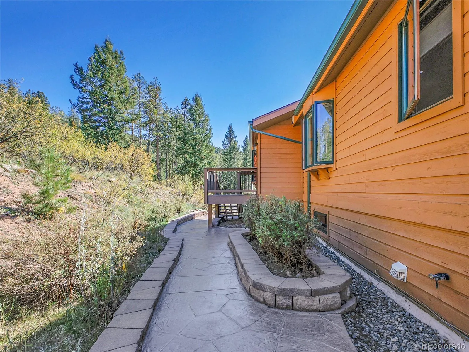Outdoor living shines with Trex decking, a stamped concrete pathway that circles the home—lined with garden beds in summer and easy to navigate year-round—a fenced dog yard, and mature landscaping. A lower concrete patio with additional deck space offers another place to enjoy the outdoors. The property has been fire mitigated for peace of mind.