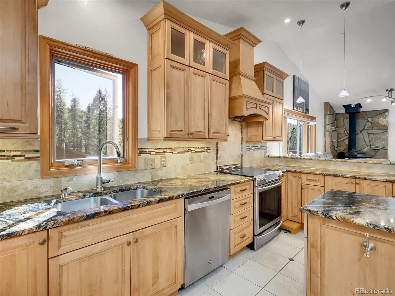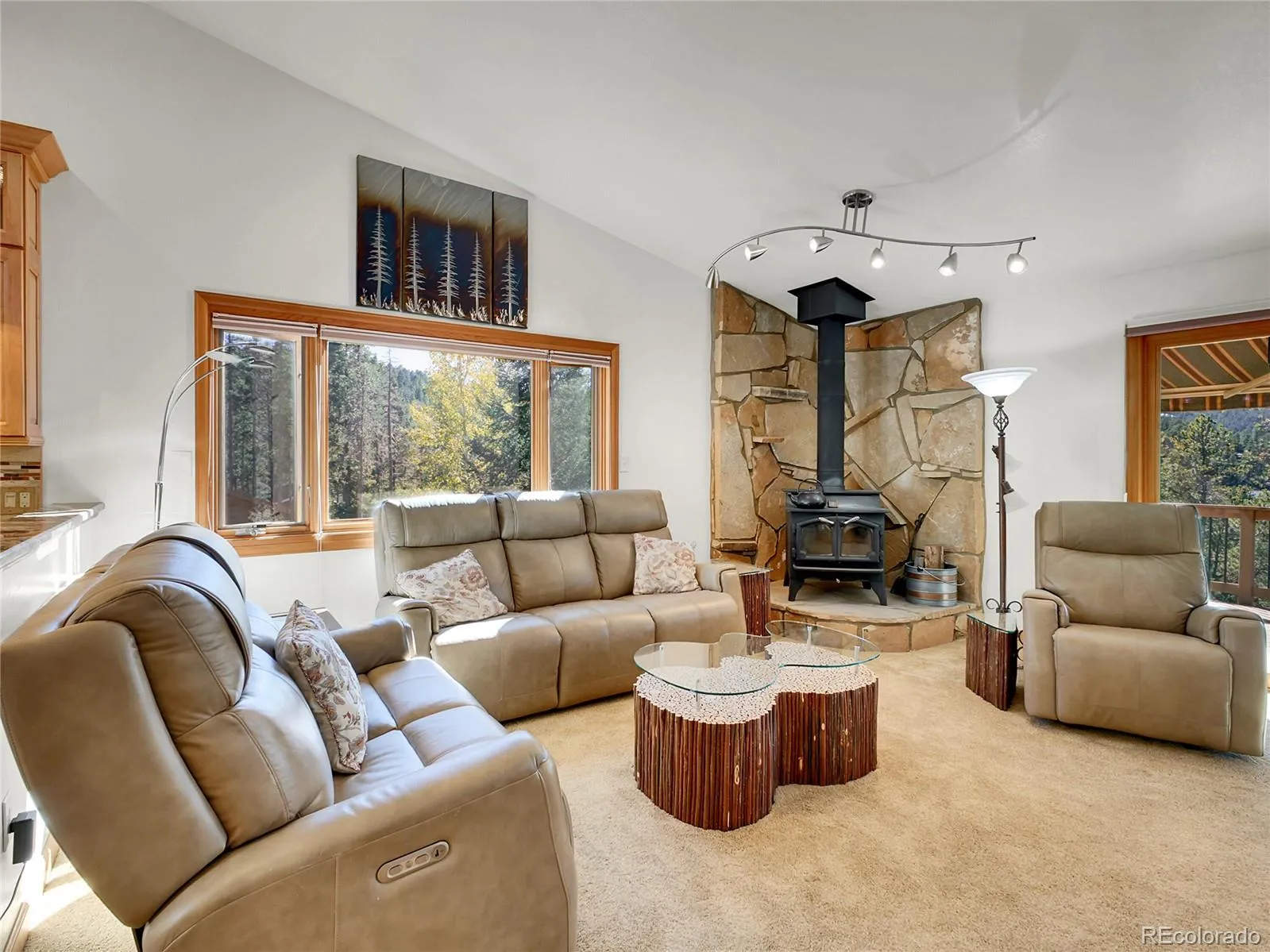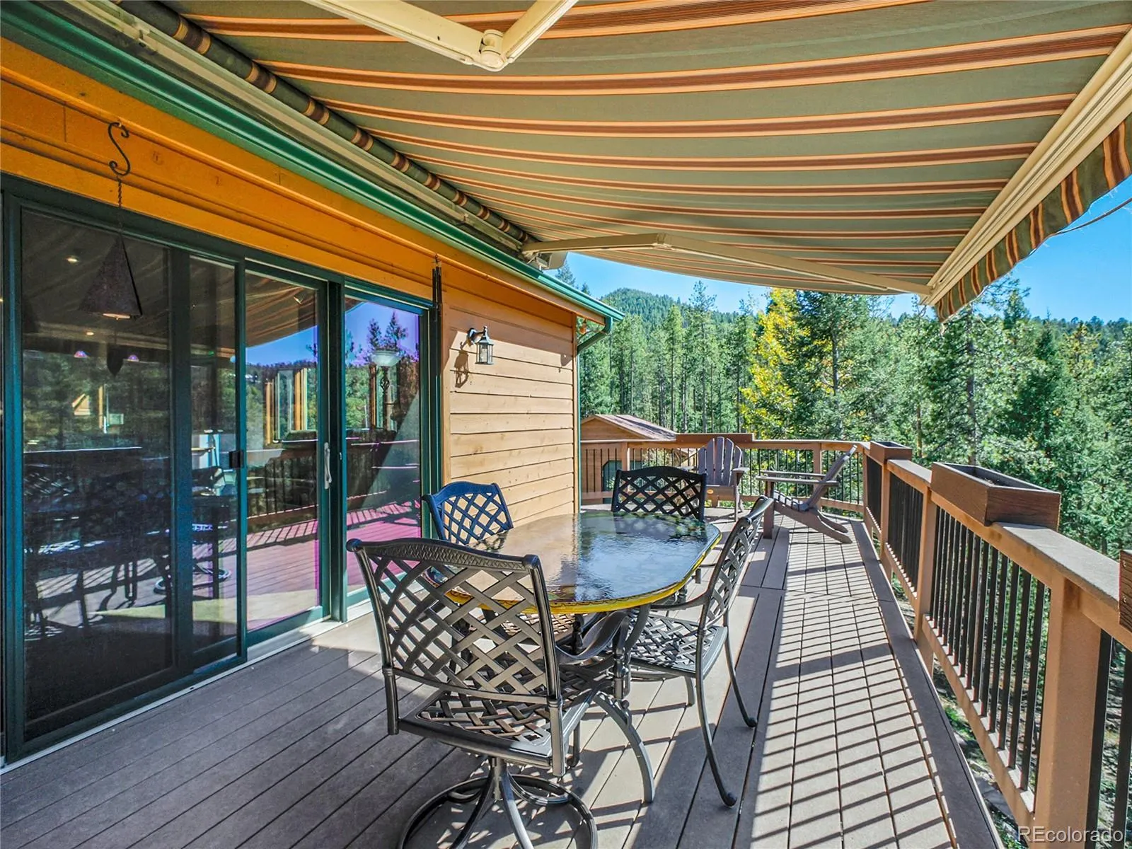 A mudroom welcomes you into the bright living room with a wood stove, vaulted ceilings, and large windows that frame the natural surroundings. Step onto the upper deck to enjoy peek-a-boo mountain views beneath a retractable awning with drop-down side shade—a perfect spot to unwind.