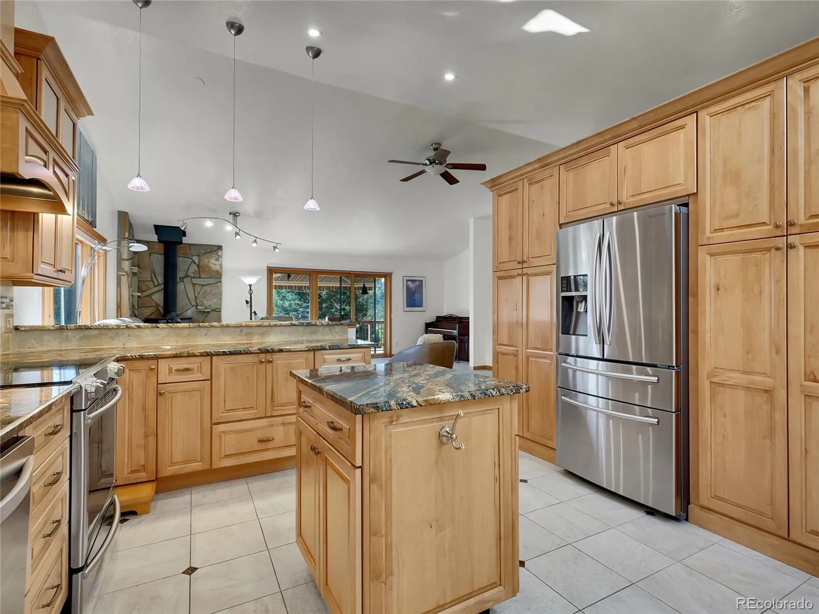 The remodeled kitchen features granite counters, stainless appliances, maple cabinets, a dining nook, and a pantry. The primary suite includes a walk-in closet and luxurious en suite bath with an oversized shower with dual heads, double vanity, and heated tile floors. A private office with two dedicated workspaces and access to a private deck completes the suite.
