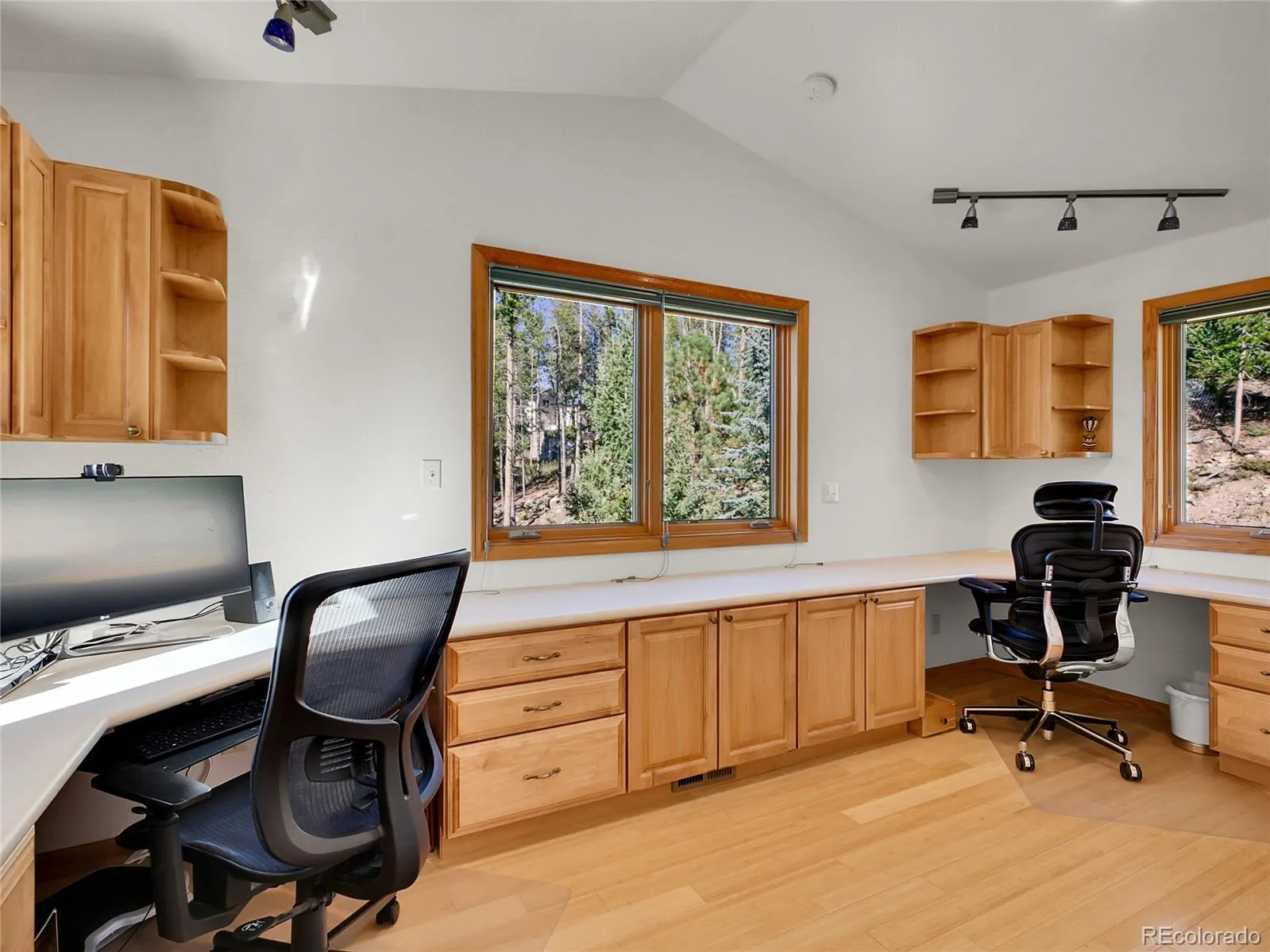 Two flex rooms offer endless options—whether for a hobby area, art studio, or additional office space. Throughout the home, you’ll find Hunter Douglas top-down/bottom-up blinds, built-in shelving, bay windows, heated bathroom floors, and two stone woodstoves that add warmth and charm.