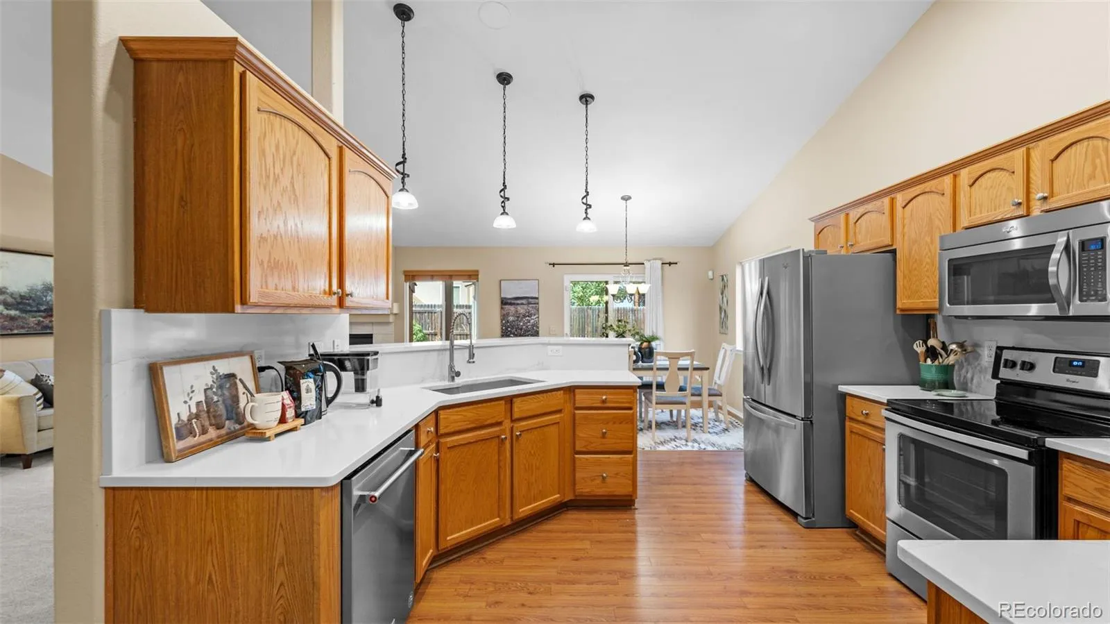 Step inside the open-concept main level, where vaulted ceilings and abundant natural light create an inviting atmosphere. The living room features newer carpet and a cozy gas fireplace, seamlessly connecting to the dining area and kitchen. The kitchen shines with quartz countertops, stainless steel appliances, and convenient access to the laundry room and attached two-car garage—recently painted and upgraded with shelving and a utility sink.