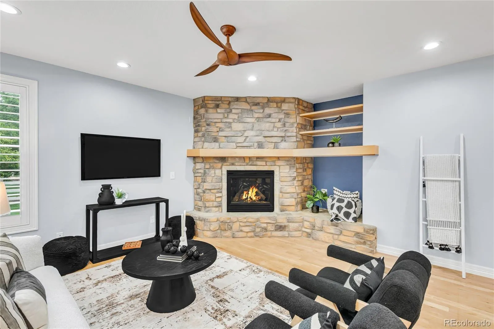 Step inside to find new white oak hardwood floors, a striking custom staircase with wrought iron railings, plantation shutters, and a fully repainted interior (2022). The gourmet kitchen has been elevated with GE Profile stainless steel appliances including dual wall ovens (2024), an induction cooktop with down-draft ventilation (2023), and a multi-function microwave (2025). A high-end Bosch dishwasher (2024) and Samsung fridge (2022) complete the package. The kitchen flows seamlessly into the family room with a stone fireplace, custom cabinetry, and direct access to the outdoor living space all perfect for entertaining.