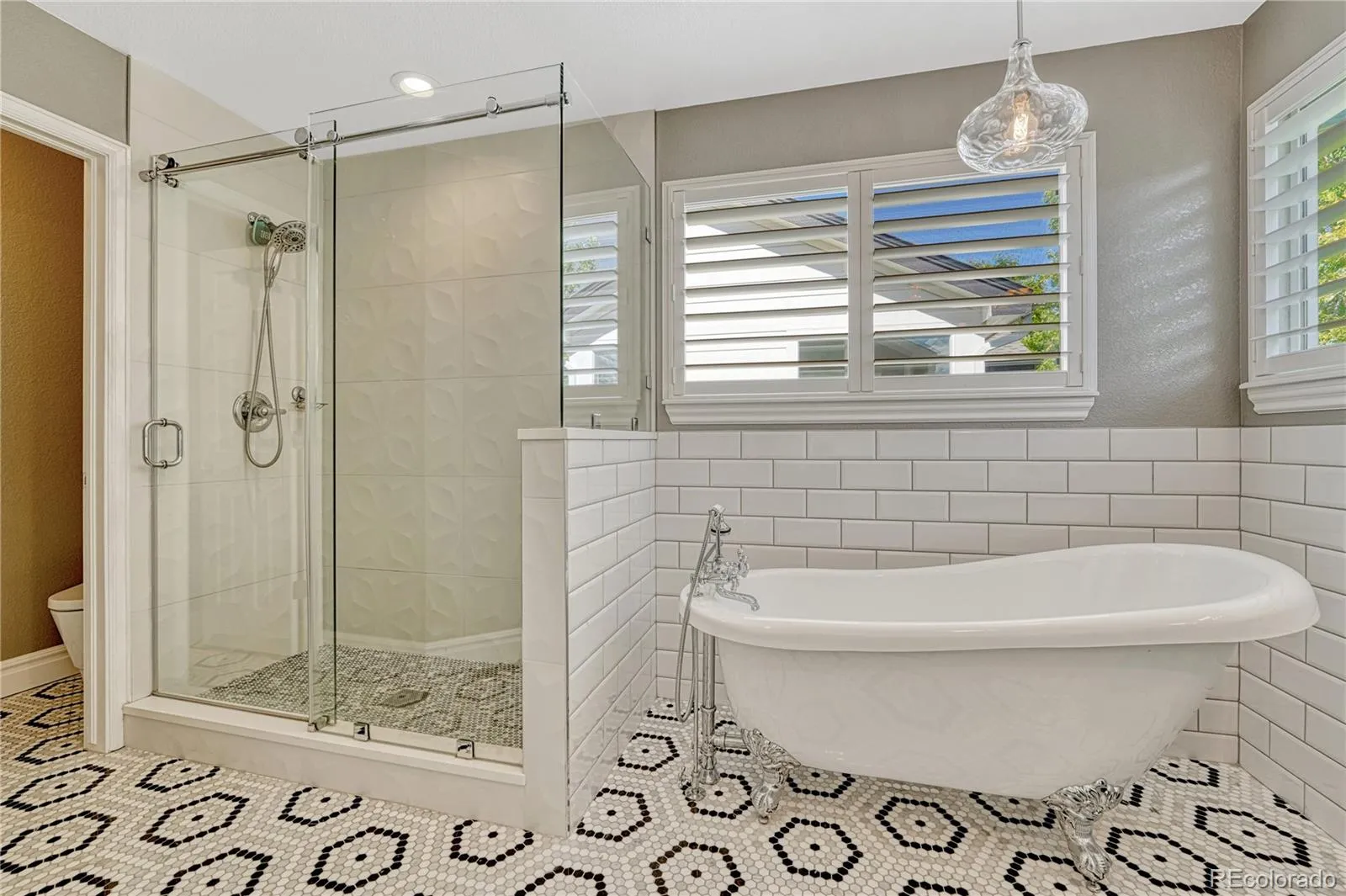 Upstairs you’ll find four bedrooms and a rare three bathrooms, including a beautifully renovated primary suite. The completely remodeled spa-like primary bathroom showcases a clawfoot tub, designer tile flooring, and a spacious walk-in shower. The finished basement extends the living space with a media room, wet bar, and plenty of room for guests or recreation. Outdoors, a large covered patio overlooks the private backyard, creating the perfect setting for year-round Colorado living.