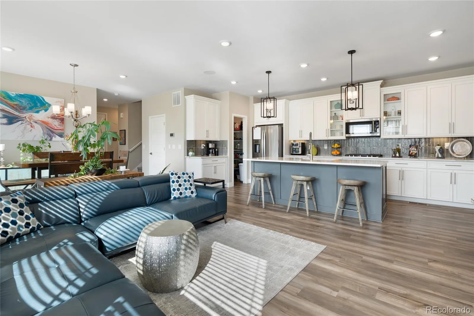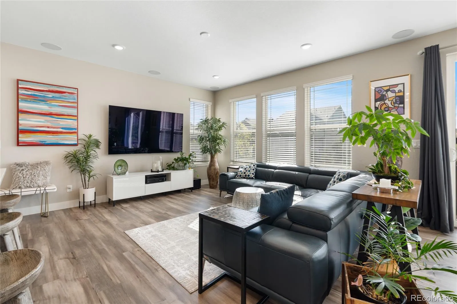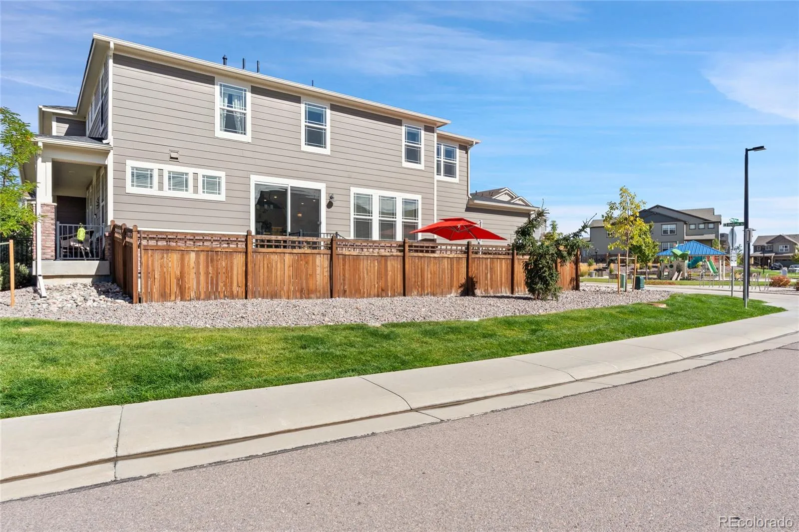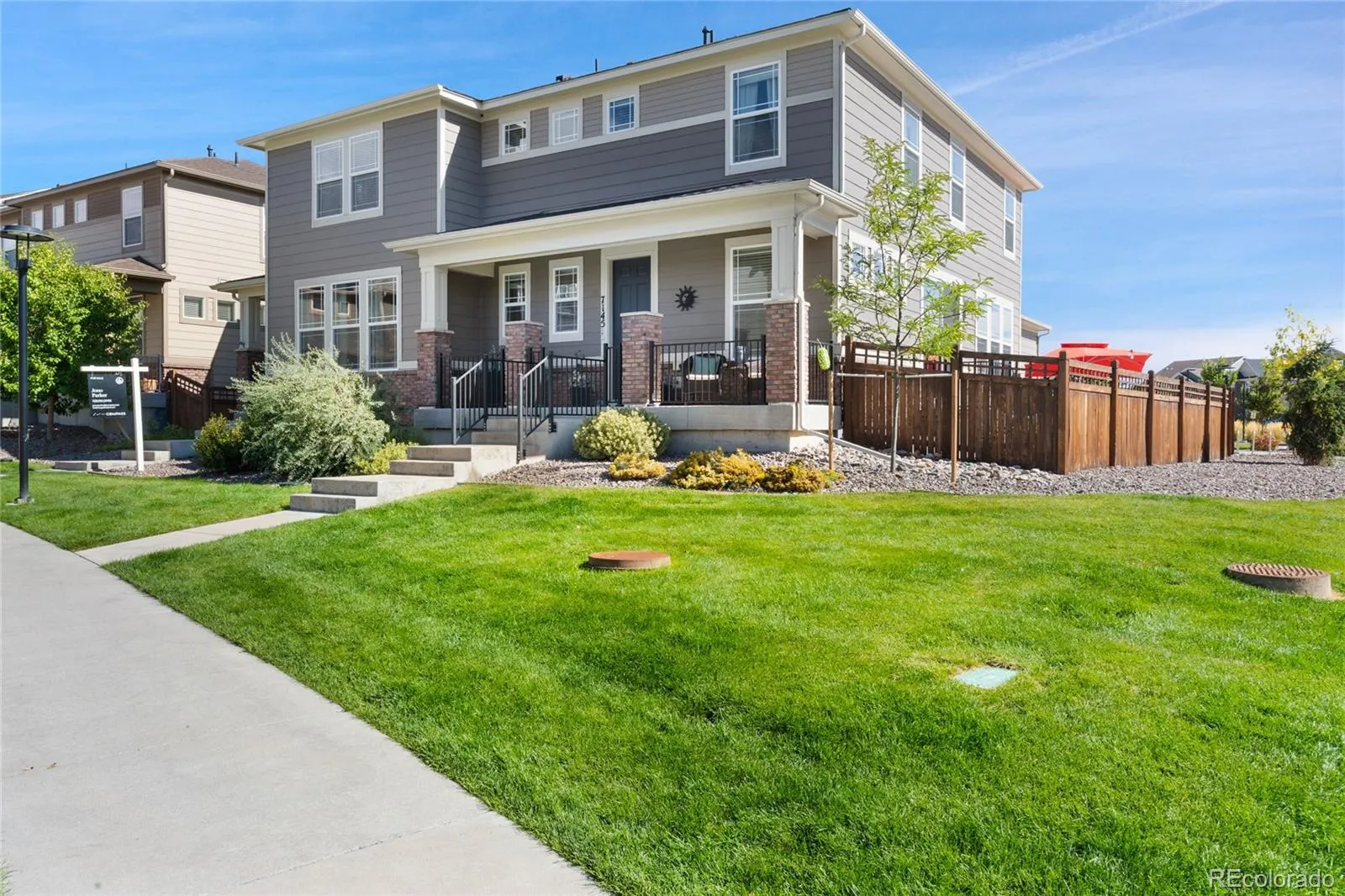 Impeccably maintained paired home in Castle Pines. West facing with covered porch & large front yard. Features 3 beds upstairs, a main floor office with frosted glass barn door! $75,000 in upgrades! Backs to a park & no neighbors on the south side of the home! Many windows throughout the home flood it with natural light. The open layout is ideal for comfortable daily living & entertaining w/a large living room that flows perfectly w/the dining room & kitchen (TV & surround sound is included!), modern fixtures, upgraded recessed lights, & 5” baseboards through-out. Abundant white cabinets boast crown molding, a generous island w/bar seating, a walk-in pantry & a butler’s pantry. The under-cabinet lighting highlights the Quartz countertops & tile backsplash that compliment the SS appliances: gas range, convection oven, microwave, dishwasher & refrigerator. Dining room provides a large sliding door to access the south facing extended fenced patio. This is a great place to host a barbecue, gathering, or enjoy your morning cup of coffee. The spacious primary suite hosts a sitting area, large walk-in closet w/upgraded Shelving, coffered ceiling, TV/mount, a private ¾ bath with dual sinks, Quartz counters & tile floor. Secondary bedrooms utilize the full bath w/dual sinks, tile floor, Quartz counters & linen closet, located nearby is the laundry with shaker cabinets & washer/dryer. The finished basement offers 9’ ceilings with flex space for a media room, family movie nights, kids’ playroom, office or guest room space with frosted glass door, & a large 3/4 bath. ALL TV’s included. The large 2 car garage comfortably fits a large pick-up truck & SUV. Energy saving features & smart technology; Ring door-bell, wifi enabled garage door, light switches & thermostat. HOA maintained front yard, one shared wall. Castle Valley in Lagae Ranch features two parks & a playground in a great location near schools, grocery stores, shops and a short distance to I-25! NO SHOWINGS UNTIL 10/6