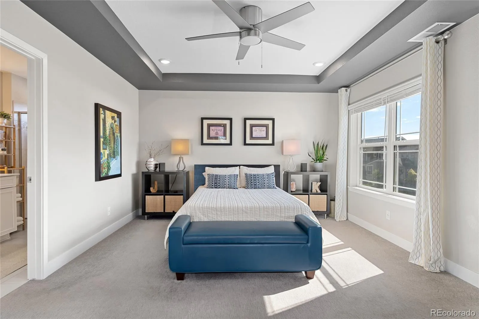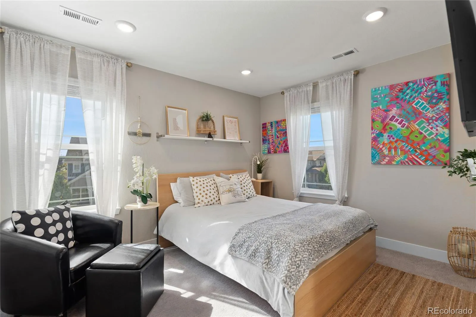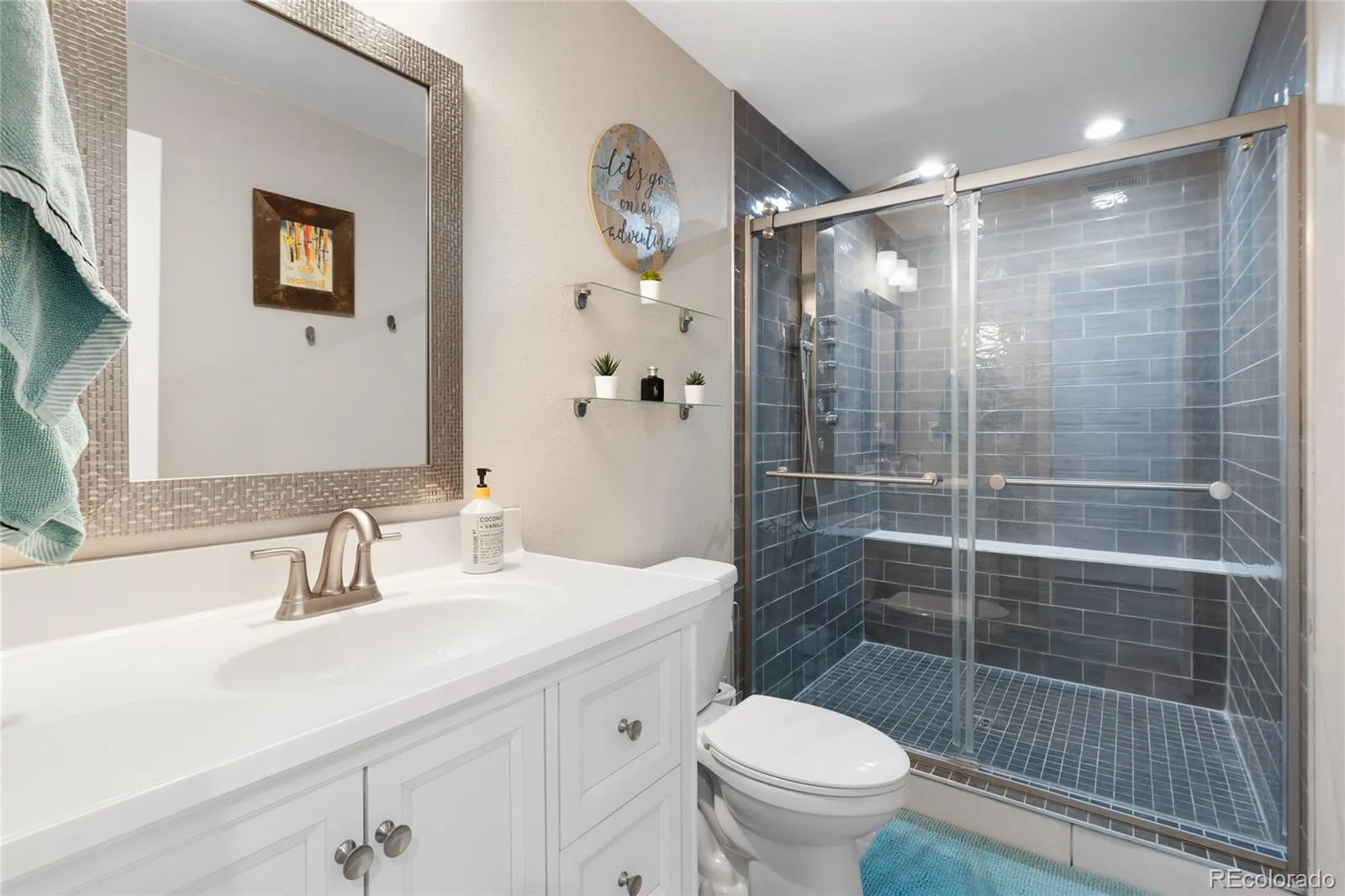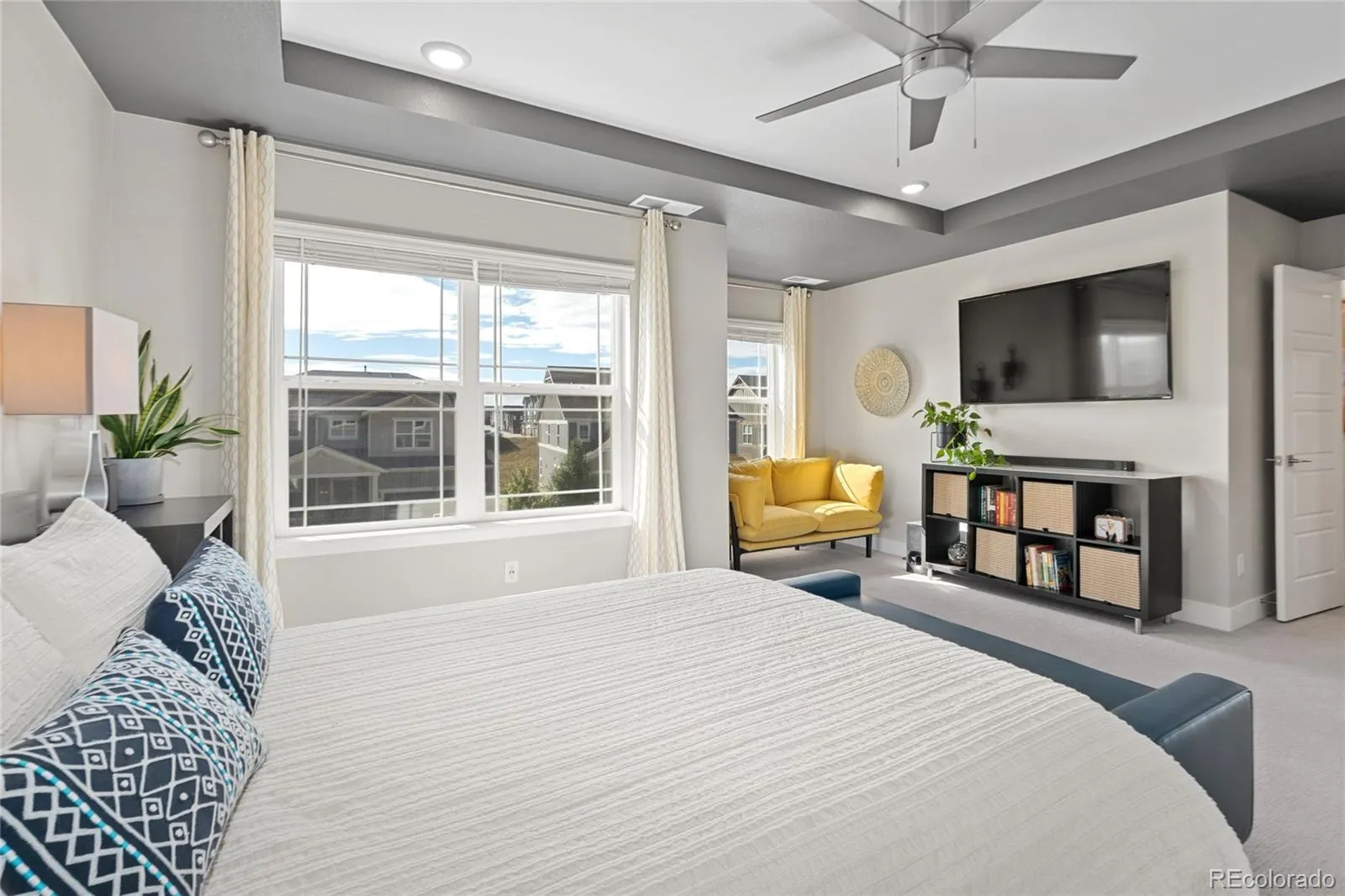 Impeccably maintained paired home in Castle Pines. West facing with covered porch & large front yard. Features 3 beds upstairs, a main floor office with frosted glass barn door! $75,000 in upgrades! Backs to a park & no neighbors on the south side of the home! Many windows throughout the home flood it with natural light. The open layout is ideal for comfortable daily living & entertaining w/a large living room that flows perfectly w/the dining room & kitchen (TV & surround sound is included!), modern fixtures, upgraded recessed lights, & 5” baseboards through-out. Abundant white cabinets boast crown molding, a generous island w/bar seating, a walk-in pantry & a butler’s pantry. The under-cabinet lighting highlights the Quartz countertops & tile backsplash that compliment the SS appliances: gas range, convection oven, microwave, dishwasher & refrigerator. Dining room provides a large sliding door to access the south facing extended fenced patio. This is a great place to host a barbecue, gathering, or enjoy your morning cup of coffee. The spacious primary suite hosts a sitting area, large walk-in closet w/upgraded Shelving, coffered ceiling, TV/mount, a private ¾ bath with dual sinks, Quartz counters & tile floor. Secondary bedrooms utilize the full bath w/dual sinks, tile floor, Quartz counters & linen closet, located nearby is the laundry with shaker cabinets & washer/dryer. The finished basement offers 9’ ceilings with flex space for a media room, family movie nights, kids’ playroom, office or guest room space with frosted glass door, & a large 3/4 bath. ALL TV’s included. The large 2 car garage comfortably fits a large pick-up truck & SUV. Energy saving features & smart technology; Ring door-bell, wifi enabled garage door, light switches & thermostat. HOA maintained front yard, one shared wall. Castle Valley in Lagae Ranch features two parks & a playground in a great location near schools, grocery stores, shops and a short distance to I-25! NO SHOWINGS UNTIL 10/6
