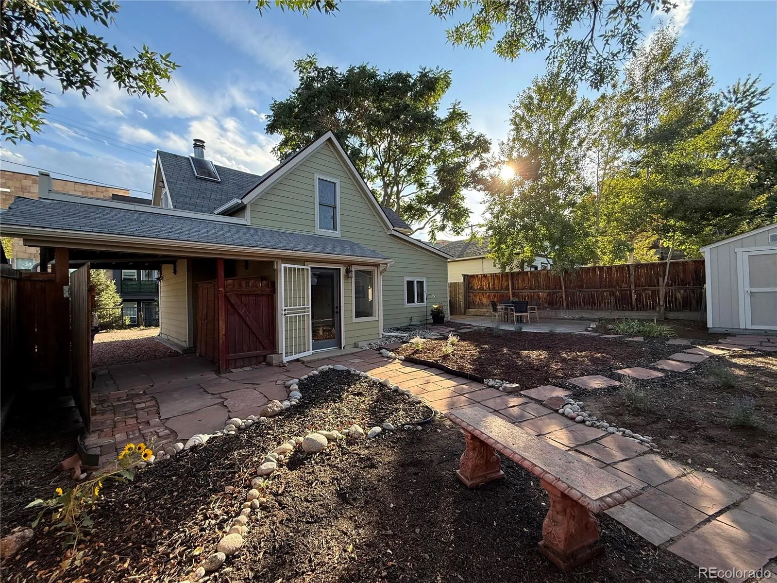 Here is a chance to own a little piece of old town Highlands. Located in the only historically-protected block in Jefferson Park, the core of this hidden gem was built in 1886 and was home to workers of the Zang Brewing Company. It has survived Denver’s growth for well over a hundred years, including the relocation of River Drive. Now with all its modern updates, the house sits tucked in a private one-way alley (the original River Drive) making it the perfect little hide-away in the city. The carport area has a cedar shed and can hold one, maybe two tandem cars (backed-in) and the city provides on-street permits for River Drive. Enter through one of the three gates to your fully fenced-in yard – the right size for raised garden beds, pets or just enjoying the view from the patio. The yard has an 8×10 ft. shed for storing tools and seasonal items. Step into a small foyer for storing your daily stuff (ski/snowboard racks are nearby in the cellar area). The living room (and above it) is the original 1886 structure with wood-burning fireplace. The space is surprisingly flexible. Put focus on the fireplace, optimize for TV watching on one of the two walls, or make a dining area or bar just off the pantry. The kitchen has an extra dining space that’s been used as a cozy family/TV room too. From here, you’re steps away from the grill area and patio. Walk up the original stairs and enter into two, open (yet still conforming) bedrooms, full bathroom, and laundry area. This space is perfect for a single person or couple! With original wood floors, six windows and six skylights, you’ll feel like you’re floating in a tree house. Step out onto the deck and enjoy what’s left of the city views. Technically, you can see the Cash Register Building from the bathtub, but that’s a stretch. All the same, relax and enjoy some elevated space at your little hidden home in the city. Or if you live primarily outside of Colorado, make this your perfectly-placed Denver pier de terre.