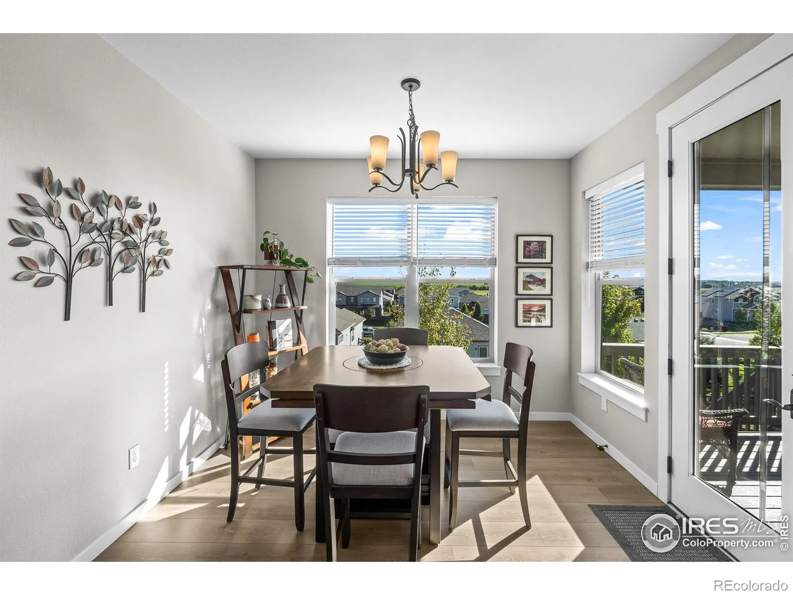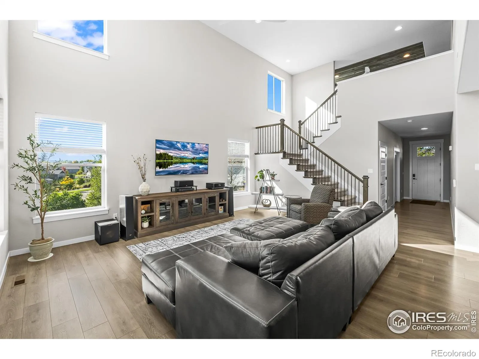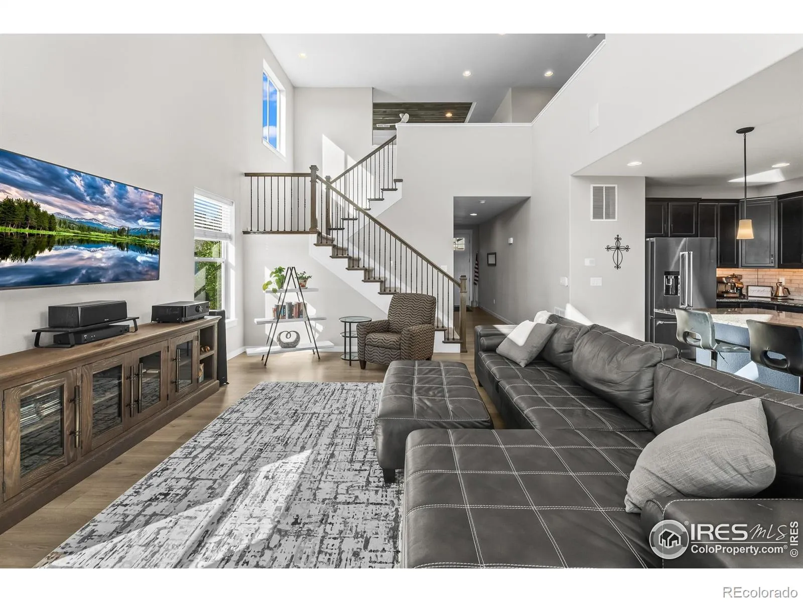 From the moment you enter the front door of this 2-story, 4-bd, 4-ba home, you will note the open concept design, which seamlessly connects the living, dining, & kitchen spaces. Breathtaking PANORAMIC views of the snow-capped Rocky Mountains from ALL 3 levels of this home will have you sold. The gourmet kitchen is complete with stainless steel appliances, a gas stove, granite counters, soft-close cabinets, an expansive island, hard surface flooring & a spacious walk-in pantry. The living room highlights floor-to-ceiling windows that bathe the space in natural light, surround sound speakers creating an immersive audio experience, & an overhead Haiku smart ceiling fan that optimizes airflow for complete comfort. An office with French doors, views to the front of the home & mudroom sitting conveniently next to the garage, completes the main floor! Upstairs, the split floor plan gives the primary suite privacy. This suite also features a tray ceiling, Haiku fan, double walk-in closets, and an ensuite with custom tile, a walk-in shower & oversized soaking tub designed for ultimate relaxation. The upstairs also boasts 2 additional bedrooms, a full bathroom, & an oversized loft with wood floor, Barnwood tray ceiling, Haiku fan, & a picture window showcasing the mountains, perfect for a 2nd office or workout area. Not in the mood to go out? Head to your walkout basement featuring a large rec room, a “hidden” speakeasy, w/ custom bar & Kegerator. A 4th bedroom & storage room complete this space. The 4-car garage has epoxy floors, & ample storage. The almost-quarter-acre fully fenced backyard, on auto drip, backs to HOA open space & includes raised beds ready for your gardening pleasure, outdoor speakers, & even a hot tub! Paid solar panels, keep bills to a minimum. This neighborhood has a pool, clubhouse & is close to trails, lakes, & the TPC golf course. List of features in the documents section.