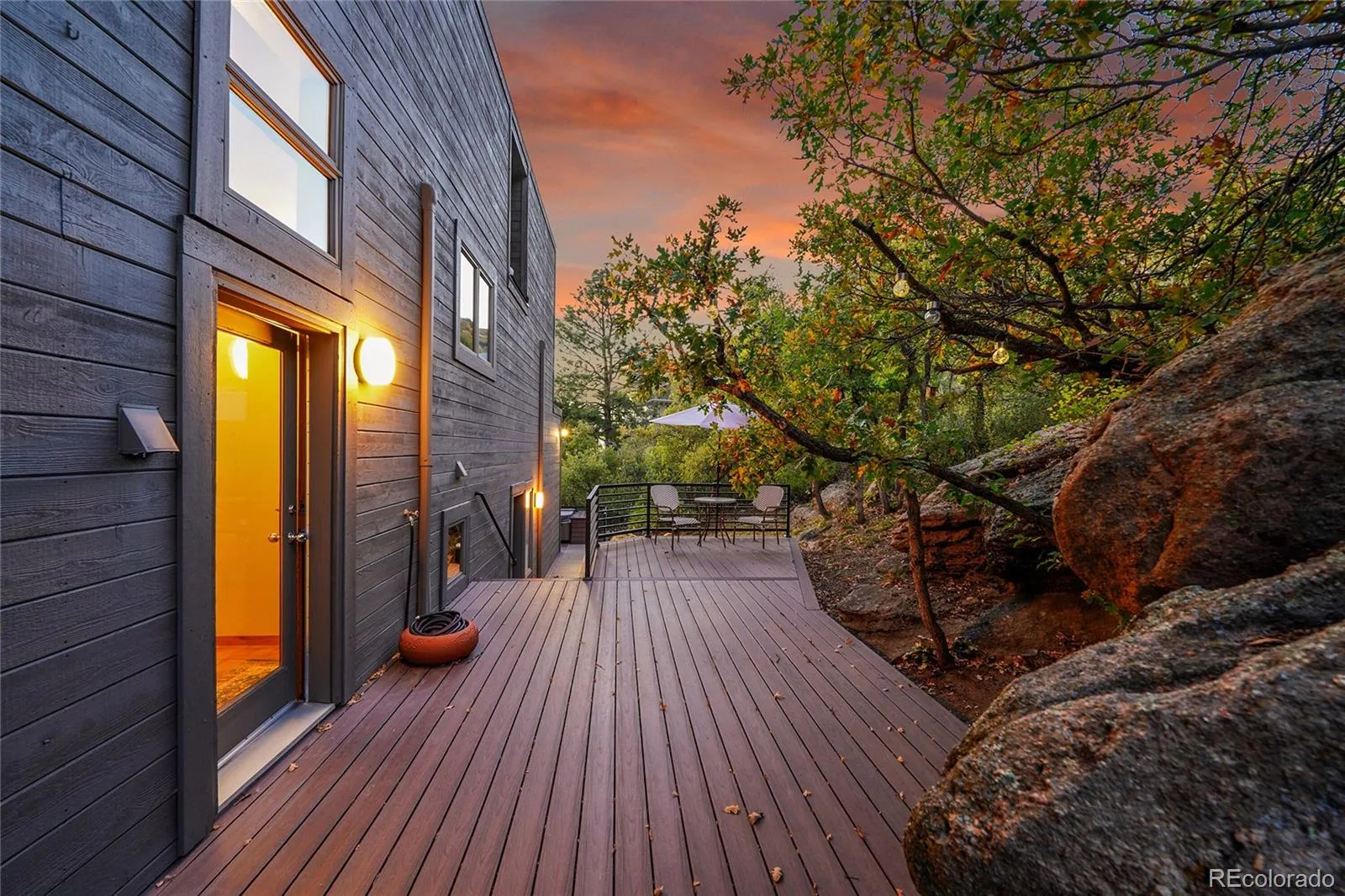 *OPEN HOUSE Sunday 10/26 12-2* Secluded, scenic, and undeniably Colorado—this one-of-a-kind 5-bed Oak Ridge stunner embodies one of Castle Rock’s most picturesque neighborhoods, with mature trees, rolling hills, and breathtaking mountain views. The lower-level foyer welcomes you with a nearby private guest suite with 3/4 bath, a light-filled sunroom atop terracotta tile, coat closet, and garage access. A sunlit haven, the main-level features vaulted ceilings and elegant wooden-framed windows, creating an airy, luminous atmosphere. The eat-in kitchen showcases granite counters, stainless steel appliances including a glass-top range, and a charming dining nook with scenic views. The living room is a quintessential Colorado gathering space, anchored by a slate mosaic wood-burning stove, framed by floor-to-ceiling windows, with direct access to the deck—ideal for entertaining and savoring the surrounding mountain vistas. Your private sanctuary awaits in the primary suite, with a full bath featuring double sinks, generous closet space, a soaking tub, and direct entry to the deck and backyard. The upper level includes a private suite with an en suite full bath, while two additional bedrooms share a well-designed 3/4 bath. A bright loft perfect for a home office plus a practical laundry area with storage complete the upper-level. Step outside to your own private mountainside retreat, where multiple seating areas offer space for quiet reflection, lively conversation, or al fresco dining—all set against sweeping Colorado vistas. Mature trees, exposed rock, and a hot tub create a naturally inviting space, making every moment feel like a getaway. Spend warm days at the community pool and tennis courts! Experience Oak Ridge living—sip perfect brews at Lost Coffee, take in the charming streets of historic downtown Castle Rock, take daily hikes steps from home, or enjoy shopping at the outlets just minutes away via I-25.