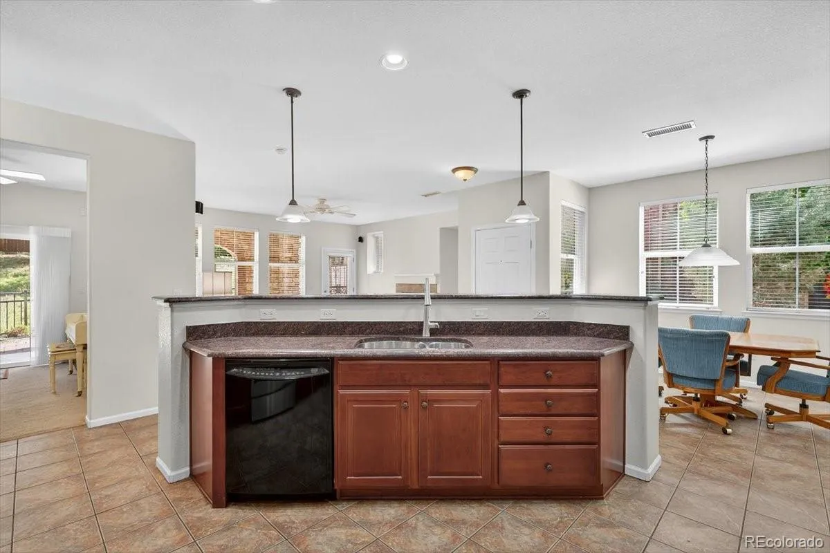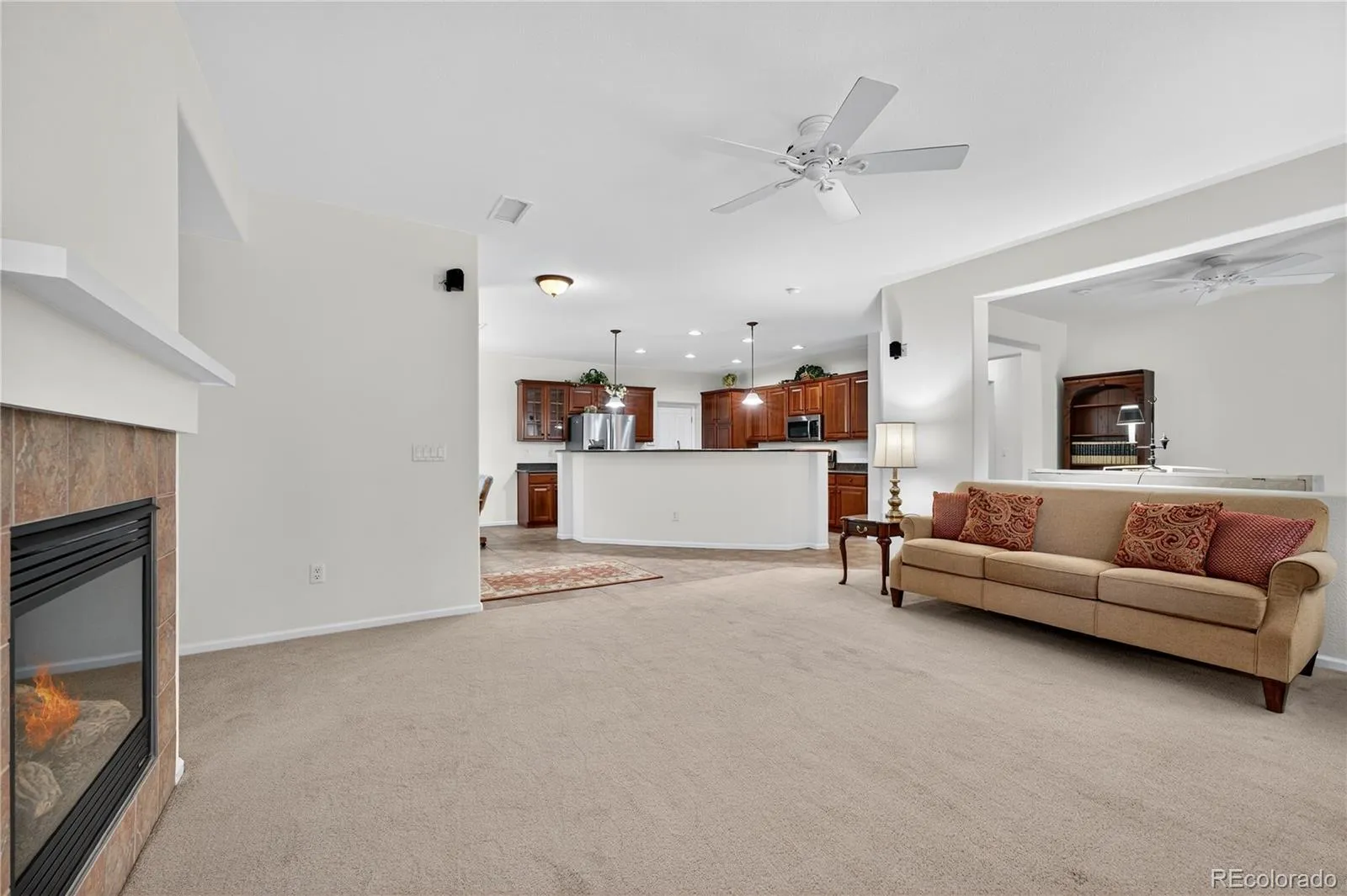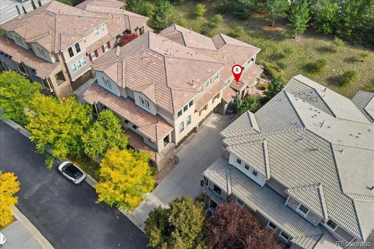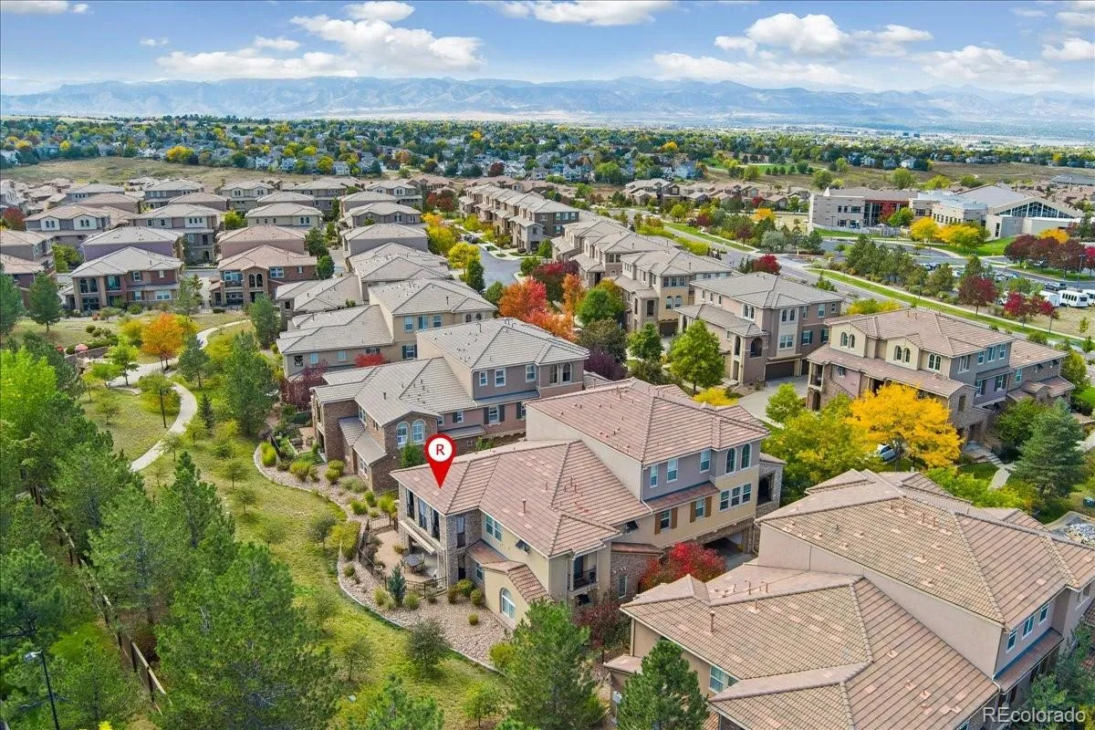 Luxurious one-level living at its finest awaits in this townhome with mountain views in the community, perfectly situated in a prime Highlands Ranch location. This highly desirable main floor end unit offers privacy, tranquility, and convenience all in one. A secluded fenced patio with a garden area and an electric retractable awning creates the perfect outdoor retreat, while the quiet neighborhood is enhanced by neighbors who look out for one another. Inside, the open layout welcomes you with a cozy gas fireplace, a den plus a living room, and direct access to the expansive brick patio from both spaces. The chef’s kitchen is beautifully designed with warm wood cherry cabinetry, upgraded stainless steel appliances, a pantry with sliding drawers, and a convenient door leading directly to the garage. Two spacious bedrooms provide comfort, with the primary suite featuring plush carpeting, a large walk-in closet, and a fantastic 5-piece en-suite bath. Additional highlights include newer furnace and hot water heater, custom kitchen cabinets and drawers, epoxy garage floor with abundant built-in storage, and surround sound system with mounted speakers in the family room. Minutes from King Soopers, shops, dining, and major roads, this move-in-ready gem offers the perfect blend of comfort and location.