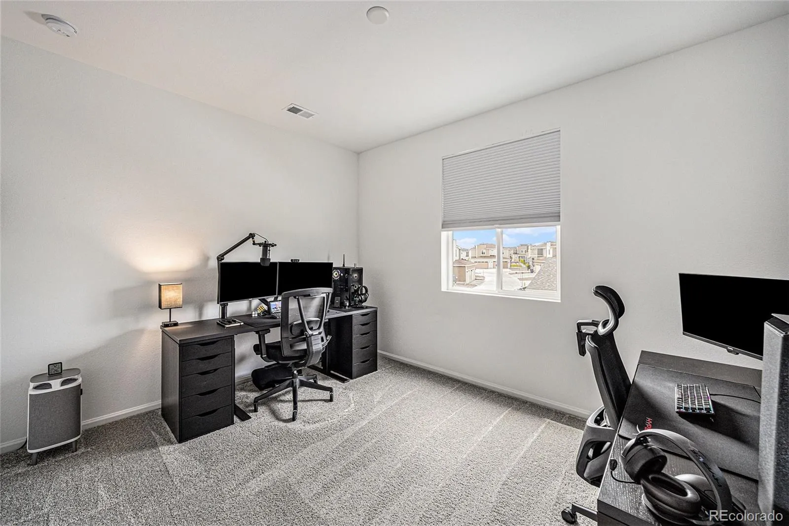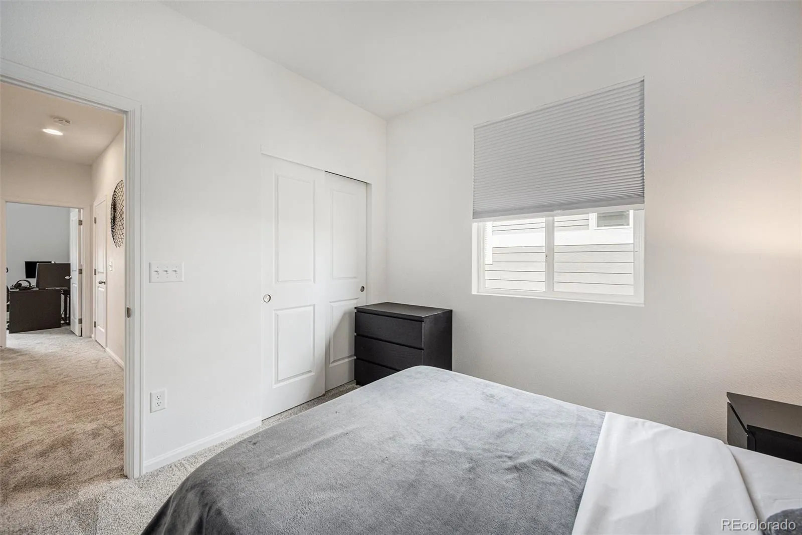 Upstairs, the luxurious owner’s suite boasts an expansive walk-in closet and a private bathroom with double sinks. Additional features include a convenient laundry closet and two more spacious bedrooms. Modern touches such as prewiring for pendant lights and ceiling fans, GE appliances, quartz countertops, and cordless cellular shades enhance the home’s contemporary feel.