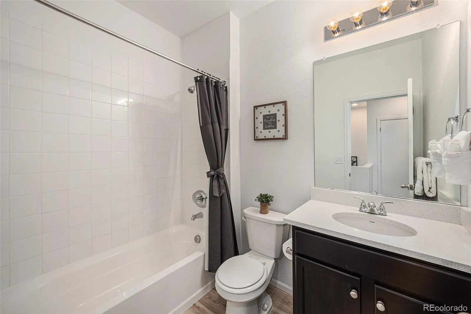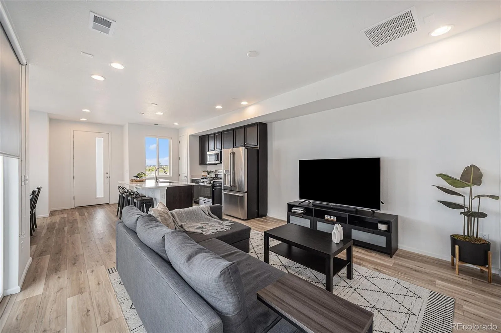 Welcome to 46 N Trussville St, Aurora, CO 80018. This exquisite 3-bedroom, 2-bathroom townhome spans 1,470 sq ft and offers a blend of modern convenience and luxury. As you step onto the charming covered front porch, you’ll be welcomed into an inviting open floor plan featuring a kitchen with a large pantry, center island, and adjacent dining room. The main floor also includes a spacious living room, powder room, relaxing covered side patio, and a two-car garage.