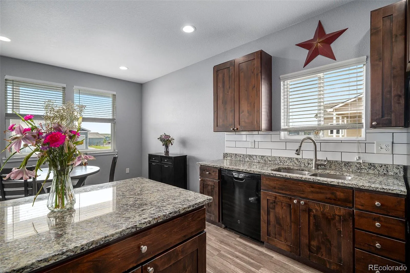 Step inside to an open and inviting floor plan, where the living, dining, and kitchen spaces flow seamlessly. The kitchen features granite countertops, ample cabinetry, and a layout designed for gathering, while custom tile work throughout the bathrooms adds a polished, high-end touch.