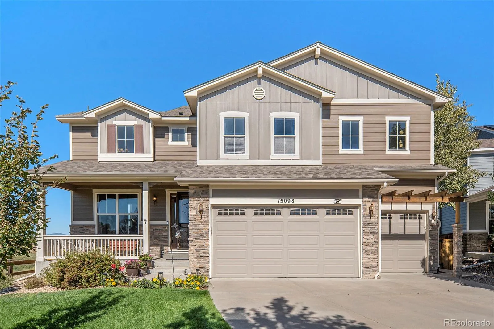 Welcome to this beautifully updated two-story home in the highly sought-after The Haven neighborhood. From the moment you walk in, you’ll be greeted by an open and bright floor plan that blends comfort and sophistication. Gleaming hardwood floors flow throughout much of the main level, complemented by fresh interior and exterior paint that give the home a crisp, modern feel. The spacious kitchen features a large center island, newer backsplash, sleek stainless-steel appliances, a gas cooktop, and abundant cabinetry—ideal for both everyday living and entertaining. The adjoining family room is anchored by an updated double-sided fireplace that also enhances the warmth of the main-floor office. A main-floor bedroom and stylish ¾ bath offer convenience and flexibility for guests or multi-generational living. Upstairs, the expansive primary suite provides great views and a spa-like five-piece bath with soaking tub and large walk-in closet. Three additional bedrooms complete the upper level—one with its own private full bath—plus another full bath for added functionality. Enjoy the Colorado outdoors on the back patio, now enhanced with a new electric awning for shade and comfort. Additional updates include a new roof in 2024 and updated insulated garage doors, adding both efficiency and curb appeal. The attached three-car garage offers ample parking and storage. The home also features a large unfinished basement, offering endless possibilities—finish it for additional square footage or use it for storage, a home gym, or hobbies. Neighborhood amenities include scenic walking and biking trails, open spaces, and a community pool included with the HOA—perfect for enjoying Colorado’s beautiful weather. Located within the award-winning Adams 12 School District and served by Silver Creek Elementary, this home offers a rare blend of quality, comfort, and exceptional updates in one of the area’s most desirable communities.