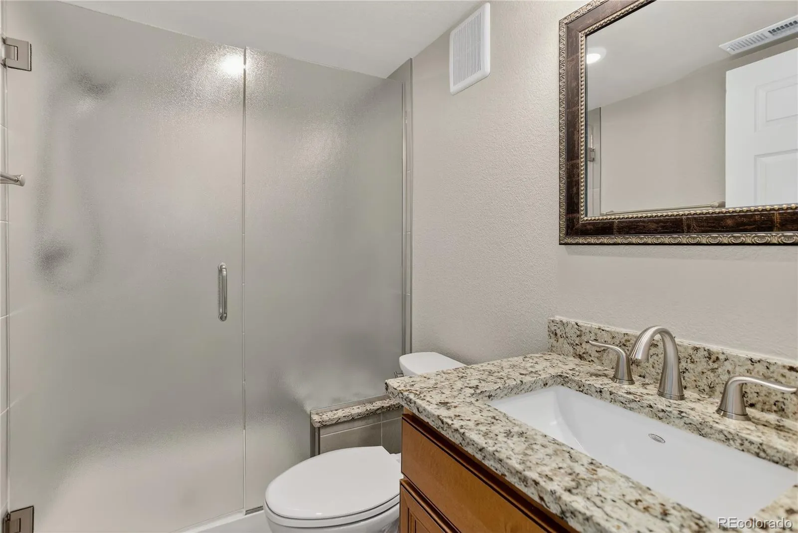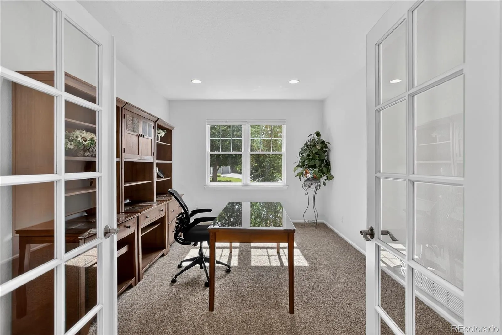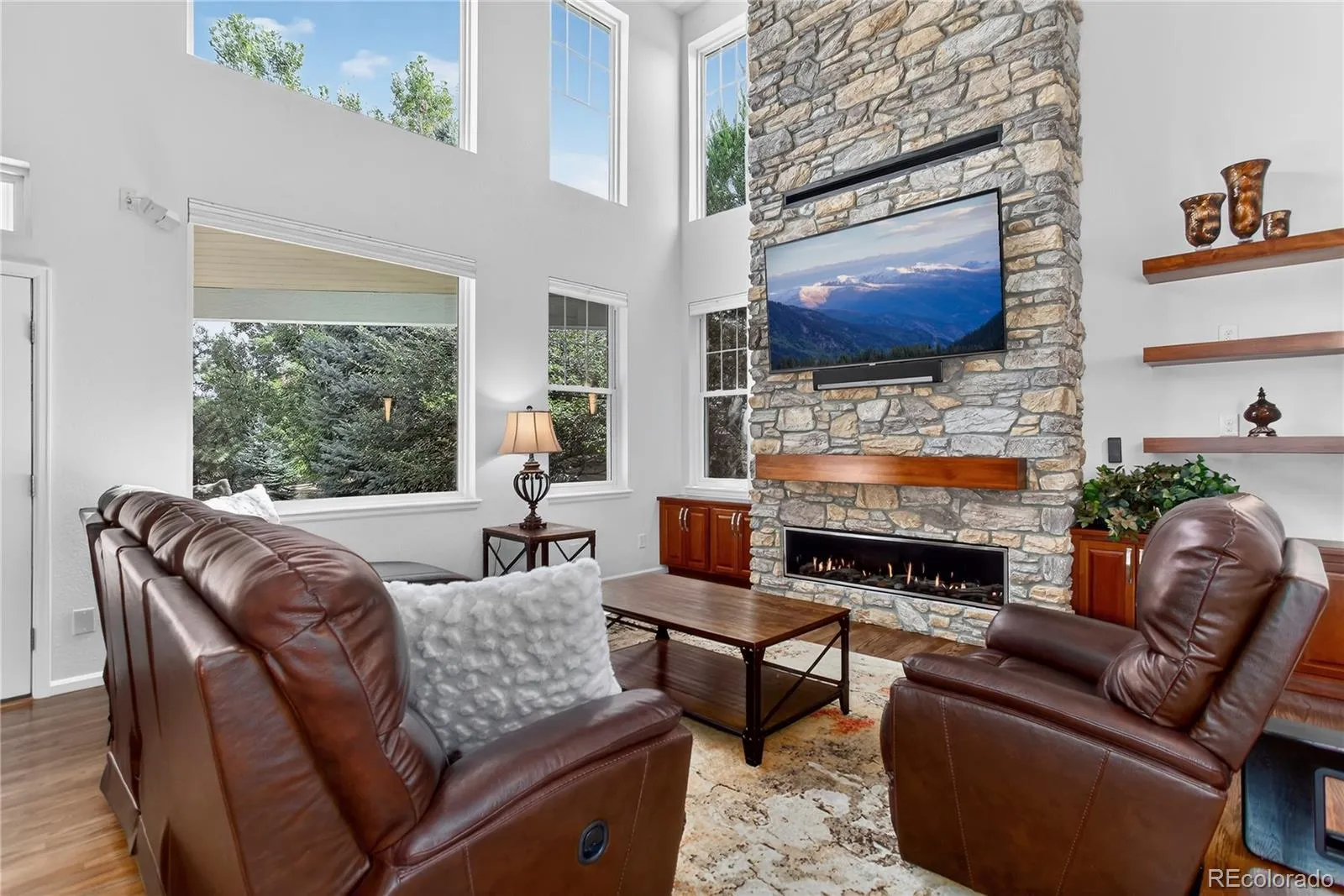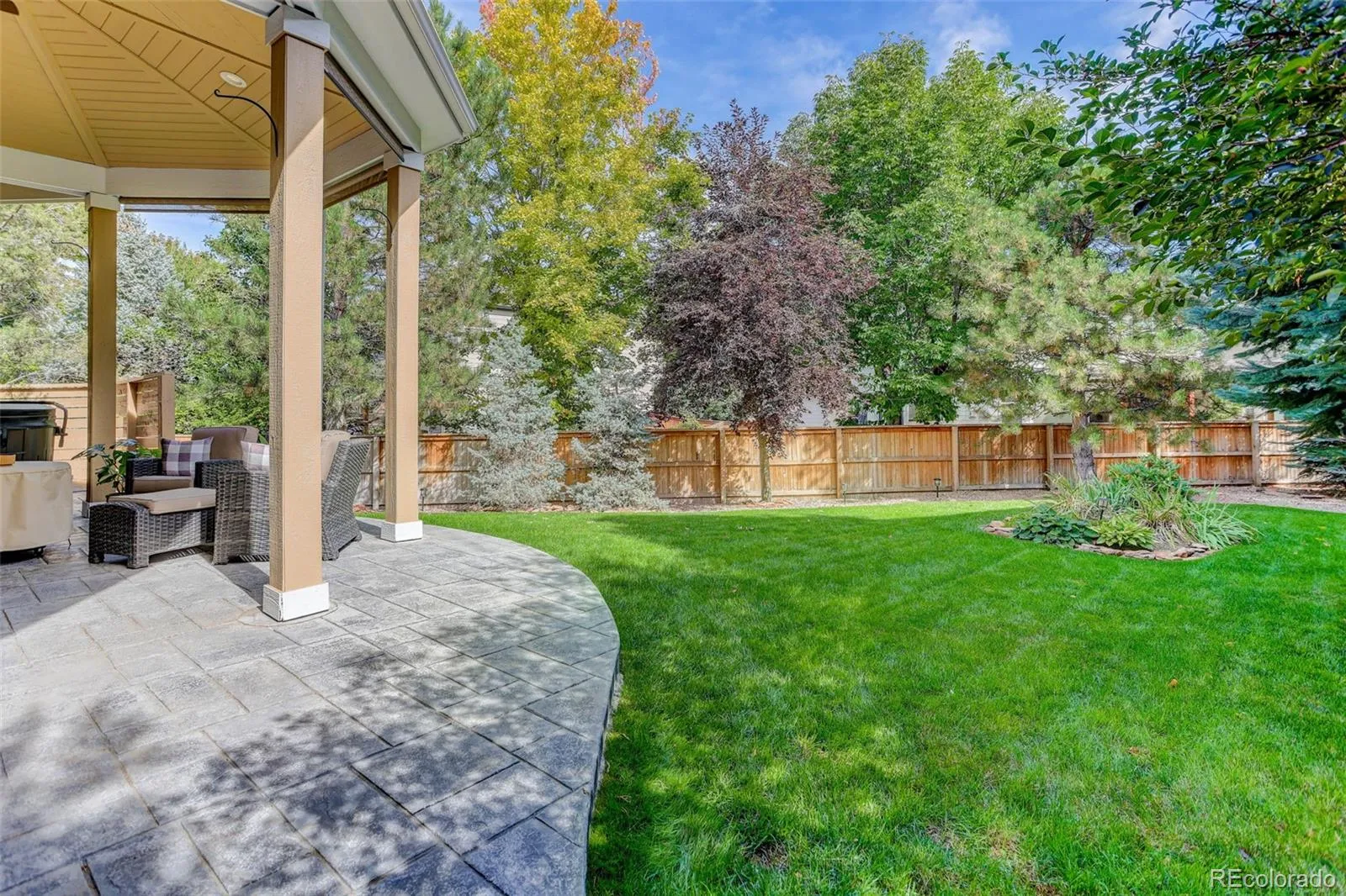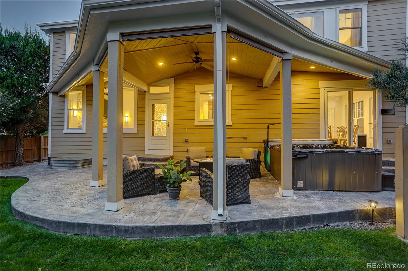 The ideal floor plan offers four bedrooms upstairs—two guest rooms sharing a full bath, one with a private ensuite, plus an additional conforming bedroom in the finished basement. The main floor office with glass French doors provides the perfect setting for remote work or study. The finished basement is designed for entertaining and relaxation, featuring a spacious rec room with a home theater and wet bar, a ¾ bath, and a versatile bonus room, plumbed with a utility sink—ideal for a hobby space, gym, or future bedroom addition. Enjoy outdoor living at its finest on the custom covered patio, complete with a spa and the beautifully landscaped yard is filled with mature trees and lush greenery. This peaceful oasis invites you to enjoy Colorado’s four seasons! Enjoy the fully owned solar panels for energy efficiency and low utility bills. This home blends designer quality, functional luxury, and unbeatable location, this Stonegate gem is it!