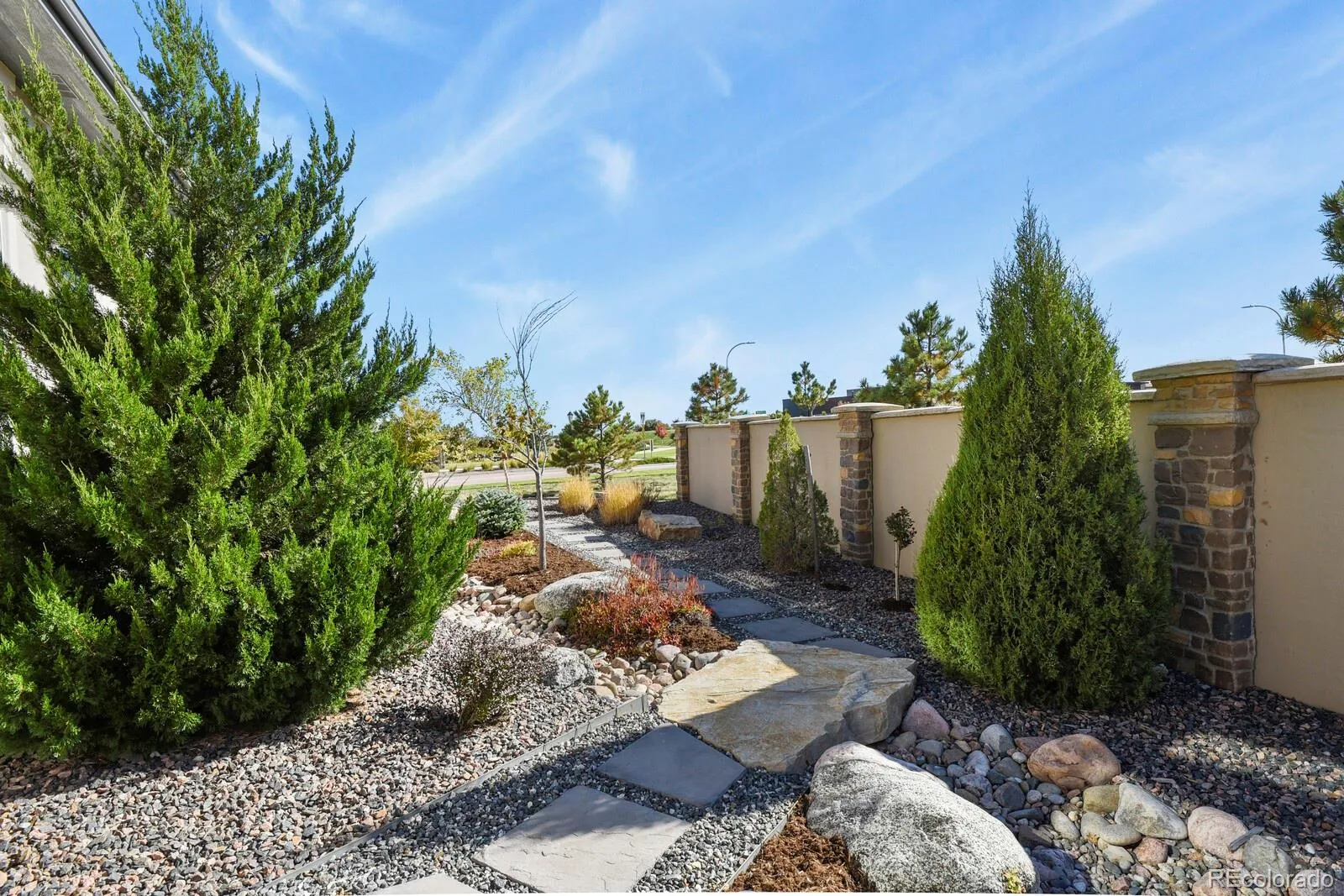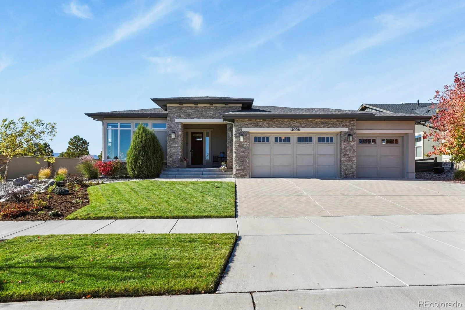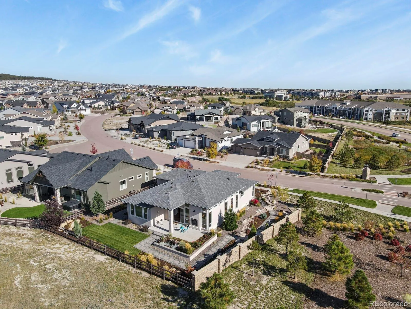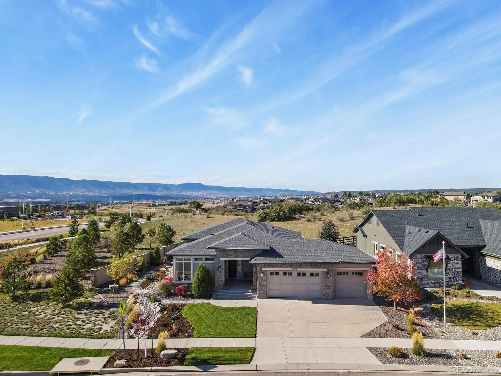This Saddletree semi-custom home on a corner lot in the sought after Cordera neighborhood has beautiful views of Pikes Peak, Air Force Academy, & the front-range! This ranch level home features four bedrooms, three bathrooms, & a three- car garage. The open floor plan with high ceilings, seamlessly connects the living, dining & kitchen areas, creating the perfect space for both relaxing & entertaining. Meticulously cared for, this home has stunning hardwood floors & an abundance of natural light that pours in from the floor- to-ceiling windows. Enjoy Pikes Peak sunsets from the comfort of your living room & cold nights in front of the stunning floor- to- ceiling stone gas fireplace. Double sliding glass doors lead to the immaculately cared for private backyard, extending your living space & offering additional scenic views of the open space behind the home. The custom kitchen boasts a leathered granite island, quartz countertops, glass front cabinets with interior lighting, soft- close cabinets/drawers, modern tile backsplash, stainless steel hood, pantry & top of the line Kitchen-Aid appliances. A main- level primary bedroom has an adjoining spa bathroom with double vanity, marble countertops, tile flooring, linen closet & a large walk-in closet that leads to the main level laundry/mudroom The over-sized lower level family room has a full wet-bar with modern finishes & refrigerator, two additional bedrooms & a full bathroom. Bonus- additional unfinished space allows for a 5th bedroom & additional bath. The covered backyard entertaining space has a custom stone water feature, a double-sided gas fireplace, stone walkways, elevated flower beds, & a lush lawn. Upgrades include: interior/exterior surround sound, custom stone window wells, gas line for grill, 220 electrical in garage, sink in laundry room, automatic/smart blinds, & modern lighting throughout. Home adjacent to extensive trail systems, neighborhood parks, community center/ pool, & D20 schools. A must see!