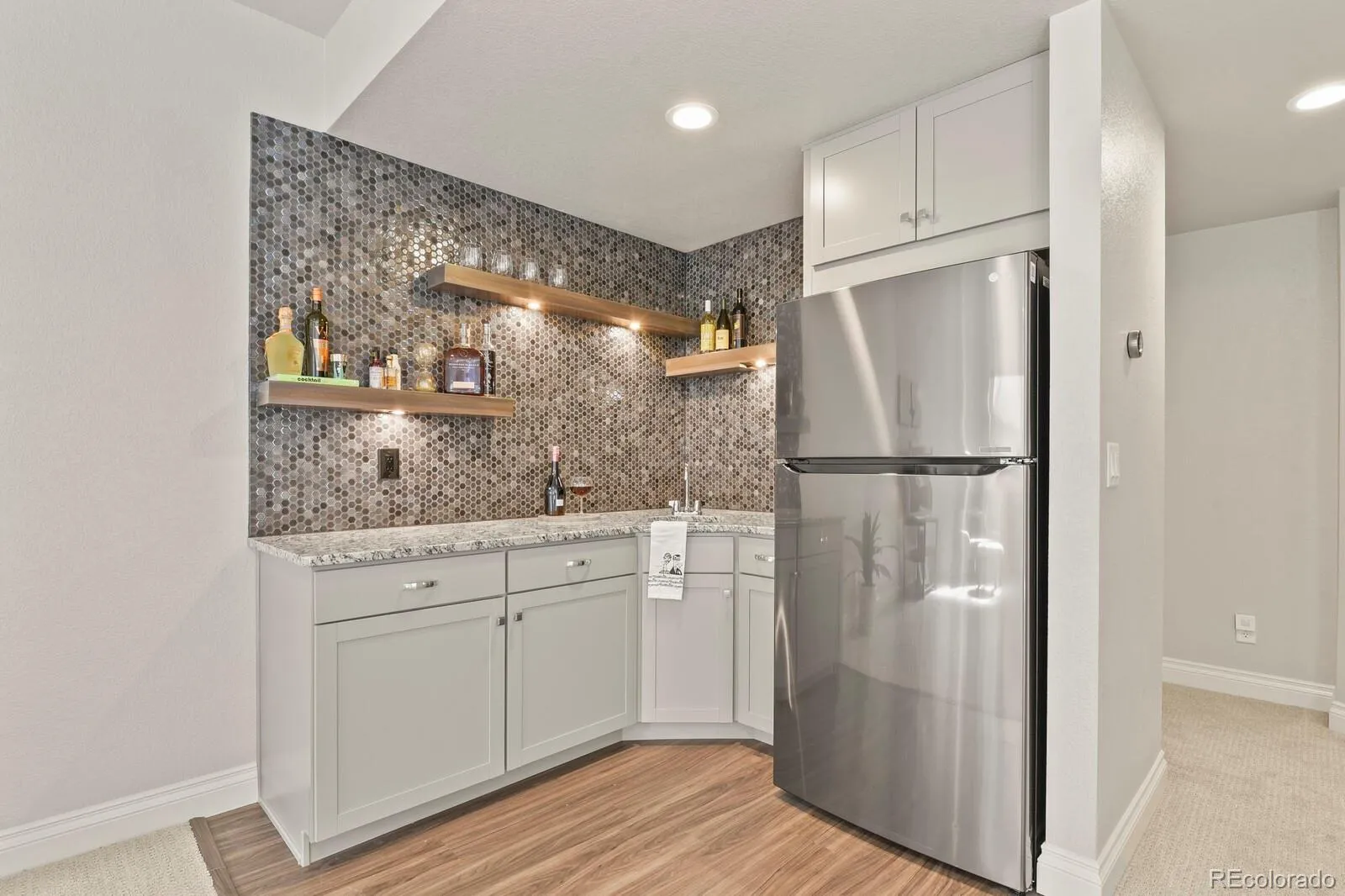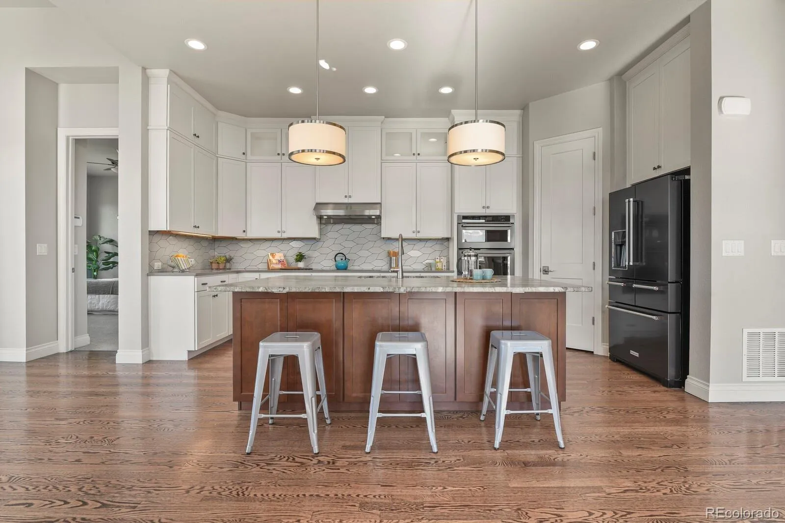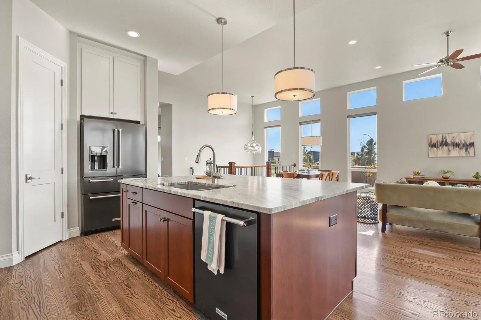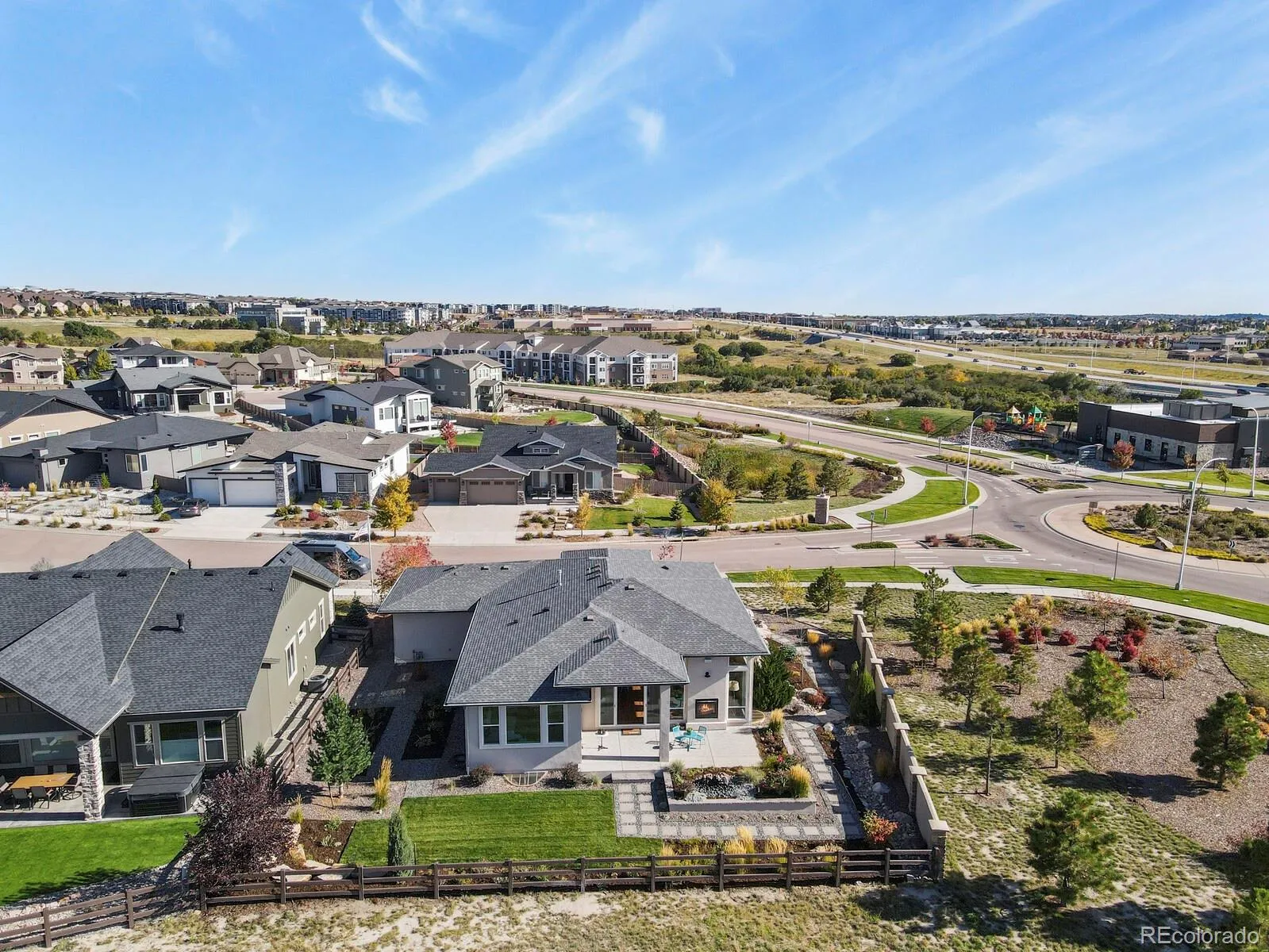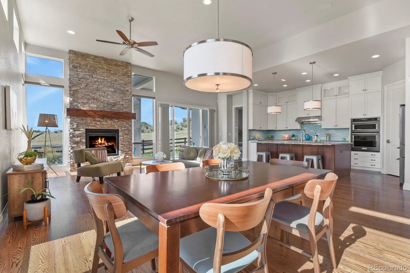 This Saddletree semi-custom home on a corner lot in the sought after Cordera neighborhood has beautiful views of Pikes Peak, Air Force Academy, & the front-range! This ranch level home features four bedrooms, three bathrooms, & a three- car garage. The open floor plan with high ceilings, seamlessly connects the living, dining & kitchen areas, creating the perfect space for both relaxing & entertaining. Meticulously cared for, this home has stunning hardwood floors & an abundance of natural light that pours in from the floor- to-ceiling windows. Enjoy Pikes Peak sunsets from the comfort of your living room & cold nights in front of the stunning floor- to- ceiling stone gas fireplace. Double sliding glass doors lead to the immaculately cared for private backyard, extending your living space & offering additional scenic views of the open space behind the home. The custom kitchen boasts a leathered granite island, quartz countertops, glass front cabinets with interior lighting, soft- close cabinets/drawers, modern tile backsplash, stainless steel hood, pantry & top of the line Kitchen-Aid appliances. A main- level primary bedroom has an adjoining spa bathroom with double vanity, marble countertops, tile flooring, linen closet & a large walk-in closet that leads to the main level laundry/mudroom The over-sized lower level family room has a full wet-bar with modern finishes & refrigerator, two additional bedrooms & a full bathroom. Bonus- additional unfinished space allows for a 5th bedroom & additional bath. The covered backyard entertaining space has a custom stone water feature, a double-sided gas fireplace, stone walkways, elevated flower beds, & a lush lawn. Upgrades include: interior/exterior surround sound, custom stone window wells, gas line for grill, 220 electrical in garage, sink in laundry room, automatic/smart blinds, & modern lighting throughout. Home adjacent to extensive trail systems, neighborhood parks, community center/ pool, & D20 schools. A must see!
