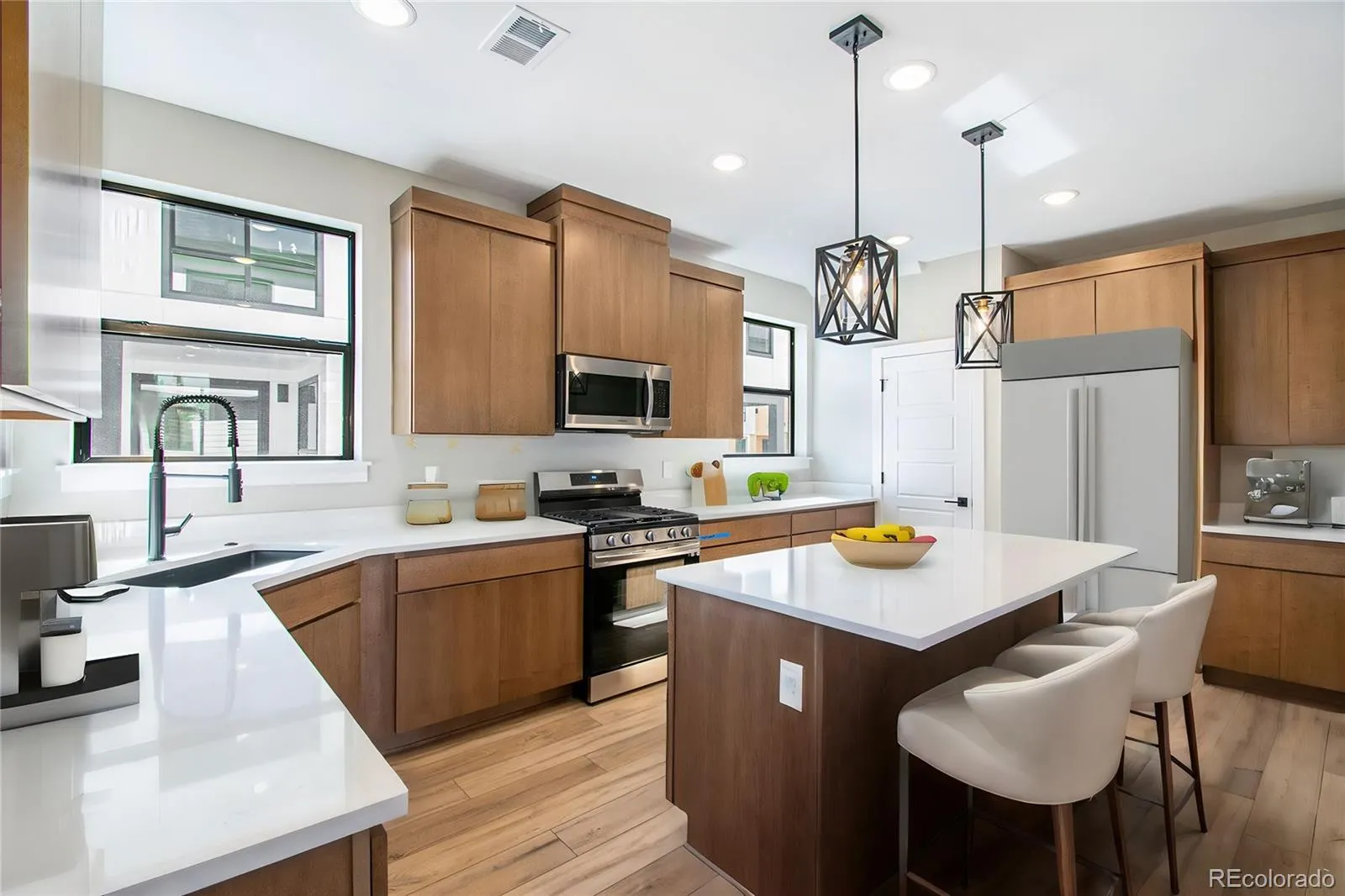Experience the perfect combination of style and versatility with the Taylor at The Hub at Virginia Village, our most popular floorplan with only a handful remaining in the project. This stunning end-cap row home offers extra natural light and mountain views. This home is under construction and expected to be ready for an October move-in. The Taylor’s inspired layout is perfect for multi-generational living, featuring a private guest suite on the lower level complete with a bedroom, en-suite bath, sitting area, kitchenette, and laundry. The main floor boasts an open-concept great room, a chef’s kitchen with a walk-in pantry, and a dining area leading to a spacious patio. Upstairs, enjoy two guest bedrooms, a full bath, and a luxurious master suite with a walk-in closet and spa-like shower. Located in vibrant central Denver, this home offers easy access to Cherry Creek, downtown, and the community’s premium amenities, including a dog walking trail, picnic park, and more. Don’t miss your chance to own this exceptional home in the heart of it all! Please note: Home is under construction. Images shown are of a different home with the same floorplan; finishes will match the Telluride package shown in the final image.*Please note that the images show a different unit with the same floorplan.