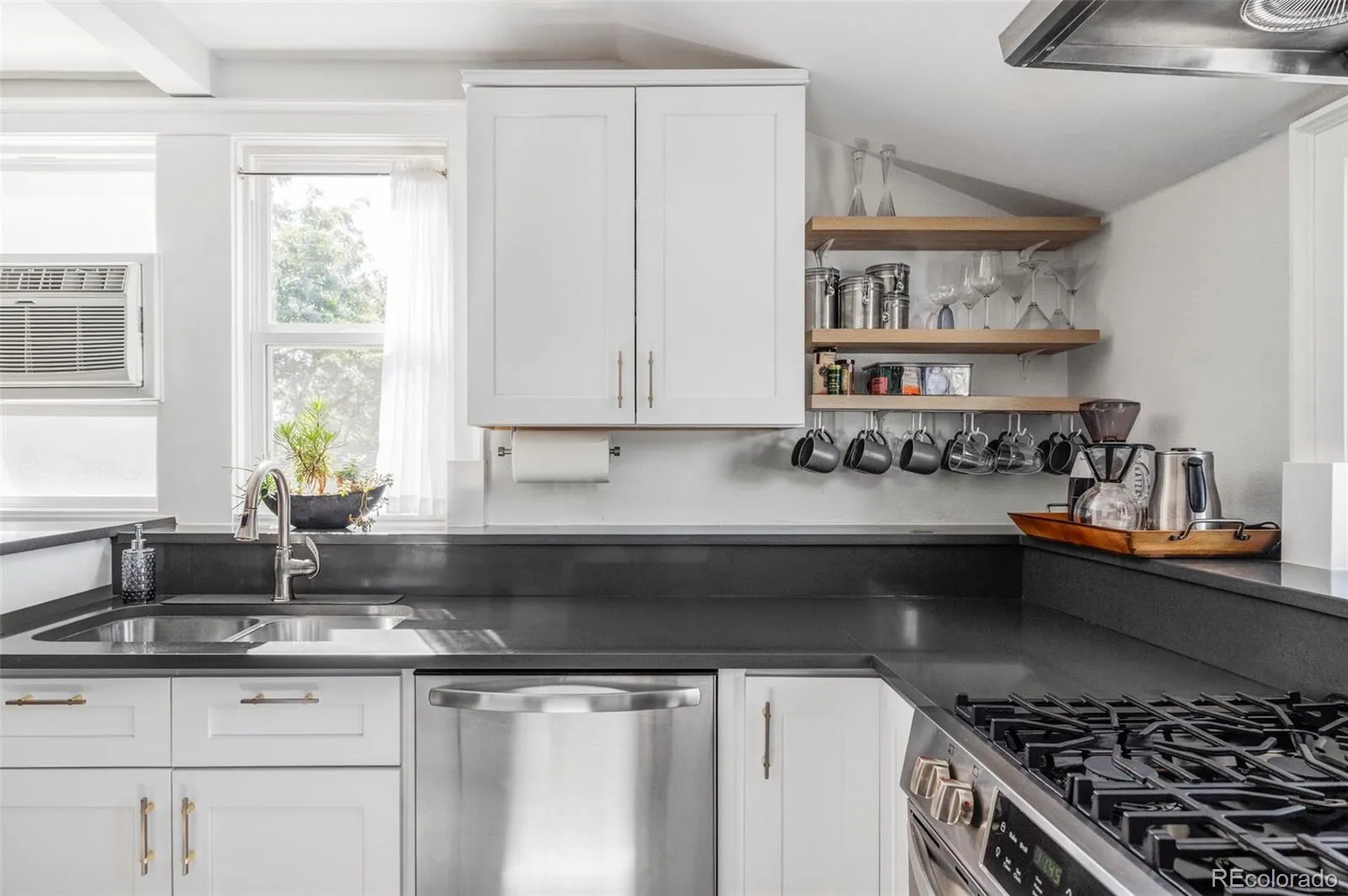Experience the best of Denver living in this stylish condo, perfectly situated in the historic Waldron Bonfills mansion in Capitol Hill. Originally built in 1896 and fully renovated in 2018, this residence blends timeless architectural charm with modern updates. Step inside to tall ceilings and abundant natural light pouring through large windows. With only one shared wall, this corner unit offers rare privacy and treetop views in a central location. The open layout flows seamlessly between the living, dining, and kitchen areas, creating a bright, welcoming space ideal for both daily living and entertaining. The kitchen is updated with stainless steel appliances, a gas range, plentiful cabinetry with soft-close doors, and sleek finishes. An oversized eat-in bar seats three to four people, perfect for casual meals, socializing, or working from home. The spacious bedroom includes two closets with a custom-designed organization system, while the refreshed bathroom features newer fixtures and classic tile throughout. A versatile sunroom adds flexibility for a home office, reading nook, workout area, or guest space. Practical perks include a deeded parking space and personal storage unit—rare finds in Capitol Hill. Laundry facilities are located on the first floor, free to use, and shared with only three other units.