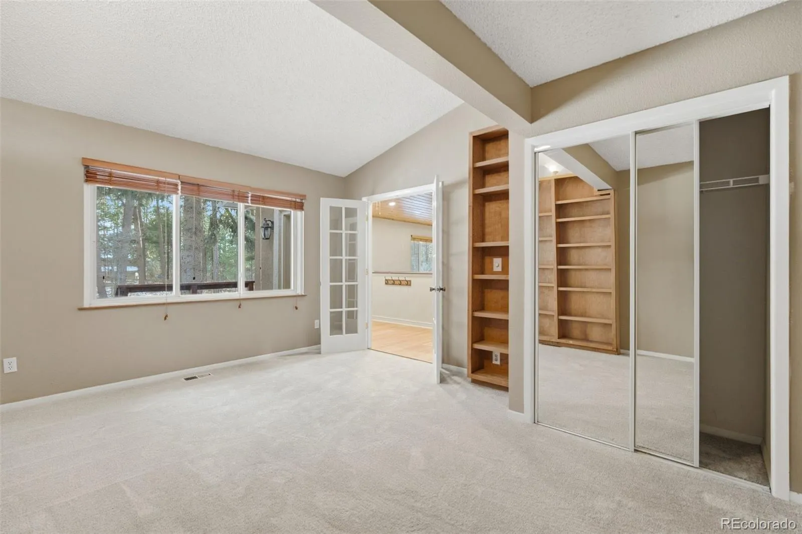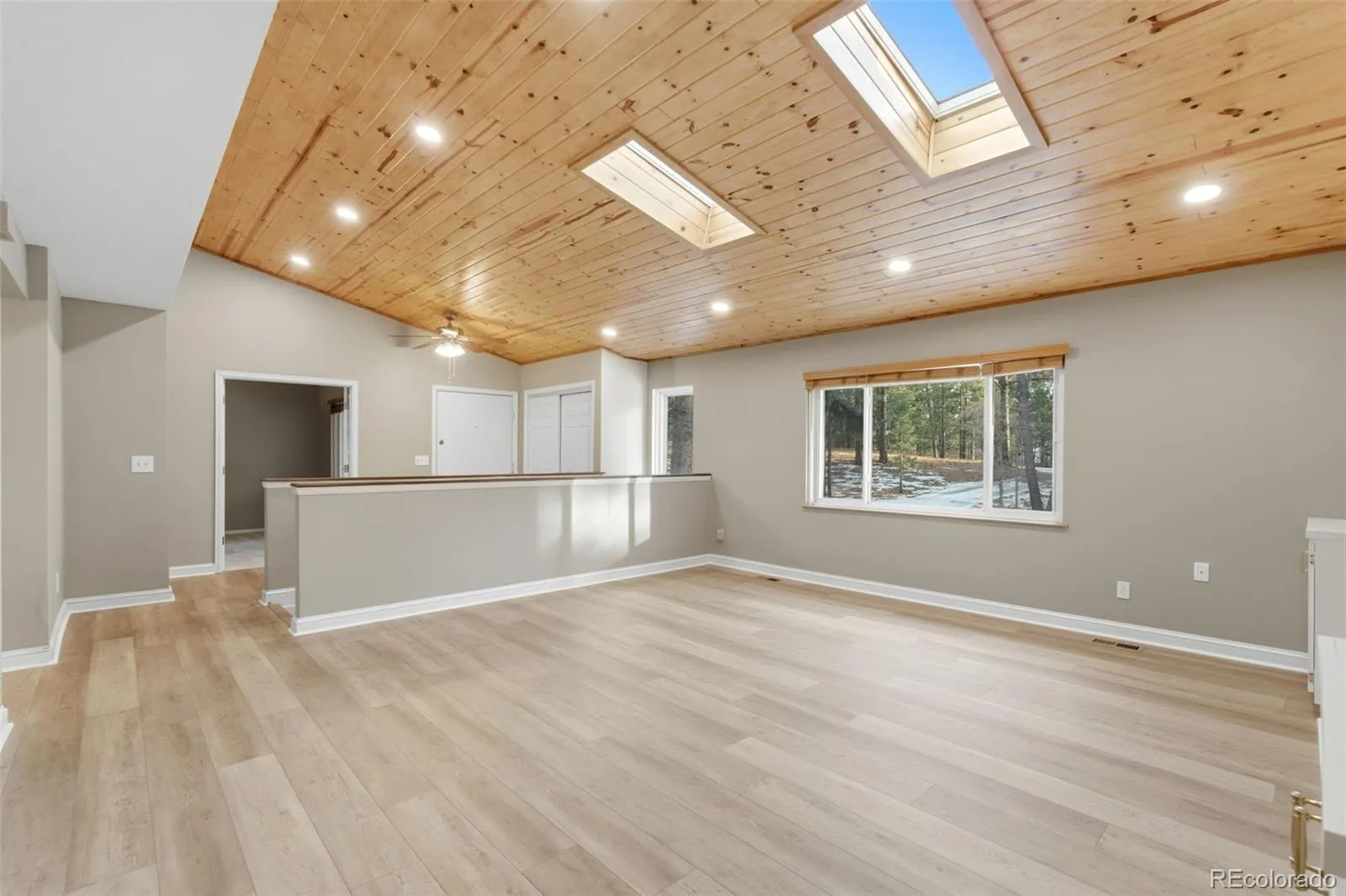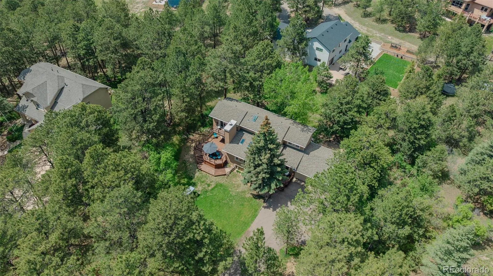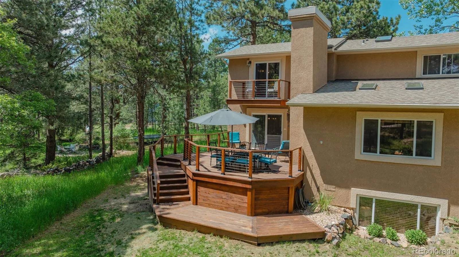 Nestled on a private 0.64-acre wooded lot surrounded by towering ponderosa pines, this 5-bedroom, 3-bath two-story home is vacant, refreshed, and move-in ready. Vaulted tongue-and-groove pine ceilings and a striking brick fireplace with built-in shelving create an inviting Colorado mountain atmosphere. Recent updates include brand-new carpet throughout, new vinyl flooring, new roof, and freshly stained 1,000+ sq ft redwood decking.