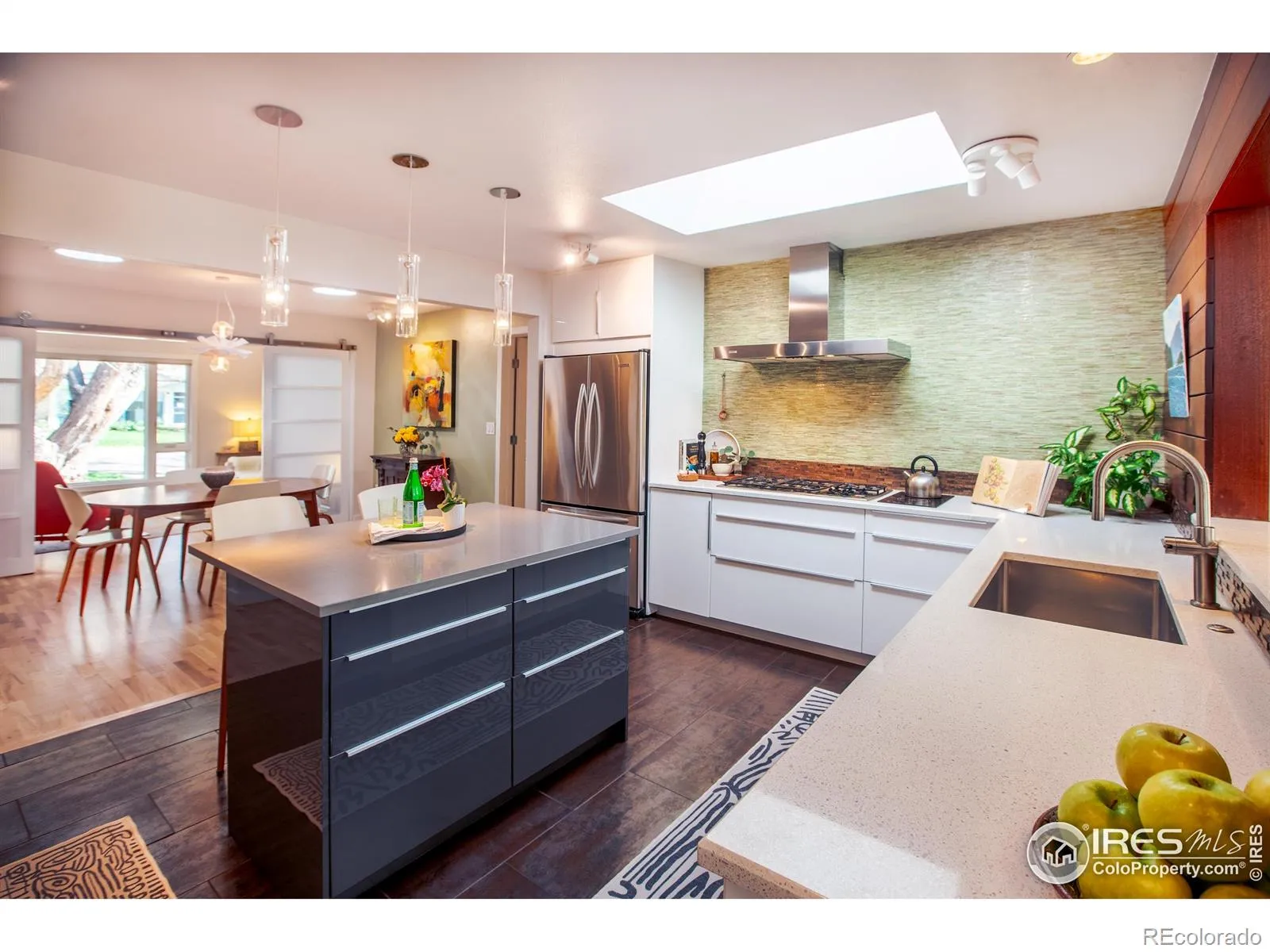 This stylishly renewed and expanded Newlands Ranch has charm at every turn. Remodeled by designer owner with many creative touches making for a warm, elevated feel. Graceful, private entry leads to open living area with skylights and windows out to the gorgeous exterior surroundings. Form and function are on display in the chef’s kitchen with 5 burner gas range, Schott Ceran inductive burners, Elkay single bay sink, quartz counters, pantry + abundant cabinet storage, exotic Batu wood accent wall & gorgeous decorative tile, all making cooking a joy. Vaulted living room addition brings the outdoors in with with floor to ceiling windows on 3 sides and is anchored by a gorgeous fireplace with decorative tile and Batu accents. Updated primary bedroom with views of the outdoor gathering areas and gardens, his and hers storage wall, and fully renovated 5 piece bath with freestanding tub & Batu paneling accents. Peaceful morning room with barn-style doors looks out to the monumental Maple tree towering over the front yard attracting a community of local bird life. Each bedroom has it’s own remodeled bathroom. Inspired designer lighting in every room. Step out the glass living room door to a backyard oasis. Stunning Batu deck system includes a dining area with fireplace and connected lounging deck that looks out to a gloriously landscaped yard with a garden fountain flowing into a babbling stream and pool – all of which recirculates to create a calming murmur of moving water. Walk across the bridge to the inviting grassy yard lushly landscaped with all the colors of each season. Artfully designed cedar fence creates privacy and accentuates the natural foothills view. New roof with solar panels. There is no wasted space in this house and every inch has been touched with artistic quality & bonus: it is all on one level! Just 3 blocks from access to all the trails of Mt. Sanitas and minutes to Ideal Market, Beleza Coffee, Santo, North Boulder Rec Center and North Boulder Park.