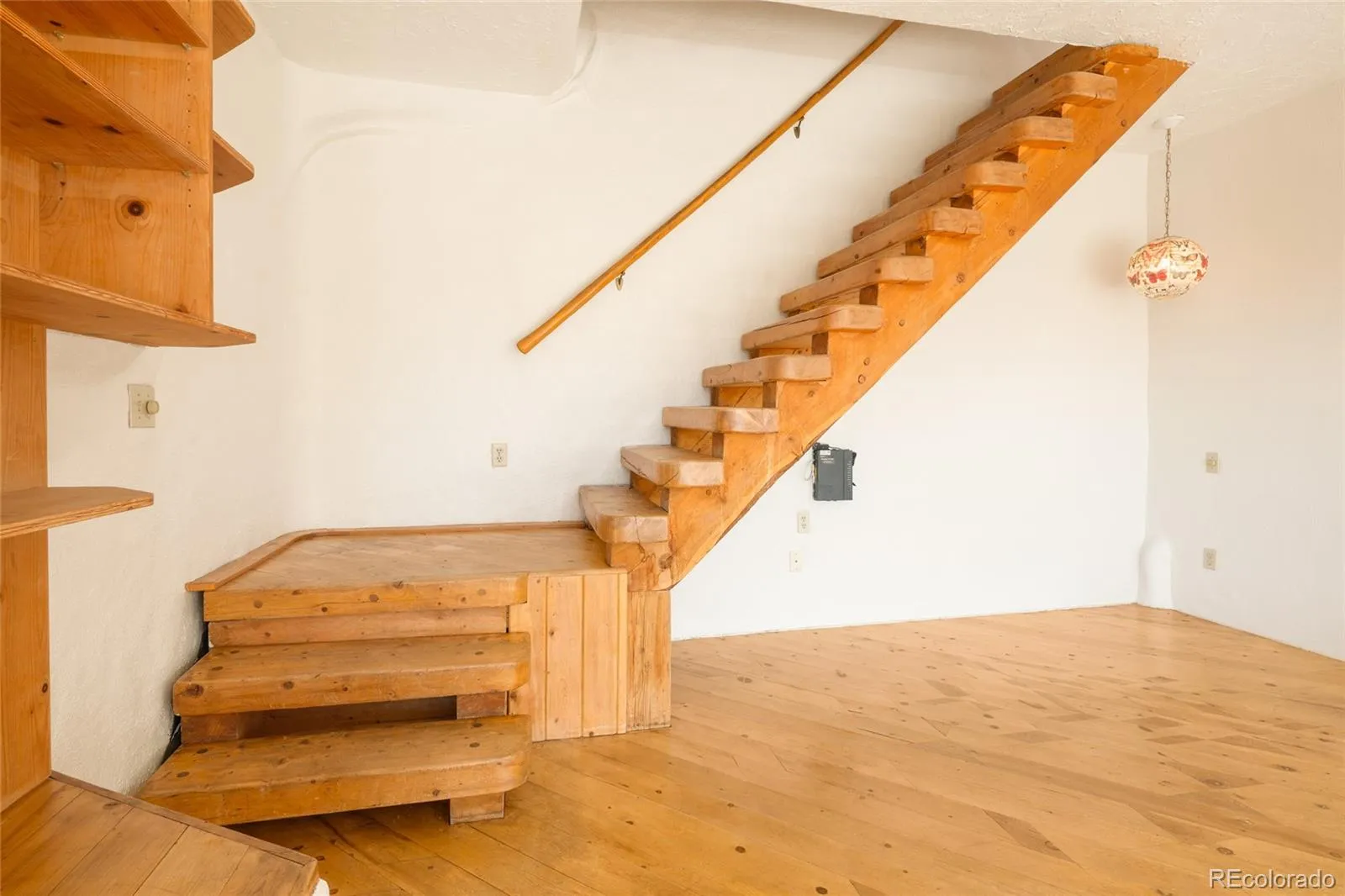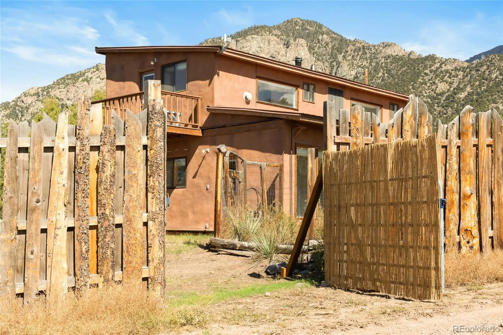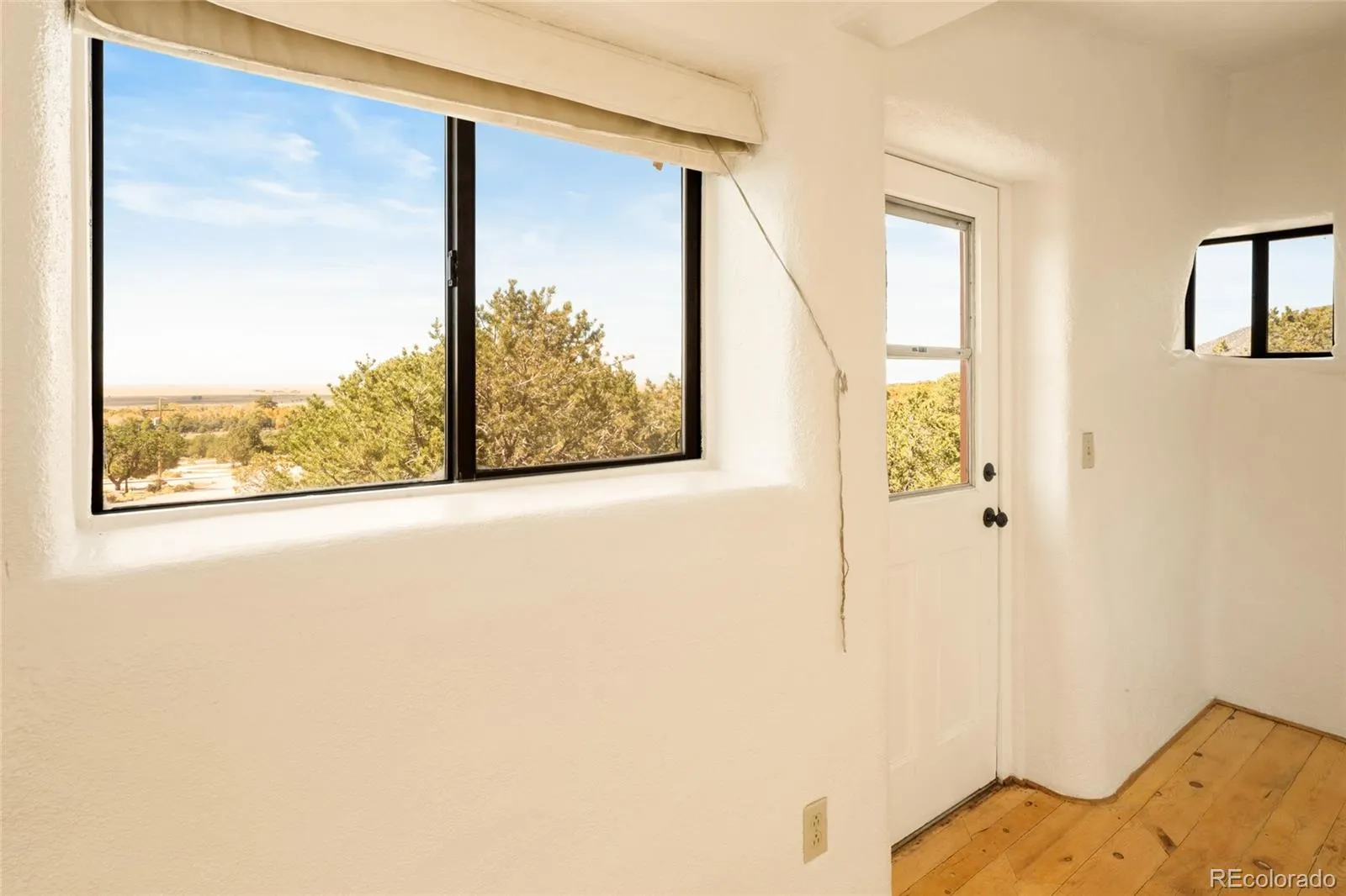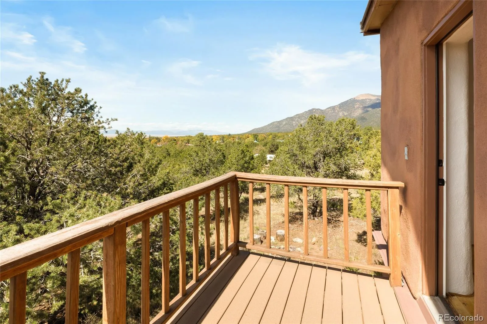 Situated on a beautiful .98 acre treed parcel in the Town of Crestone, this 2 bed/1.5 ba light filled home is Priced to Sell! Lovingly built by local artist Roy Gould, his craftsmanship is displayed in beautiful and meticulously designed wood floors gracing both upstairs and down, while unique sculpted wall elements peek out whimsically throughout the space. Downstairs features an enclosed mudroom, a spacious kitchen with attached laundry closet (and a new dryer), full bath with new toilet. The Sun Room’s slate floor, floor drain and huge south facing windows make is a perfect space to grow plants all year, and provide ample passive solar gain in the winter to help heat the house. The living room includes multiple built in features around the wood stove, back stairs and floor for storage, and air ducts are ingeniously placed throughout this space into the second floor to encourage air flow and heat exchange. Upstairs, the first bedroom doubled as an art studio, so a large wash basin is tucked in the corner to wash any size brush or art implement. The attached balcony is planked with synthetic wood for years of sustained use, and faces the valley and expansive skies, as well as the gardens below. The second bedroom includes both a sink and a water closet in the space, and beautiful mountain views from the perimeter windows. A small detached studio provides two additional rooms for storage or art-creation, and double as a water storage/pump house. Huge outdoor areas for gardening, and the majority of the lot remains untouched, perfect for further expansion or a garage/shop. Walk two blocks for groceries, the hardware store, and shops. Across the street from the Crestone Charter School, and a 5 minute drive to the trailhead for stunning mountain hikes. Come discover the beautiful and secluded town of Crestone for your mountain retreat! Check out the Matterport tour or schedule a tour in person to experience the house today!