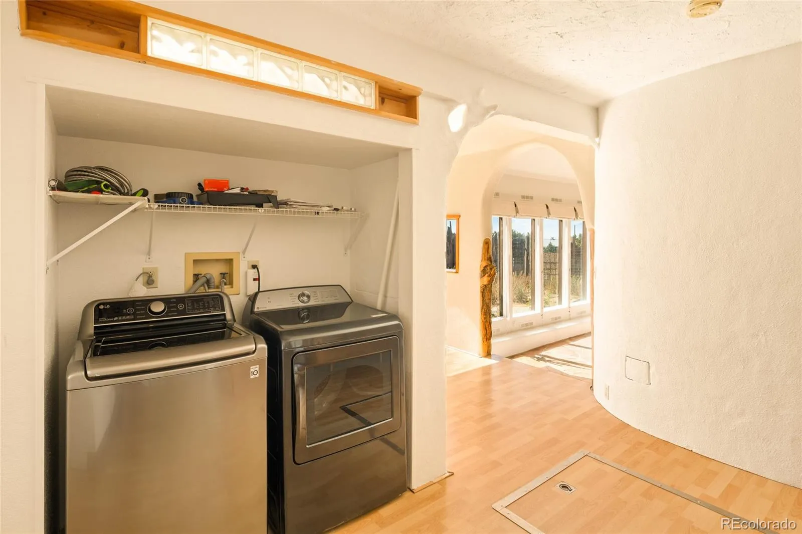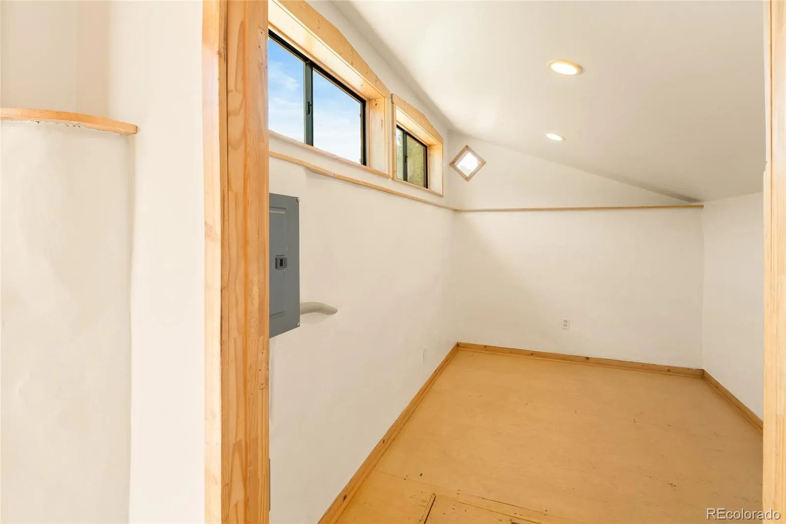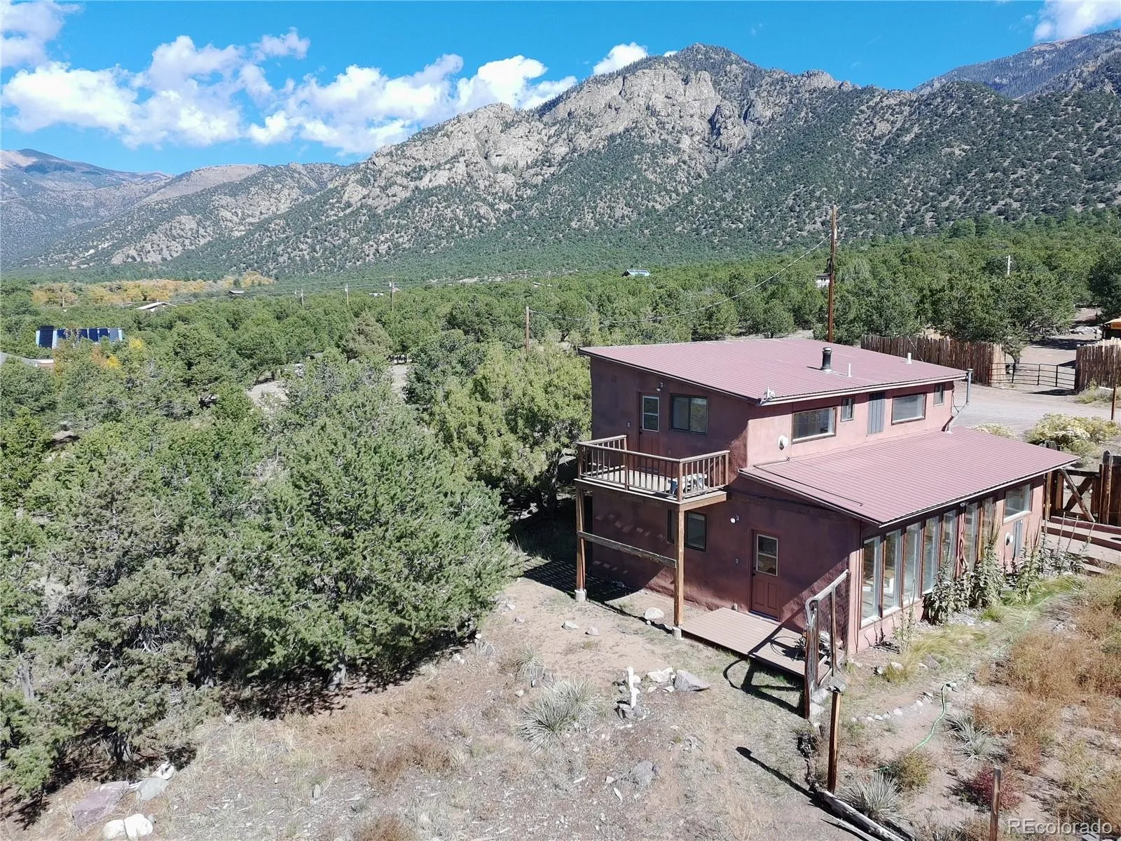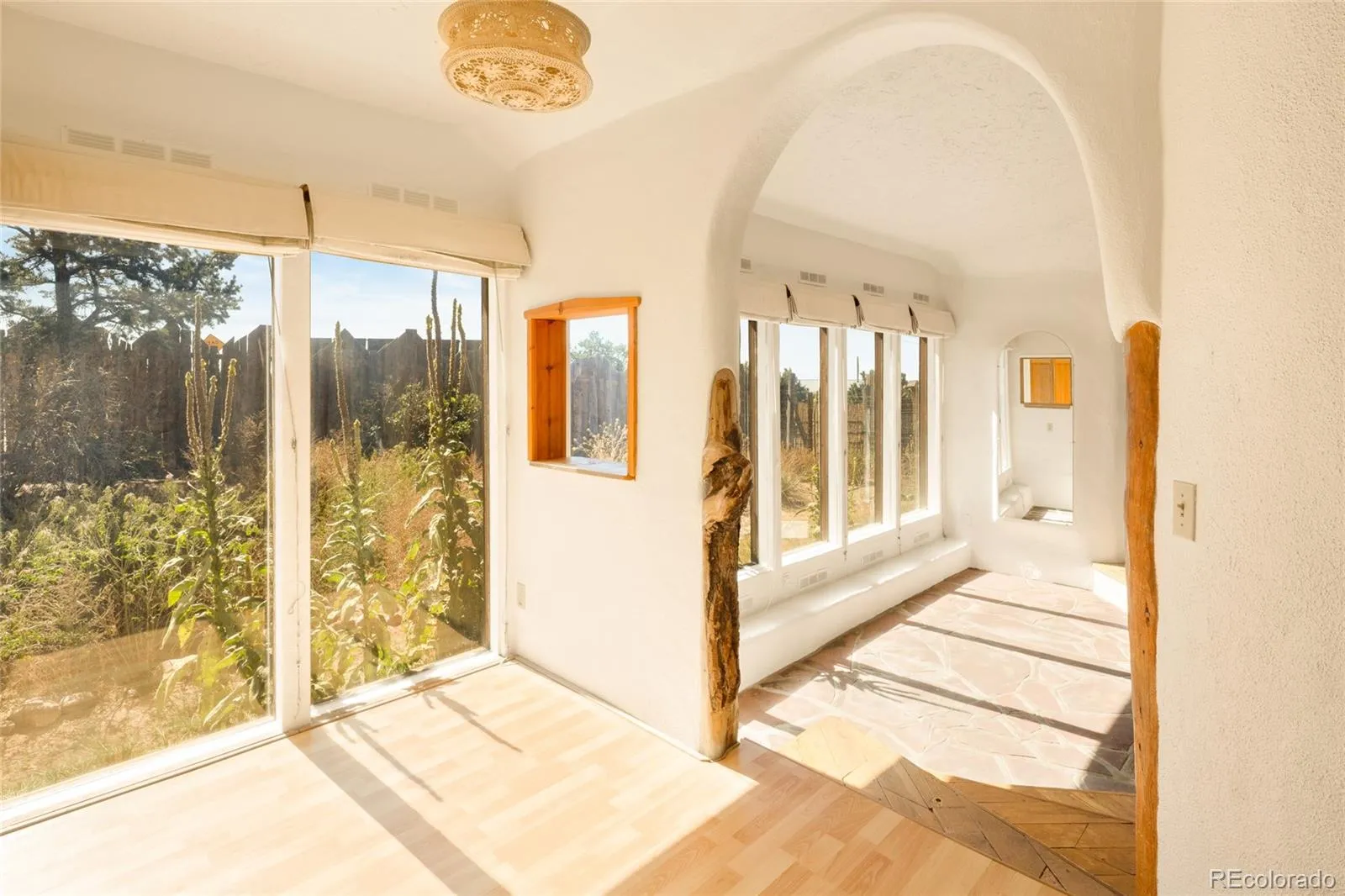 Situated on a beautiful .98 acre treed parcel in the Town of Crestone, this 2 bed/1.5 ba light filled home is Priced to Sell! Lovingly built by local artist Roy Gould, his craftsmanship is displayed in beautiful and meticulously designed wood floors gracing both upstairs and down, while unique sculpted wall elements peek out whimsically throughout the space. Downstairs features an enclosed mudroom, a spacious kitchen with attached laundry closet (and a new dryer), full bath with new toilet. The Sun Room’s slate floor, floor drain and huge south facing windows make is a perfect space to grow plants all year, and provide ample passive solar gain in the winter to help heat the house. The living room includes multiple built in features around the wood stove, back stairs and floor for storage, and air ducts are ingeniously placed throughout this space into the second floor to encourage air flow and heat exchange. Upstairs, the first bedroom doubled as an art studio, so a large wash basin is tucked in the corner to wash any size brush or art implement. The attached balcony is planked with synthetic wood for years of sustained use, and faces the valley and expansive skies, as well as the gardens below. The second bedroom includes both a sink and a water closet in the space, and beautiful mountain views from the perimeter windows. A small detached studio provides two additional rooms for storage or art-creation, and double as a water storage/pump house. Huge outdoor areas for gardening, and the majority of the lot remains untouched, perfect for further expansion or a garage/shop. Walk two blocks for groceries, the hardware store, and shops. Across the street from the Crestone Charter School, and a 5 minute drive to the trailhead for stunning mountain hikes. Come discover the beautiful and secluded town of Crestone for your mountain retreat! Check out the Matterport tour or schedule a tour in person to experience the house today!